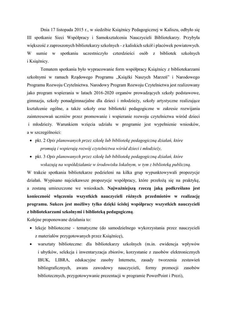Dnia 17 listopada 2015 r., w siedzibie Książnicy Pedagogicznej w Kaliszu, odbyło się III spotkanie Sieci Współpracy i Samokształcenia Nauczycieli Bibliotekarzy. Przybyła większość z zaproszonych bibliotekarzy szkolnych - z kaliskich szkół i placówek powiatowych. W sumie w spotkaniu uczestniczyło czterdzieści osób z bibliotek szkolnych i Książnicy. Tematem spotkania było wypracowanie form współpracy Książnicy z bibliotekarzami szkolnymi w ramach Rządowego Programu „Książki Naszych Marzeń” i Narodowego Programu Rozwoju Czytelnictwa. Narodowy Program Rozwoju Czytelnictwa jest realizowany jako program wspierania w latach 2016-2020 organów prowadzących szkoły podstawowe, gimnazja, szkoły ponadgimnazjalne dla dzieci i młodzieży, szkoły artystyczne realizujące kształcenie ogólne, a także szkoły oraz biblioteki pedagogiczne w zakresie rozwijania zainteresowań uczniów przez promowanie i wspieranie rozwoju czytelnictwa wśród dzieci i młodzieży. Warunkiem wzięcia udziału w programie jest wypełnienie wniosków, a w szczególności: pkt. 2 Opis planowanych przez szkołę lub bibliotekę pedagogiczną działań, które promują i wspierają rozwój czytelnictwa wśród dzieci i młodzieży, pkt. 3 Opis planowanych przez szkołę lub bibliotekę pedagogiczną działań, które wskazują na współdziałanie w środowisku lokalnym, w tym z biblioteką publiczną. W trakcie spotkania bibliotekarze podzieleni na kilka grup wypunktowywali propozycje działań. Wypisano najciekawsze propozycje współpracy, które przełożą się na praktykę, a zostaną umieszczone we wnioskach. Najważniejszą rzeczą jaką podkreślano jest konieczność włączenia wszystkich nauczycieli różnych przedmiotów w realizację programu. Sukces jest możliwy tylko dzięki ścisłej współpracy wszystkich nauczycieli z bibliotekarzami szkolnymi i biblioteką pedagogiczną. Kolejne proponowane działania to: lekcje biblioteczne - tematyczne (do samodzielnego wykorzystania przez nauczycieli z materiałów przygotowanych przez Książnicę), warsztaty biblioteczne: dla bibliotekarzy szkolnych (m.in. ewidencja wpływów i ubytków, selekcja i inwentaryzacja zbiorów, korzystanie z zasobów elektronicznych IBUK, LIBRA, bibliograficznych, edukacyjne awans zasoby zawodowy Internetu, nauczycieli, zasady formy tworzenia zestawień promocji bibliotecznych, przygotowywanie prezentacji w programie PowerPoint i Prezi), zasobów warsztaty dla nauczycieli (korzystanie z zasobów elektronicznych IBUK, LIBRA, edukacyjne zasoby Internetu, zasady tworzenia zestawień bibliograficznych, awans zawodowy nauczycieli, przygotowywanie prezentacji PowerPoint i Prezi), warsztaty dla dzieci i młodzieży (wycieczki do siedziby KP, korzystanie z zasobów biblioteki, wyszukiwanie informacji), spotkania autorskie na terenie biblioteki, w szkole lub w bibliotece publicznej, Punkt Biblioteczny (wypożyczenie do biblioteki szkolnej pakietu książek dla nauczycieli z zakresu literatury metodycznej i beletrystyki), wystawy tematyczne przygotowane przez pracowników biblioteki (ekspozycja na terenie szkoły), konkursy (pomoc w zorganizowaniu konkursów – przygotowywanie materiałów), wieczór w bibliotece (głośne czytanie książek, gawędy o książkach, seanse filmowe adaptacji literatury polskiej i światowej), pedagogizacja rodziców (udział w zebraniach rodziców, promowanie czytelnictwa, rekomendowanie ciekawych książek), tematyczne gry miejskie (organizowane wspólnie z nauczycielami języka polskiego, matematyki czy wychowania fizycznego), Forum Dobrej Książki - książki rekomendowane (utworzenie na stronie KP propozycji książek polecanych przez uczniów dla uczniów, przez nauczycieli dla uczniów i inne). Jednogłośnie stwierdzono, że wszystkie te działania mają na celu aktywne zaangażowanie środowiska nauczycielskiego w rozwój i promowanie czytelnictwa wśród dzieci i młodzieży oraz rodziców. Druga część spotkania odbyła się w Internetowym Centrum Multimedialnym, gdzie uczestnicy zapoznali się ze stroną internetową Książnicy Pedagogicznej i dowiedzieli się, jak wykorzystać informacje i bazy danych w swojej pracy. Wyłonione obszary współpracy wyznaczają kierunki działań Książnicy i bibliotek szkolnych na najbliższe miesiące we wspieraniu rozwoju czytelnictwa dzieci i młodzieży.