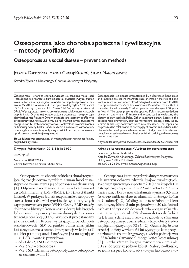Dardzińska Hygeia Public J i Health wsp. Osteoporoza 2016, 51(1):jako 23-30 choroba społeczna i cywilizacyjna – metody profilaktyki 23 Osteoporoza jako choroba społeczna i cywilizacyjna – metody profilaktyki Osteoporosis as a social disease – prevention methods Jolanta Dardzińska, Hanna Chabaj-Kędroń, Sylwia Małgorzewicz Katedra Żywienia Klinicznego, Gdański Uniwersytet Medyczny Osteoporoza – choroba charakteryzująca się zaniżoną masą kości i zaburzoną mikroarchitekturą szkieletu, zwiększa ryzyko złamań kości, a konsekwencji często prowadzi do niepełnosprawności lub zgonu. W 2010 r. w krajach UE osteoporoza dotyczyła 22 mln kobiet i 5,5 mln mężczyzn, w tym blisko 2 mln Polaków, którzy przekroczyli 50 r.ż. W pracy przedstawiono zaktualizowane polskie normy spożycia wapnia i wit. D oraz najnowsze badania oceniające spożycie tego pierwiastka przez Polaków. Omówiono także inne istotne w profilaktyce osteoporozy czynniki żywieniowe, jak np. magnez, kwasy tłuszczowe omega-3, wit. K i izoflawonoidy sojowe. Podkreślono również związek nadmiernej podaży białka i sodu w diecie z rozwojem osteoporozy oraz ciągle niedocenianą rolę aktywności fizycznej w budowaniu i podtrzymaniu właściwej masy kostnej. Słowa kluczowe: osteoporoza, choroba społeczna, niska masa kostna, profilaktyka, żywienie Osteoporosis is a disease characterized by a decreased bone mass and impaired skeletal microarchitecture, increasing the risk of bone fractures and in consequence often leading to disability or death. In 2010 osteoporosis affected 22 million women and 5.5 million men in the EU countries, including nearly 2 million people over the age of 50 years in Poland. The paper presents the updated Polish recommendations of calcium and vitamin D intake and recent studies evaluating the dietary calcium intake in Poles. Other important dietary factors in the osteoporosis prevention, such as magnesium, omega-3 fatty acids, vitamin K and soy isoflavones were also discussed. The paper also emphasizes the relationship of oversupply of protein and sodium in the diet with the development of osteoporosis. Finally, the article refers to the still underestimated role of physical activity in building and maintaining proper bone mass. Key words: osteoporosis, social disease, low bone density, prevention, diet © Hygeia Public Health 2016, 51(1): 23-30 Adres do korespondencji / Address for correspondence www.h-ph.pl dr n. med. Jolanta Dardzińska Katedra Żywienia Klinicznego, Gdański Uniwersytet Medyczny ul. Dębinki 7, 80-211 Gdańsk tel. 660 08 22 99, e-mail: [email protected] Nadesłano: 08.09.2015 Zakwalifikowano do druku: 06.03.2016 Osteoporoza, to choroba szkieletu charakteryzująca się zwiększonym ryzykiem złamań kości w następstwie zmniejszenia jej odporności mechanicznej [1]. Odporność mechaniczna zależy od zarówno od gęstości mineralnej kości (BMD), jak i jakości tkanki kostnej. W praktyce jednak rozpoznanie osteoporozy stawia się na podstawie kryteriów densytometrycznych zaproponowanych przez WHO. Oceny BMD należy dokonać w bliższym końcu kości udowej lub kręgach lędźwiowych za pomocą dwuwiązkowej absorpcjometrii rentgenowskiej (DXA). Wynik jest przedstawiany jako wskaźnik T (T-score) wyrażający liczbę odchyleń standardowych (SD) od punktu odniesienia, jakim jest szczytowa masa kostna. Interpretacja wskaźnika T u kobiet po menopauzie i mężczyzn jest następująca: –>-1 SD – wartość prawidłowa –od -1 do -2,5 SD – osteopenia –<-2,5 SD – osteoporoza – <-2,5 SD i złamanie osteoporotyczne – osteoporoza zaawansowana [1]. Osteoporoza jest niewątpliwie dużym wyzwaniem dla systemu ochrony zdrowia krajów rozwiniętych. Według najnowszego raportu z 2010 r. w krajach UE osteoporozę rozpoznano u 22 mln kobiet i 5,5 mln mężczyzn, a liczba nowych złamań wynosiła 3,5 mln (z czego najliczniejsze to złamania bliższego końca kości udowej) [2]. Według autorów w Polsce problem ten dotyczy blisko 2 mln pacjentów po 50 r.ż. Pośród nich aż 168 tys. osób doświadczyło w ciągu roku złamania, w tym ponad 60% złamań dotyczyło kobiet [2]. Istnieją dane szacunkowe, że globalnie złamania osteoporotycznego dozna jedna na trzy kobiety i jeden na pięciu mężczyzn po 50 r.ż. [2]. Ocenia się, że u co trzeciej kobiety w wieku 65 lat występuje kompresyjne złamanie trzonu kręgowego, a wieku późniejszym u 33% kobiet złamanie bliższego końca kości udowej [3]. Liczba złamań kręgów rośnie z wiekiem i ok. 80 r.ż. dotyczy aż połowy kobiet. Należy podkreślić, że jedna na pięć kobiet z objawowym lub bezobjawo- 24 wym złamaniem trzonu kręgowego dozna złamania kolejnego kręgu w ciągu najbliższego roku [4]. Wystąpienie złamania osteoporotycznego wiąże się z ogromnym bólem i cierpieniem, może prowadzić do kalectwa, a nawet śmierci – dotyczy to szczególnie złamań bliższego końca kości udowej. Szacuje się, że wśród pacjentów, u których doszło do złamania szyjki kości udowej, aż 10-20% umiera w pierwszym roku od wystąpienia złamania [4]. W Polsce w 2010 r. odnotowano ponad 2300 przypadków zgonów będących następstwem złamania osteoporotycznego [2]. Problem, jakim jest osteoporoza, nasila się w związku z tym, że społeczeństwa większości krajów rozwiniętych, w tym UE, starzeją się. W Polsce populacja osób powyżej 50 r.ż. ma wzrosnąć z 13,4 mln w 2010 r. do 14,7 mln w 2025 r. – a więc o 10%. Liczba złamań zwiększy się prawdopodobnie o 25%. Przewiduje się, że koszt leczenia osteoporozy wzrośnie z 593 mln € wydanych w 2010 r. do 753 mln € w 2025 r., czyli o 27% [2]. Dane te dotyczą tylko złamań dokonanych oraz farmakologicznego zapobiegania kolejnym złamaniom – nie uwzględniają natomiast ogromnych kosztów społecznych, jakie niesie za sobą konieczność przewlekłej opieki nad unieruchomionym członkiem rodziny. W celu zwiększenia ef