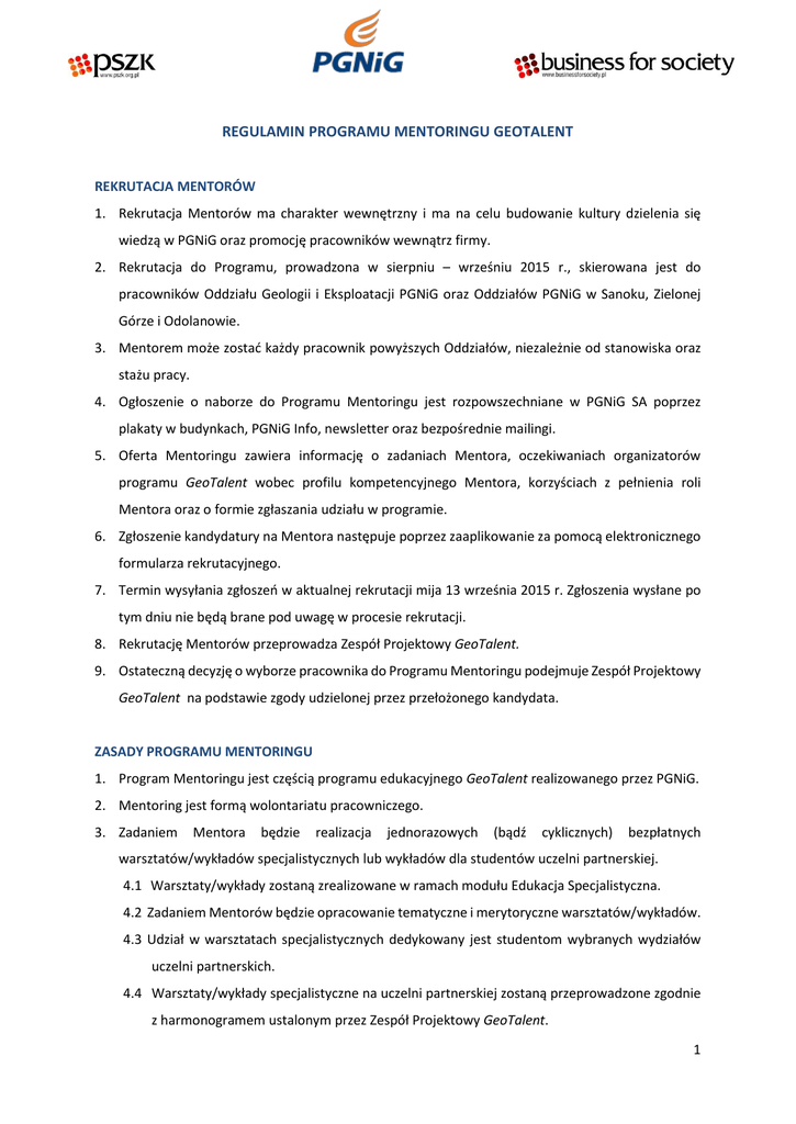 REGULAMIN PROGRAMU MENTORINGU GEOTALENT REKRUTACJA MENTORÓW 1. Rekrutacja Mentorów ma charakter wewnętrzny i ma na celu budowanie kultury dzielenia się wiedzą w PGNiG oraz promocję pracowników wewnątrz firmy. 2. Rekrutacja do Programu, prowadzona w sierpniu – wrześniu 2015 r., skierowana jest do pracowników Oddziału Geologii i Eksploatacji PGNiG oraz Oddziałów PGNiG w Sanoku, Zielonej Górze i Odolanowie. 3. Mentorem może zostać każdy pracownik powyższych Oddziałów, niezależnie od stanowiska oraz stażu pracy. 4. Ogłoszenie o naborze do Programu Mentoringu jest rozpowszechniane w PGNiG SA poprzez plakaty w budynkach, PGNiG Info, newsletter oraz bezpośrednie mailingi. 5. Oferta Mentoringu zawiera informację o zadaniach Mentora, oczekiwaniach organizatorów programu GeoTalent wobec profilu kompetencyjnego Mentora, korzyściach z pełnienia roli Mentora oraz o formie zgłaszania udziału w programie. 6. Zgłoszenie kandydatury na Mentora następuje poprzez zaaplikowanie za pomocą elektronicznego formularza rekrutacyjnego. 7. Termin wysyłania zgłoszeń w aktualnej rekrutacji mija 13 września 2015 r. Zgłoszenia wysłane po tym dniu nie będą brane pod uwagę w procesie rekrutacji. 8. Rekrutację Mentorów przeprowadza Zespół Projektowy GeoTalent. 9. Ostateczną decyzję o wyborze pracownika do Programu Mentoringu podejmuje Zespół Projektowy GeoTalent na podstawie zgody udzielonej przez przełożonego kandydata. ZASADY PROGRAMU MENTORINGU 1. Program Mentoringu jest częścią programu edukacyjnego GeoTalent realizowanego przez PGNiG. 2. Mentoring jest formą wolontariatu pracowniczego. 3. Zadaniem Mentora będzie realizacja jednorazowych (bądź cyklicznych) bezpłatnych warsztatów/wykładów specjalistycznych lub wykładów dla studentów uczelni partnerskiej. 4.1 Warsztaty/wykłady zostaną zrealizowane w ramach modułu Edukacja Specjalistyczna. 4.2 Zadaniem Mentorów będzie opracowanie tematyczne i merytoryczne warsztatów/wykładów. 4.3 Udział w warsztatach specjalistycznych dedykowany jest studentom wybranych wydziałów uczelni partnerskich. 4.4 Warsztaty/wykłady specjalistyczne na uczelni partnerskiej zostaną przeprowadzone zgodnie z harmonogramem ustalonym przez Zespół Projektowy GeoTalent. 1 4.5 Harmonogram warsztatów/wykładów obejmie dwa semestry roku akademickiego 2015/2016. 4.6 W celu realizacji warsztatów na uczelni partnerskiej zostanie zapewniona co najmniej 30osobowa sala na co najmniej cztery godziny zegarowe, w przedziale czasowym 9:00 – 20:00. 4.7 Na 3 tygodnie przed planowanym terminem realizacji warsztatu Mentor powinien przedstawić Zespołowi Projektowemu wypełnioną kartę warsztatu. 4.8 Sala zostanie wybrana pod kątem wielkości i wyposażenia technicznego (w tym w szczególności w rzutnik multimedialny i ekran). 4.9 Dodatkowe wyposażenie techniczne zostanie zapewnione zgodnie z wytycznymi Mentora uwzględnionymi w karcie warsztatu. 4.10 Za przygotowanie zaproszeń, promocję warsztatu, przyjmowanie potwierdzeń obecności, prowadzenie listy uczestników warsztatu oraz przygotowanie i przesłanie uczestnikom ecertyfikatów potwierdzających udział w warsztatach odpowiada Zespół Projektowy GeoTalent. 4. Zadaniem Mentora będzie, w zależności od ustalonego harmonogramu prac GeoTalent, wsparcie merytoryczne konkursu dla studentów uczelni partnerskiej (w ramach swojej dziedziny wiedzy). 5.1 Konkurs skierowany jest do studentów studiów dziennych uczelni partnerskiej, którzy chcą zweryfikować swoją wiedzę, rozwiązując zadanie praktyczne przygotowane przez Mentorów GeoTalent. Autorzy prac najlepiej ocenionych przez Mentorów, zostaną zaproszeni do finałowej rozgrywki – testu jednokrotnego wyboru z wiedzy w ramach danej dziedziny. 5.2 Mentorzy będą odpowiedzialni za przygotowanie zadania praktycznego oraz ocenę nadesłanych prac w ramach swojej dziedziny (prace zostaną podzielone do oceny proporcjonalnie dla każdego z Mentorów). 5.3 Decyzję o zakwalifikowaniu studentów do II etapu podejmą Mentorzy na bazie przygotowanego przez Zespół Projektowy GeoTalent formularza oceny prac. 5.4 Zadaniem Mentorów będzie również opracowanie testu jednokrotnego wyboru, który posłuży do wyboru zwycięzców konkursu. 5.5 Za promocję konkursu oraz zbieranie zgłoszeń odpowiada Zespół Projektowy. 5.6 Wyniki konkursu zostaną ogłoszone podczas uroczystej gali, na którą Mentorzy zostaną zaproszeni w roli ekspertów. 5. Zadaniem Mentora będzie również budowanie wizerunku PGNiG jako organizacji eksperckiej – lidera w swojej branży oraz kształtowanie świadomości studentów na temat branży E&P. 6.1 Zadaniem Mentora będzie reprezentowanie PGNiG w środowisku akademickim – wśród studentów, władz uczelni oraz kadry dydaktycznej. 2 6.2 Mentor będzie uczestniczyć w roli eksperta w wydarzeniach uczelnianych tj. seminariach i konferencjach naukowych, spotkaniach tematycznych na wybranych wydziałach, wydarzeniach realizowanych przez organizacje studenckie i koła naukowe współpracujące z PGNiG w ramach programu edukacyjnego GeoTalent. 6.3 Zadaniem Mentora będzie współpraca z kadrą akademicką wydziału np. poprzez inicjowanie i realizację wspólnych projektów badawczych i rozwojowych. 6.4 Mentor będzie miał możliwość wsparcia merytorycznego Ambasadorów programu GeoTalent i innych studentów w pisaniu prac dyplomowych i zaliczeniowych (udostępnienie materiałów, nadzór merytoryczny, skontaktowanie studenta ze specjalistą w wybranej dziedzinie). 6. Zadaniem Mentora będzie pełnienie roli eksperta w: projektowaniu wydarzeń edukacyjnych programu GeoTalent, opiniowaniu/konsultowaniu działań inicjowanych przez uczelnie partnerskie, projektowaniu programów rozwojowych dla studentów i absolwentów uczelni partnerskich oraz pracowników PGNiG. 7. Za dostarczenie wszystkich narzędzi niezbędnych do efektywnego pełnienia roli Mentora odpowiada Zespół Projektowy GeoTalent. 8. K