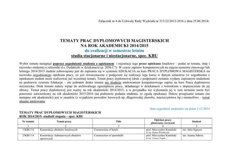 Załącznik nr 4 do Uchwały Rady Wydziału nr 313/22/2012-2016 z dnia 25.06.2014r. TEMATY PRAC DYPLOMOWYCH MAGISTERSKICH NA ROK AKADEMICKI 2014/2015 do realizacji w semestrze letnim studia stacjonarne i niestacjonarne, spec. KBU Wybór tematu następuje poprzez uzgodnienie studenta z opiekunem i rejestracji tego przez opiekuna (mailowo – podać nr tematu, imię i nazwisko studenta) u referentki d.s. Dydaktyki w dziekanacie (p. 205b C7). W czasie zapisów komputerowych na zajęcia semestru zimowego lub letniego 2014/2015 student zobowiązany jest do zapisania się w systemie EDUKACJA na kurs PRACA DYPLOMOWA MAGISTERSKA na nazwisko uzgodnionego opiekuna pracy, co jest równoznaczne z podjęciem się realizacji tego kursu w danym semestrze (w uzgodnieniu z opiekunem student może realizować już wcześniej temat). Temat pracy dyplomowej (druk z podpisami) zostanie wydany zapisanym studentom na podstawie systemu Edukacja – nie pobranie druku tematu nie skutkuje anulowaniem komputerowego zapisu na kurs Praca dyplomowa inżynierska. Druk tematu należy wpiąć do archiwalnego egzemplarza pracy, składanego w dziekanacie z wnioskiem o dopuszczenie do jej obrony. Temat pracy dyplomowej jest ważny na rok akademicki 2014/2015, a w przypadku nie wykonania jej w tym terminie może być ponownie zatwierdzony na rok akademicki 2015/2016 (na podstawie podania studenta, ze zgodą opiekuna). Dalsze przepisanie tematu (na następny rok akademicki) jest w zasadzie (z wyjątkiem powodów losowych np. długotrwałej choroby, macierzyństwa itp.) niemożliwe – temat ulegnie anulowaniu. Stan uzgodnień studentów na dzień 2.12.2014 TEMATY PRAC DYPLOMOWYCH MAGISTERSKICH ROK 2014/2015- studiaII stopnia – spec. KBU 1 1/KBU/14 2 Konstrukcje obiektów hotelowych 3 Construction of hotels Opiekun pracy planowany recenzent 4 prof. Mieczysław Kamiński 2/KBU/14 Konstrukcje kubaturowych obiektów sportowych Construction of sportshalls prof. Mieczysław Kamiński Nr tematu Temat pracy Title dr inż. Roman Wróblewski dr inż. Tomasz Trapko Student 5 inż. Julia Nguyen inż. Joanna Sabora 3/KBU/14 Żelbetowe obiekty sal koncertowych Reinforcedconcretebuildingsconcert prof. Mieczysław Kamiński inż. Katarzyna Śliwińska 4/KBU/14 Konstrukcje parkingów wielopoziomowych Construction multi-storey car parks prof. Mieczysław Kamiński inż. Paweł Niewęgłowski 5/KBU/14 Konstrukcje aquaparków Constructionswaterparks prof. Mieczysław Kamiński inż. Dawid Dziedzic 7/KBU/14 Przyczyny awarii zbiorników żelbetowych i analiza wzmocnień Wpływ zbieżności na stany naprężeń i odkształceń trzonu komina żelbetowego Analiza studialno-projektowa rozwiązań żelbetowych konstrukcji apartamentowców Causes of failures of reinforced concrete tanks and strengthening analysis Influence of convergence on stress and strain states In reinforced concrete chimney shaft Study and design analysis of structural solutions of reinforced concrete apartment buildings Design study of the cylindrical reinforced concrete petrol tank capacity of 250 m3 with use of the two coaxial chambers Design study of the reinforced concrete structure of two-storey store building area of 1800 m2 Prestressed precast tanks for water prof. Andrzej Ubysz inż. Katarzyna Wasylów 8/KBU/14 9/KBU/14 11/KBU/14 12/KBU/14 13/KBU/14 14/KBU/14 15/KBU/14 16/KBU/14 17/KBU/14 18/KBU/14 19/KBU/14 20/KBU/14 Studium projektu zagłębionego okrągłego żelbetowego zbiornika na benzynę o poj. 250 m3 z dwoma komorami współosiowymi Studium projektu żelbetowej konstrukcji dwukondygnacyjnego budynku magazynowego o powierzchni 1800 m2 Sprężone prefabrykowane zbiorniki na wodę Przekrycia powłokowe , dwukrzywiznowe Żelbetowy, monolityczny strop płaski (grzybkowy lub bezgłowicowy) w dwukondygnacyjnym budynku domu towarowego Żelbetowa komora fermentacyjna, otwarta o średnicy 15 m w oczyszczalni ścieków Stany graniczne nośności i użytkowalności strunobetonowych słupów elektroenergetycznych linii wysokich napięć Stany graniczne nośności i użytkowalności żelbetowych belek i płyt zespolonych z nadbetonem Żelbetowe budynki wysokie o konstrukcji dwupowłokowej Silosy homogenizacyjne wielokomorowe dr inż. Wojciech Pawlak dr inż. Maciej Minch dr inż. Jacek Dyczkowski dr inż. Andrzej Kmita prof. Andrzej Ubysz dr inż. Tomasz Trapko dr inż. Czesław Bywalski dr inż. Jacek Dyczkowski inż. Katarzyna Giedrojc prof. Andrzej Ubysz dr inz. Jacek Dyczkowski inż. Tomasz Błaszczyk prof. Andrzej Ubysz dr inż. Andrzej Kmita prof. Andrzej Ubysz Doublecurvetshellroofs inż. Krzysztof Marecki prof. Andrzej Ubysz dr inż. Andrzej Kmita inż. Anna Miklas inż. Bogusz Jaszczak prof. Andrzej Ubysz Reinforced concrete monolithic girderless floor in the two storey warehouse dr inż. Janusz Kubiak Reinforced concrete sludge digester 15 m diameter in the sewage treatment plant Ultimate state of load capacity and utility for prestressed concrete poles of high voltage power lines Ultimate state of load capacity and utility for reinforced concrete beams and slabs combined with a concrete overlay Reinforced concrete skyscrapers with double shell structure Homogenization silos multi-chamber drinż. JanuszKubiak prof. Andrzej Ubysz inż. Tomasz Stelmach prof. Andrzej Ubysz dr inż. Aleksy Łodo prof. Andrzej Ubysz inż. Tomasz Lewandowski dr inż. Aleksy Łodo prof. Andrzej Ubysz dr inż. Marek Maj prof. Andrzej Ubysz dr inż. Marek Maj prof. Andrzej Ubysz inż. Szymon Kobojczyk 21/KBU/14 22/KBU/14 23/KBU/14 24/KBU/14 25/KBU/14 26/KBU/14 27/KBU/14 28/KBU/14 29/KBU/14 30/KBU/14 31/KBU/14 32/KBU/14 33/KBU/14 34/KBU/14 35/KBU/14 36/KBU/14 Metoda dokładna obliczeń betonowych elementów częściowo sprężonych o przekroju pierścieniowym poddanych zginaniu Strunobetonowe wieże z betonu wirowanego dla GSM-R Kształtowanie konstrukcji budowlanych na terenach występowania szkód górniczych wobrębie LGOM Konstrukcje żelbetowe budynków kształtowanych na wstędze Mobiu
