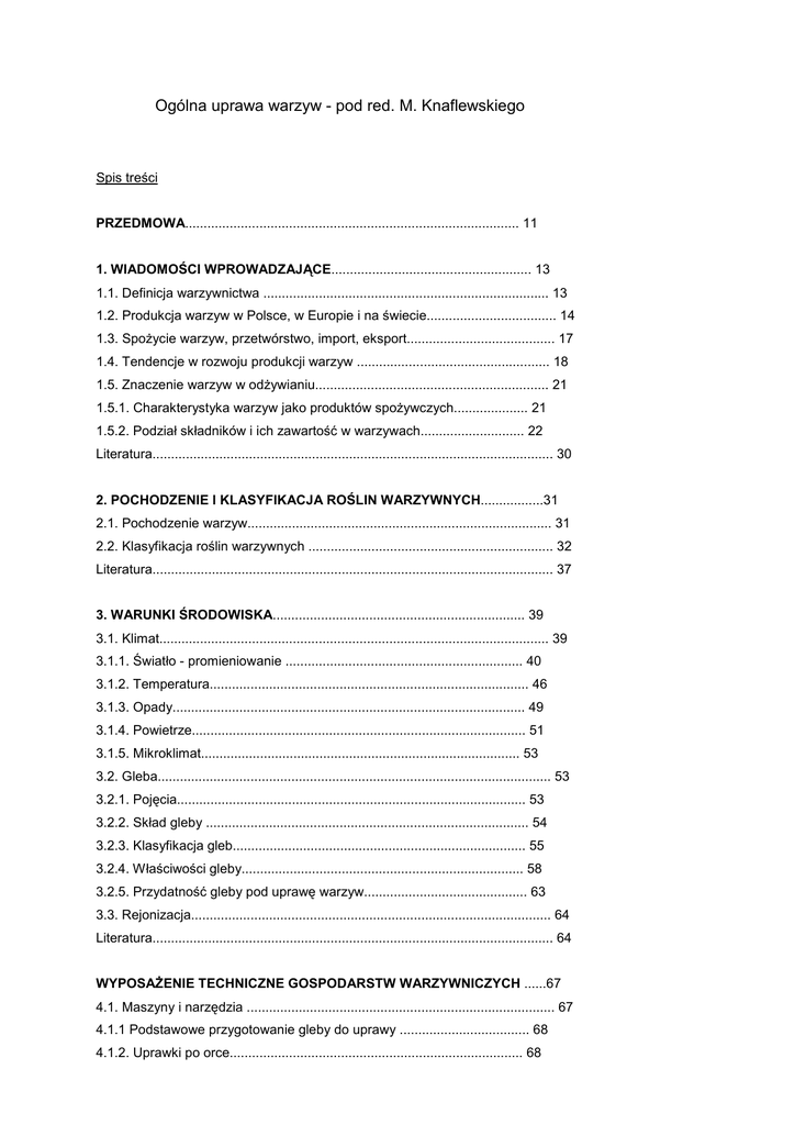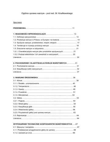 Ogólna uprawa warzyw - pod red. M. Knaflewskiego Spis treści PRZEDMOWA.......................................................................................... 11 1. WIADOMOŚCI WPROWADZAJĄCE...................................................... 13 1.1. Definicja warzywnictwa ............................................................................. 13 1.2. Produkcja warzyw w Polsce, w Europie i na świecie................................... 14 1.3. SpoŜycie warzyw, przetwórstwo, import, eksport........................................ 17 1.4. Tendencje w rozwoju produkcji warzyw .................................................... 18 1.5. Znaczenie warzyw w odŜywianiu............................................................... 21 1.5.1. Charakterystyka warzyw jako produktów spoŜywczych.................... 21 1.5.2. Podział składników i ich zawartość w warzywach............................ 22 Literatura............................................................................................................ 30 2. POCHODZENIE l KLASYFIKACJA ROŚLIN WARZYWNYCH.................31 2.1. Pochodzenie warzyw.................................................................................. 31 2.2. Klasyfikacja roślin warzywnych .................................................................. 32 Literatura............................................................................................................ 37 3. WARUNKI ŚRODOWISKA.................................................................... 39 3.1. Klimat......................................................................................................... 39 3.1.1. Światło - promieniowanie ................................................................ 40 3.1.2. Temperatura...................................................................................... 46 3.1.3. Opady............................................................................................... 49 3.1.4. Powietrze.......................................................................................... 51 3.1.5. Mikroklimat...................................................................................... 53 3.2. Gleba.......................................................................................................... 53 3.2.1. Pojęcia.............................................................................................. 53 3.2.2. Skład gleby ....................................................................................... 54 3.2.3. Klasyfikacja gleb............................................................................... 55 3.2.4. Właściwości gleby............................................................................ 58 3.2.5. Przydatność gleby pod uprawę warzyw............................................ 63 3.3. Rejonizacja................................................................................................. 64 Literatura............................................................................................................ 64 WYPOSAśENIE TECHNICZNE GOSPODARSTW WARZYWNICZYCH ......67 4.1. Maszyny i narzędzia ................................................................................... 67 4.1.1 Podstawowe przygotowanie gleby do uprawy ................................... 68 4.1.2. Uprawki po orce............................................................................... 68 4.1.3. NawoŜenie gleby.............................................................................. 70 4.1.4. Siew nasion....................................................................................... 71 4.1.5. Sadzenie rozsady.............................................................................. 72 4.1.6. Pielęgnowanie międzyrzędzi............................................................ 72 4.1.7. Zbiór i sortowanie warzyw ............................................................... 74 4.2. Pomieszczenia uprawowe........................................................................... 75 4.2.1. Szklarnie...........................................................................................75 4.2.2. Tunele foliowe.................................................................................. 79 Literatura............................................................................................................ 81 5. ZMIANOWANIE l PŁODOZMIAN W UPRAWIE WARZYW .................... 83 5.1 .WaŜniejsze pojęcia dotyczące następstwa roślin ......................................... 83 5.2. Przyrodnicze i agrotechniczne podstawy zmianowania.............................. 86 5.3. Rodzaje płodozmianów i zmianowań......................................................... 90 Literatura............................................................................................................ 92 6. UPRAWA ROLI l PRZYGOTOWANIE PODŁOśY..................................95 6.1. Wiadomości wstępne.................................................................................. 95 6.2. Cele uprawy roli ......................................................................................... 96 6.2.1. Nadanie i utrzymanie struktury gruzełkowatej gleby......................... 96 6.2.2. Poprawa właściwości wodnych, powietrznych i cieplnych............... 96 6.2.3. Zwiększenie aktywności biologicznej gleby...................................... 97 6.2.4. Mieszanie z glebą resztek poŜniwnych, nawozów, herbicydów ....... 97 6.2.5. Zwalczanie chwastów, chorób i szkodników.................................... 98 6.2.6. Stwarzanie odpowiednich warunków do siewu i sadzenia roślin...... 98 6.3. Rodzaje uprawek ........................................................................................ 98 6.3.1. Uprawki odwracające glebę ............................................................. 98 6.3.2. Uprawki spulchniające i wyrównujące powierzchnię roli...