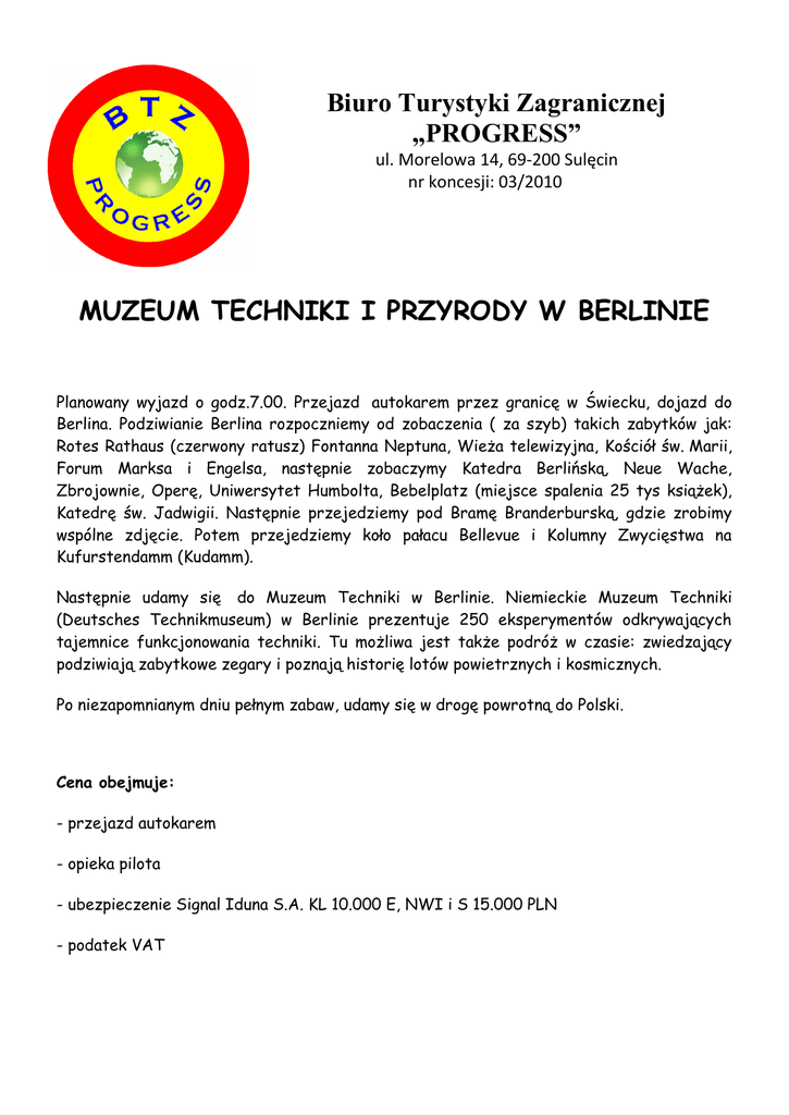 Biuro Turystyki Zagranicznej „PROGRESS” ul. Morelowa 14, 69-200 Sulęcin nr koncesji: 03/2010 MUZEUM TECHNIKI I PRZYRODY W BERLINIE Planowany wyjazd o godz.7.00. Przejazd autokarem przez granicę w Świecku, dojazd do Berlina. Podziwianie Berlina rozpoczniemy od zobaczenia ( za szyb) takich zabytków jak: Rotes Rathaus (czerwony ratusz) Fontanna Neptuna, Wieża telewizyjna, Kościół św. Marii, Forum Marksa i Engelsa, następnie zobaczymy Katedra Berlińską, Neue Wache, Zbrojownie, Operę, Uniwersytet Humbolta, Bebelplatz (miejsce spalenia 25 tys książek), Katedrę św. Jadwigii. Następnie przejedziemy pod Bramę Branderburską, gdzie zrobimy wspólne zdjęcie. Potem przejedziemy koło pałacu Bellevue i Kolumny Zwycięstwa na Kufurstendamm (Kudamm). Następnie udamy się do Muzeum Techniki w Berlinie. Niemieckie Muzeum Techniki (Deutsches Technikmuseum) w Berlinie prezentuje 250 eksperymentów odkrywających tajemnice funkcjonowania techniki. Tu możliwa jest także podróż w czasie: zwiedzający podziwiają zabytkowe zegary i poznają historię lotów powietrznych i kosmicznych. Po niezapomnianym dniu pełnym zabaw, udamy się w drogę powrotną do Polski. Cena obejmuje: - przejazd autokarem - opieka pilota - ubezpieczenie Signal Iduna S.A. KL 10.000 E, NWI i S 15.000 PLN - podatek VAT