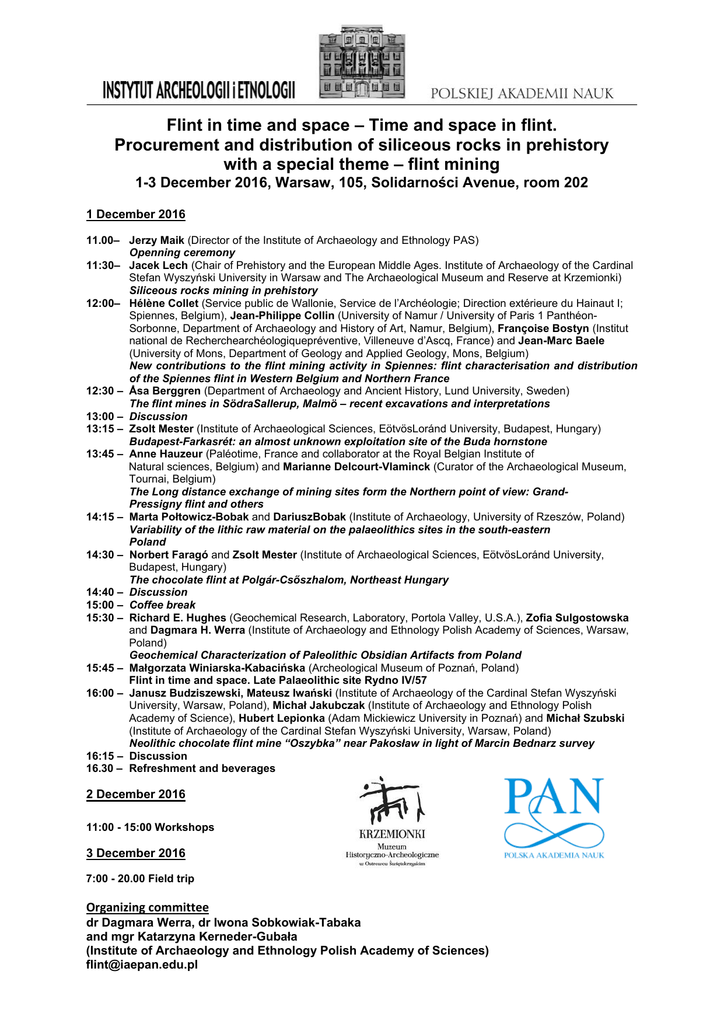 Flint in time and space – Time and space in flint. Procurement and distribution of siliceous rocks in prehistory with a special theme – flint mining 1-3 December 2016, Warsaw, 105, Solidarności Avenue, room 202 1 December 2016 11.00– Jerzy Maik (Director of the Institute of Archaeology and Ethnology PAS) Openning ceremony 11:30– Jacek Lech (Chair of Prehistory and the European Middle Ages. Institute of Archaeology of the Cardinal Stefan Wyszyński University in Warsaw and The Archaeological Museum and Reserve at Krzemionki) Siliceous rocks mining in prehistory 12:00– Hélène Collet (Service public de Wallonie, Service de l’Archéologie; Direction extérieure du Hainaut I; Spiennes, Belgium), Jean-Philippe Collin (University of Namur / University of Paris 1 PanthéonSorbonne, Department of Archaeology and History of Art, Namur, Belgium), Françoise Bostyn (Institut national de Recherchearchéologiquepréventive, Villeneuve d’Ascq, France) and Jean-Marc Baele (University of Mons, Department of Geology and Applied Geology, Mons, Belgium) New contributions to the flint mining activity in Spiennes: flint characterisation and distribution of the Spiennes flint in Western Belgium and Northern France 12:30 – Åsa Berggren (Department of Archaeology and Ancient History, Lund University, Sweden) The flint mines in SödraSallerup, Malmö – recent excavations and interpretations 13:00 – Discussion 13:15 – Zsolt Mester (Institute of Archaeological Sciences, EötvösLoránd University, Budapest, Hungary) Budapest-Farkasrét: an almost unknown exploitation site of the Buda hornstone 13:45 – Anne Hauzeur (Paléotime, France and collaborator at the Royal Belgian Institute of Natural sciences, Belgium) and Marianne Delcourt-Vlaminck (Curator of the Archaeological Museum, Tournai, Belgium) The Long distance exchange of mining sites form the Northern point of view: GrandPressigny flint and others 14:15 – Marta Połtowicz-Bobak and DariuszBobak (Institute of Archaeology, University of Rzeszów, Poland) Variability of the lithic raw material on the palaeolithics sites in the south-eastern Poland 14:30 – Norbert Faragó and Zsolt Mester (Institute of Archaeological Sciences, EötvösLoránd University, Budapest, Hungary) The chocolate flint at Polgár-Csőszhalom, Northeast Hungary 14:40 – Discussion 15:00 – Coffee break 15:30 – Richard E. Hughes (Geochemical Research, Laboratory, Portola Valley, U.S.A.), Zofia Sulgostowska and Dagmara H. Werra (Institute of Archaeology and Ethnology Polish Academy of Sciences, Warsaw, Poland) Geochemical Characterization of Paleolithic Obsidian Artifacts from Poland 15:45 – Małgorzata Winiarska-Kabacińska (Archeological Museum of Poznań, Poland) Flint in time and space. Late Palaeolithic site Rydno IV/57 16:00 – Janusz Budziszewski, Mateusz Iwański (Institute of Archaeology of the Cardinal Stefan Wyszyński University, Warsaw, Poland), Michał Jakubczak (Institute of Archaeology and Ethnology Polish Academy of Science), Hubert Lepionka (Adam Mickiewicz University in Poznań) and Michał Szubski (Institute of Archaeology of the Cardinal Stefan Wyszyński University, Warsaw, Poland) Neolithic chocolate flint mine “Oszybka” near Pakosław in light of Marcin Bednarz survey 16:15 – Discussion 16.30 – Refreshment and beverages 2 December 2016 11:00 - 15:00 Workshops 3 December 2016 7:00 - 20.00 Field trip Organizing committee dr Dagmara Werra, dr Iwona Sobkowiak-Tabaka and mgr Katarzyna Kerneder-Gubała (Institute of Archaeology and Ethnology Polish Academy of Sciences) [email protected]