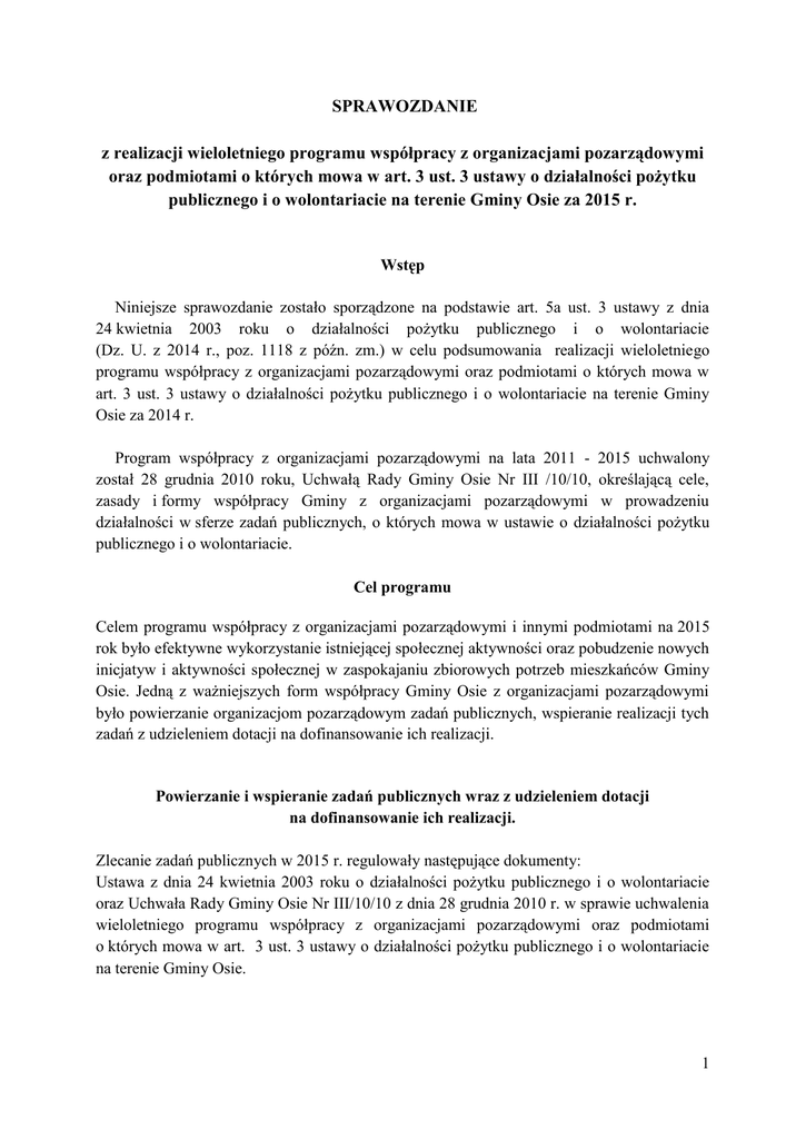 SPRAWOZDANIE z realizacji wieloletniego programu współpracy z organizacjami pozarządowymi oraz podmiotami o których mowa w art. 3 ust. 3 ustawy o działalności pożytku publicznego i o wolontariacie na terenie Gminy Osie za 2015 r. Wstęp Niniejsze sprawozdanie zostało sporządzone na podstawie art. 5a ust. 3 ustawy z dnia 24 kwietnia 2003 roku o działalności pożytku publicznego i o wolontariacie (Dz. U. z 2014 r., poz. 1118 z późn. zm.) w celu podsumowania realizacji wieloletniego programu współpracy z organizacjami pozarządowymi oraz podmiotami o których mowa w art. 3 ust. 3 ustawy o działalności pożytku publicznego i o wolontariacie na terenie Gminy Osie za 2014 r. Program współpracy z organizacjami pozarządowymi na lata 2011 - 2015 uchwalony został 28 grudnia 2010 roku, Uchwałą Rady Gminy Osie Nr III /10/10, określającą cele, zasady i formy współpracy Gminy z organizacjami pozarządowymi w prowadzeniu działalności w sferze zadań publicznych, o których mowa w ustawie o działalności pożytku publicznego i o wolontariacie. Cel programu Celem programu współpracy z organizacjami pozarządowymi i innymi podmiotami na 2015 rok było efektywne wykorzystanie istniejącej społecznej aktywności oraz pobudzenie nowych inicjatyw i aktywności społecznej w zaspokajaniu zbiorowych potrzeb mieszkańców Gminy Osie. Jedną z ważniejszych form współpracy Gminy Osie z organizacjami pozarządowymi było powierzanie organizacjom pozarządowym zadań publicznych, wspieranie realizacji tych zadań z udzieleniem dotacji na dofinansowanie ich realizacji. Powierzanie i wspieranie zadań publicznych wraz z udzieleniem dotacji na dofinansowanie ich realizacji. Zlecanie zadań publicznych w 2015 r. regulowały następujące dokumenty: Ustawa z dnia 24 kwietnia 2003 roku o działalności pożytku publicznego i o wolontariacie oraz Uchwała Rady Gminy Osie Nr III/10/10 z dnia 28 grudnia 2010 r. w sprawie uchwalenia wieloletniego programu współpracy z organizacjami pozarządowymi oraz podmiotami o których mowa w art. 3 ust. 3 ustawy o działalności pożytku publicznego i o wolontariacie na terenie Gminy Osie. 1 Realizacja programu Wójt Gminy Osie w 2015 roku ogłosił dwa otwarte konkursy ofert: 1. Realizacja zadań z zakresu rozwoju sportu na terenie gminy Osie w 2015 r. 2. Realizacja zadań z zakresu propagowania i rozwijania kultury fizycznej, sportu i rekreacji w gminie Osie. Na realizację zadań publicznych, zlecanych organizacjom pozarządowym w ramach rozstrzygniętych konkursów ofert w 2015 r. , przeznaczono kwotę 107.500,00 zł. Zbiorcze zestawienie przyznanych dotacji dla organizacji pozarządowych w ramach otwartych konkursów Nr oferty 1. 2. Nazwa organizacji pozarządowej Gminne Zrzeszenie Ludowe Zespoły Sportowe Gminy Osie Grom Osie Bractwo Czarnej Wody Z tego finansowany ze środków własnych, wkładu osobowego oraz innych źródeł Pozyskana dotacja 146.213,80 zł 100.000,00 zł 46.213,80 zł 100.000,00 zł. 16.495,00 zł. 8.995,00 zł. 7.500,00 zł. Koszt całkowity Z tego wnioskowany 7.500,00 zł. W 2015 roku organizacje pozarządowe oraz inne podmioty prowadzące działalność pożytku publicznego złożyły trzy oferty z własnej inicjatywy na realizację zadań publicznych (art. 19a ustawy o działalności pożytku publicznego i o wolontariacie): 1. Realizacja zadań z zakresu wypoczynku dzieci i młodzieży, turystyki i krajoznawstwa pt.:” Ferie w świetlicy, zajęcia edukacyjno-integracyjne dla dzieci i młodzieży ze wsi Pruskie”. 2. Realizacja zadań z zakresu poprawy bezpieczeństwa na otwartych wodach. 3. Realizacja zadań z zakresu wypoczynku dzieci i młodzieży, turystyki i krajoznawstwa pt.: „W Pruskich mieszkamy, lecz stolicę znamy”- edukacyjne i krajoznawcze cele wyjazdu do Warszawy Na realizację zadań publicznych, złożonych z własnej inicjatywy w 2015 r., przeznaczono kwotę 12.000,00 zł., z czego wykorzystano 11.914,61 zł. 2 Zbiorcze zestawienie przyznanych dotacji dla organizacji pozarządowych, w ramach procedury pominięcia otwartego konkursu ofert Nr oferty 1. 2. 3. Nazwa organizacji pozarządowej Stowarzyszenie na Rzecz Rozwoju Wsi Pruskie Wdeckie Wodne Ochotnicze Pogotowie Ratunkowe Stowarzyszenie na Rzecz Rozwoju Wsi Pruskie Koszt całkowity Z tego wnioskowany Z tego finansowany ze środków własnych, wkładu osobowego oraz innych źródeł 4.480,16 zł 1.000,00 zł 3.565,55 zł 914,61 zł 27.314,00 zł 8.000,00 zł 19.314,00 zł 8.000,00 zł 10.051,47 zł 3.000,00 zł 7.051,47 zł 3.000,00 zł Pozyskana dotacja W 2015 r. z organizacjami pozarządowymi podpisano 5 umów: - dwie w ramach rozstrzygniętych konkursów - trzy z pominięciem otwartego konkursu ofert. Zgodnie z zapisem w umowach, organizacje zobligowane były do złożenia sprawozdań z realizacji zadań publicznych. Sprawozdania końcowe przedstawione zostały w ciągu 30 dni po upływie terminu zakończenia realizacji zadań przewidzianych w umowach. Sprawozdania te zostały zweryfikowane przez pracowników Urzędu Gminy. Do tych sprawozdań nie wniesiono uwag. Wszystkie sprawozdania zostały złożone w terminach określonych w umowach. 3 W trakcie realizacji zadania organizacje pozarządowe zrealizowały następujące zadania: GMINNE ZRZESZENIE LUDOWE ZESPOŁY SPORTOWE GMINY OSIE „Wykonanie zadań publicznych z zakresu rozwoju sportu na terenie gminy Osie”: 1. Treningi drużyny seniora klasa IV 2. Mecze ligowe i sparingi klasy IV 3. Treningi drużyny seniora klasa B 4. Mecze ligowe i sparingi klasy B 5. Treningi drużyny Juniora starszego 6. Mecze ligowe Juniora starszego 7. Treningi drużyny Trampkarza 8. Mecze ligowe Trampkarza 9. Treningi drużyny orlika 10. Mecze drużyny orlika 11. Treningi drużyny młodzika 12. Mecze ligowe drużyny orlika 13. Treningi drużyny piłki siatkowej 14. Rozgrywki plażowej piłki siatkowej- turniej 15. XXI Biegi Oskie 16. Przygotowanie i wyprawa wysokogórska sekcji wspinaczkowej BRACTWO CZARNEJ WODY