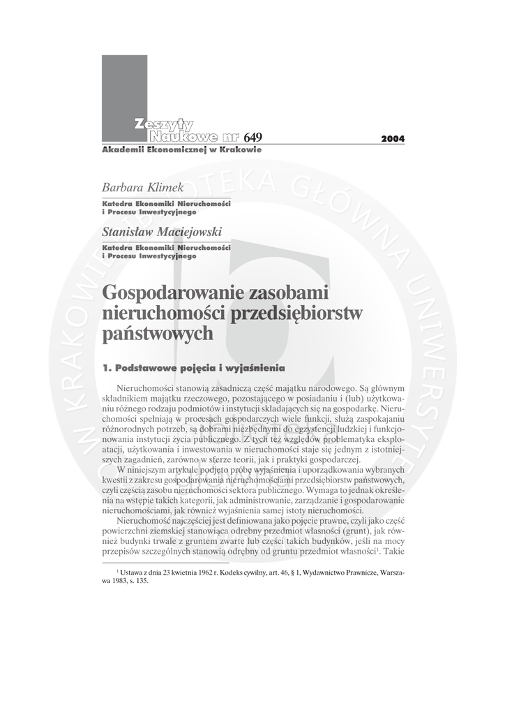 649 2004 Akademii Ekonomicznej w Krakowie Barbara Klimek Katedra Ekonomiki Nieruchomości i Procesu Inwestycyjnego Stanisław Maciejowski Katedra Ekonomiki Nieruchomości i Procesu Inwestycyjnego Gospodarowanie zasobami nieruchomości przedsiębiorstw państwowych 1. Podstawowe pojęcia i wyjaśnienia Nieruchomości stanowią zasadniczą część majątku narodowego. Są głównym składnikiem majątku rzeczowego, pozostającego w posiadaniu i (lub) użytkowaniu różnego rodzaju podmiotów i instytucji składających się na gospodarkę. Nieruchomości spełniają w procesach gospodarczych wiele funkcji, służą zaspokajaniu różnorodnych potrzeb, są dobrami niezbędnymi do egzystencji ludzkiej i funkcjonowania instytucji życia publicznego. Z tych też względów problematyka eksploatacji, użytkowania i inwestowania w nieruchomości staje się jednym z istotniejszych zagadnień, zarówno w sferze teorii, jak i praktyki gospodarczej. W niniejszym artykule podjęto próbę wyjaśnienia i uporządkowania wybranych kwestii z zakresu gospodarowania nieruchomościami przedsiębiorstw państwowych, czyli częścią zasobu nieruchomości sektora publicznego. Wymaga to jednak określenia na wstępie takich kategorii, jak administrowanie, zarządzanie i gospodarowanie nieruchomościami, jak również wyjaśnienia samej istoty nieruchomości. Nieruchomość najczęściej jest definiowana jako pojęcie prawne, czyli jako część powierzchni ziemskiej stanowiąca odrębny przedmiot własności (grunt), jak również budynki trwale z gruntem zwarte lub części takich budynków, jeśli na mocy przepisów szczególnych stanowią odrębny od gruntu przedmiot własności1. Takie 1 Ustawa z dnia 23 kwietnia 1962 r. Kodeks cywilny, art. 46, § 1, Wydawnictwo Prawnicze, Warszawa 1983, s. 135. 36 Barbara Klimek, Stanisław Maciejowski podejście do nieruchomości w dużej mierze wynika ze specyfiki kategorii, do której odnosi się to pojęcie i potrzeby szerokich regulacji prawnych dotyczących własności, użytkowania, eksploatacji nieruchomości. Mając na względzie gospodarowanie nieruchomościami, przydatnym uzupełnieniem podejścia prawnego do nieruchomości gruntowych i obiektowych jest ich postrzeganie z pozycji fizyczno-ekonomicznej. Przy tym ujęciu nieruchomość gruntowa to przestrzeń geodezyjna o określonych granicach, określonym kształcie, cechach fizycznych, biotycznych oraz funkcjonalno-ekonomicznych, której czynnikiem tworzącym i ulepszającym jest przyroda i człowiek. Nieruchomość obiektowa zaś to budynek lub inna budowla o określonym kształcie, strukturze i walorach użytkowych, trwale połączona z gruntem, wytworzona przy użyciu pracy, narzędzi i materiałów z zastosowaniem odpowiednich umiejętności technicznych. Takie określenie nieruchomości akcentuje ich pewne atrybuty ujęte w sposób zagregowany. Każda nieruchomość jest specyficzna pod względem cech użytkowych, położenia, substancji i funkcji. Wszystkie te cechy mają wpływ na zarządzanie, administrowanie i gospodarowanie nieruchomościami. Zarządzanie w najogólniejszym ujęciu to proces, który wiąże się z wyznaczaniem i osiąganiem celów, to działanie polegające na „spowodowaniu funkcjonowania rzeczy, organizacji lub osób podlegających zarządzającemu zgodnie z wytyczonym przez niego celem”2. W odniesieniu do nieruchomości zarządzanie to „wszelkie procesy organizacji, planowania, realizacji oraz kontroli gospodarowania nieruchomościami”3. W myśl ustawy o gospodarce nieruchomościami, zarządzanie nimi to podejmowanie decyzji i czynności zmierzających do utrzymania nieruchomości w stanie co najmniej nie pogorszonym, zgodnie z jej przeznaczeniem, jak również uzasadnionego inwestowania w tę nieruchomość4. Zarządzanie jest zatem osiąganiem założonych rezultatów przez wykorzystanie nieruchomości i wszelkich zasobów i środków dla realizacji tych rezultatów. Z zarządzaniem, zwłaszcza nieruchomościami, wiąże się administrowanie. To ostatnie można określić jako pewien proces odtwórczy, sprowadzający się do realizacji określonych w procesie zarządzania zadań. Administrowanie jest zatem pojęciem węższym od zarządzania i sprowadza się do załatwiania, prowadzenia – w dłuższym bądź krótszym okresie – bieżących spraw i czynności związanych z nieruchomością, bez prawa podejmowania decyzji. Jest to spełnianie zarządzania w procesie gospodarowania5. 2 Encyklopedia powszechna, PWN, Warszawa 1996, s. 768. 3 A. Śliwiński, Zarządzanie nieruchomościami. Podstawy wiedzy i praktyki gospodarowania nieruchomościami, Agencja Wydawnicza Placet, Warszawa 2000, s. 23. 4 5 Ustawa z dnia 21 sierpnia 1997 r. o gospodarce nieruchomościami, Dz.U. nr 115, art. 185. W literaturze często różnicę między zarządzaniem a administrowaniem sprowadza się do tego, że zarządzamy majątkiem, a administrujemy obiektem. Zob. B. Rogatko, Zarządca licencjonowany gwarantem profesjonalnej obsługi nieruchomości, „Świat Nieruchomości”, zima 1997/1998, nr 2. Gospodarowanie zasobami nieruchomości... 37 Gospodarowanie to takie wykorzystanie czynników wytwórczych, które zapewnia możliwie największe dochody; kategoria ta wiąże się zatem z podstawowymi kryteriami wyboru. Gospodarowanie opiera się na zasadzie maksymalizacji efektów przy danych zasobach lub minimalizacji nakładów w celu osiągnięcia pożądanych korzyści (wymiernych lub (i) niewymiernych)6. Gospodarowanie to racjonalne postępowanie prowadzące do sytuacji, w której cele uzyskiwane są w sposób efektywny. Implikuje więc ono potrzebę sprawnego zarządzania. Gospodarowanie nieruchomościami jest procesem obejmującym wiele czynności prowadzących do osiągnięcia określonych celów. Czynności te to działania faktyczne i prawne (lub szerzej – realne i regulacyjne). Do działań faktycznych należy zaliczyć czynności zmierzające do utrzymania i (lub) powiększenia s