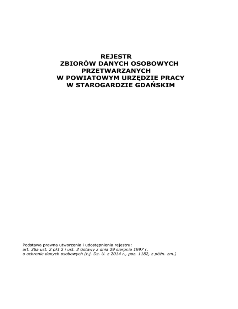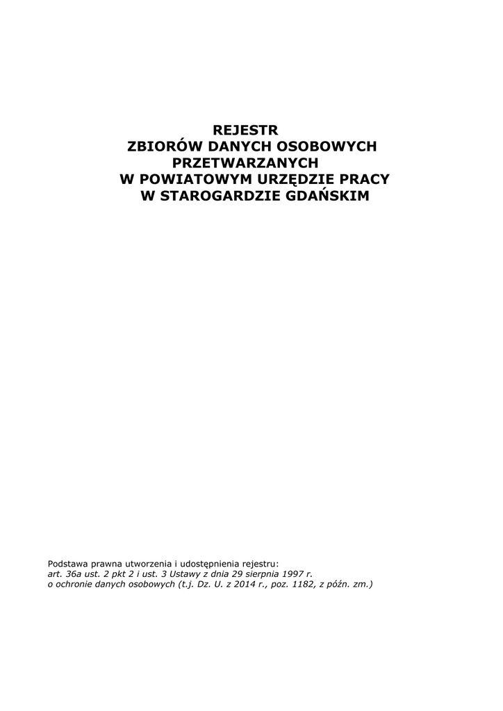 REJESTR ZBIORÓW DANYCH OSOBOWYCH PRZETWARZANYCH W POWIATOWYM URZĘDZIE PRACY W STAROGARDZIE GDAŃSKIM Podstawa prawna utworzenia i udostępnienia rejestru: art. 36a ust. 2 pkt 2 i ust. 3 Ustawy z dnia 29 sierpnia 1997 r. o ochronie danych osobowych (t.j. Dz. U. z 2014 r., poz. 1182, z późn. zm.) 1)Nazwa zbioru danych: KLIENCI POWIATOWEGO URZĘDU PRACY W STAROGARDZIE GDAŃSKIM 2)Oznaczenie administratora danych i adres jego siedziby oraz numer identyfikacyjny rejestru podmiotów gospodarki narodowej: Powiatowy Urząd Pracy w Starogardzie Gdańskim, 83-200 Starogard Gdański , ul. Kanałowa 3 , REGON: 191950489. 3)Oznaczenie przedstawiciela administratora danych, o którym mowa w art. 31a ustawy, i adres jego siedziby lub miejsca zamieszkania: Administrator danych nie wyznaczył przedstawiciela, o którym mowa w art. 31a ustawy, z powodu nieprzekazywania danych do państwa trzeciego. 4)Oznaczenie podmiotu, któremu powierzono przetwarzanie danych ze zbioru na podstawie art. 31 ustawy, i adres jego siedziby lub miejsca zamieszkania – w przypadku powierzenia przetwarzania danych temu podmiotowi: Sygnity S.A. z siedzibą w Warszawie, 02-486 Warszawa, Aleje Jerozolimskie 180, z kapitałem zakładowym w wysokości 11.886.242 złotych, wpisaną do Rejestru Przedsiębiorców Krajowego Rejestru Sądowego prowadzonego przez Sąd Rejonowy dla m.st. Warszawy XIII Wydział Gospodarczy, pod numerem 0000008162, NIP 586-000-52-93, 5)Podstawa prawna upoważniająca do prowadzenia zbioru danych: Ustawa z dnia 20 kwietnia 2014 r. o promocji zatrudnienia i instytucjach rynku pracy (t.j. Dz. U. z 2015 r., poz. 149, z późn. zm.). Przepisy wykonawcze do ww. ustawy. Inne akty prawne o randze ustawy lub przepisów wykonawczych, związane z realizacją zadań określonych w ww. ustawie, w tym m.in. przepisy dotyczące ubezpieczenia społecznego, świadczeń zdrowotnych realizowanych ze środków publicznych, podatku dochodowego, postępowania administracyjnego i cywilnego, pomocy społecznej i inne. 6)Cel przetwarzania danych w zbiorze: Realizacja obowiązków, praw i zadań wynikających z przepisów określonych w pkt 5. 7)Opis kategorii osób, których dane są przetwarzane w zbiorze: Osoby bezrobotne i poszukujące pracy pozostające w ewidencji prowadzonej w Powiatowym Urzędzie Pracy w Starogardzie Gdańskim. Inne osoby, których kontakt z urzędem na podstawie przepisów wskazanych w pkt 5 wymaga udokumentowania. 8)Zakres danych przetwarzanych w zbiorze: Imię (imiona) i nazwisko; płeć; obywatelstwo; PESEL; rodzaj i numer dokumentu tożsamości; imiona rodziców; data i miejsce urodzenia; nazwisko rodowe; stan cywilny; imiona, nazwiska, PESEL, rodzaj i numer dokumentu tożsamości, daty urodzenia, stopień pokrewieństwa i adresy członków rodziny; adres; inne dane kontaktowe (e-mail, telefon, inne środki komunikacji elektronicznej); posiadane wykształcenie, zawody, kwalifikacje, umiejętności i uprawnienia; rodzaj i stopień niepełnosprawności; okresy zatrudnienia, innej pracy zarobkowej i inne okresy uprawniające do zasiłku dla bezrobotnych; okresy pozbawienia lub ograniczenia wolności; fakty niezbędne do ustalenia możliwości przyznania statusu osoby bezrobotnej w zakresie wynikającym z art. 2 ust. 1 pkt 2 ustawy o promocji zatrudnienia i instytucjach rynku pracy (t.j. Dz. U. z 2015 r., poz. 149, z późn. zm.); numer rachunku bankowego; okresy zgłoszenia do ubezpieczenia zdrowotnego i społecznego z tytułu posiadania statusu osoby bezrobotnej; informacje podatkowe; informacje o dochodach; informacje o ciążących zobowiązaniach; dokumenty związane z czasową niezdolnością do pracy; wskazania i przeciwwskazania lekarskie do wykonywania określonej pracy; informacje o postępowaniach administracyjnych; daty, miejsca, rodzaje, cele i efekty kontaktów z urzędem; cechy i predyspozycje związane z ustalaniem profilu pomocy. 9)Sposób zbierania danych do zbioru, w szczególności informacja, czy dane do zbioru są zbierane od osób, których dotyczą, czy z innych źródeł niż osoba, której dane dotyczą: Dane osobowe zbierane są bezpośrednio od osób, których dotyczą. Na podstawie obowiązujących przepisów prawa dane osobowe zbierane mogą być także z innych źródeł niż osoba, której dane dotyczą. 10)Sposób udostępniania danych ze zbioru, w szczególności informacja, czy dane ze zbioru są udostępniane innym podmiotom niż upoważnione na podstawie przepisów prawa: Udostępnianie danych ze zbioru odbywa się drogą elektroniczną poprzez przekazywanie ich do rejestru centralnego utworzonego przez ministra właściwego do spraw pracy na podstawie art. 4 ust. 4 ustawy wskazanej w pkt 5. Udostępnianie danych ze zbioru odbywa się drogą elektroniczną lub w formie tradycyjnej, na podstawie składanych każdorazowo wniosków przez upoważnione na podstawie przepisów prawa organy, instytucje i organizacje. Podmioty inne niż upoważnione na podstawie przepisów prawa mogą po złożeniu wniosku uzyskać dane ze zbioru pod warunkiem spełnienia wymagań określonych w przepisach ustawy o ochronie danych osobowych (t.j. Dz.U. 2014 poz. 1182, z późn. zm.). Decyzję o udostępnieniu danych podmiotom innym niż upoważnione na podstawie przepisów prawa podejmuje administrator danych osobowych. 11)Oznaczenie odbiorcy danych lub kategorii odbiorców, którym dane mogą być przekazywane: Organy administracji rządowej i samorządowej. Inne organy, instytucje i organizacje, które na składanym wniosku wykażą swój prawnie usprawiedliwiony cel, z wyłączeniem celów marketingowych. 12)Informacja dotycząca ewentualnego przekazywania danych do państwa trzeciego: Dane ze zbioru nie są przekazywane do państwa trzeciego. 13)Data wpisu zbioru danych do rejestru: 23.06.2015 r. 14)Data ostatniej aktualizacji informacji dotyczących zbioru danych: 23.06.2015 r. 1)Nazwa zbioru danych: PRACOWNICY POWIATOWEGO URZĘDU PRACY W STAROGARDZIE GDAŃSKIM 2)Oznaczenie administrat