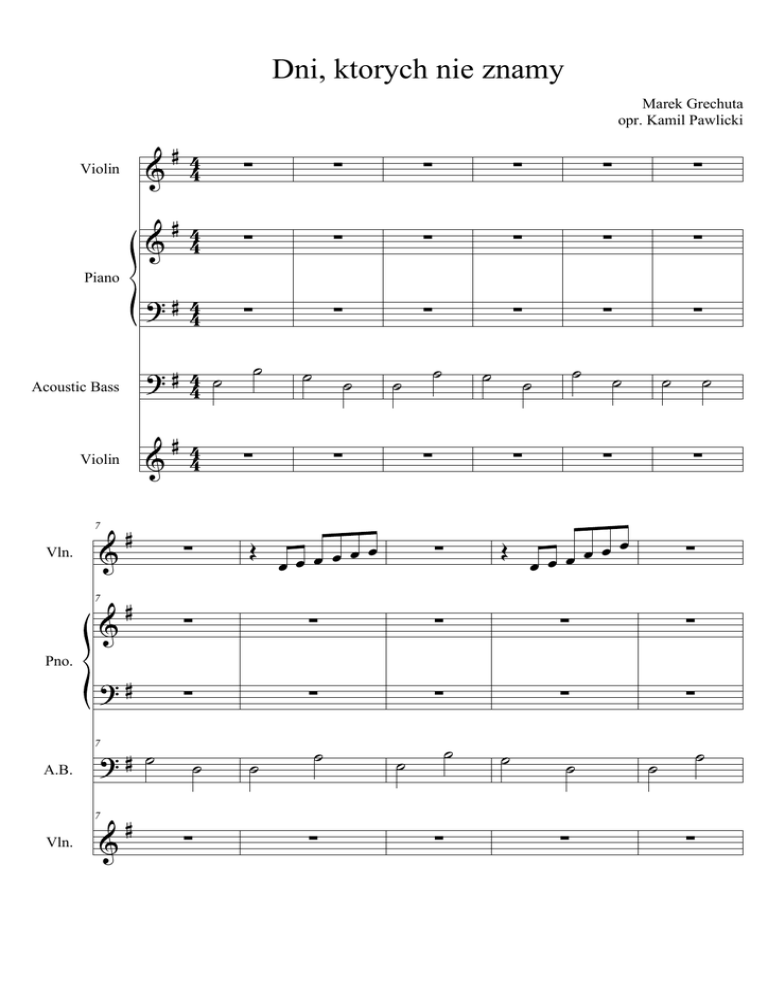Dni, ktorych nie znamy Violin Piano 7 Pno. 7 A.B. 7 Vln. Violin Vln. Acoustic Bass 7 Marek Grechuta opr. Kamil Pawlicki Dni, ktorych nie znamy 2 Vln. 12 Pno. 12 12 A.B. 12 Vln. 17 Vln. 17 A.B. 17 Pno. 17 Vln. Dni, ktorych nie znamy 21 Vln. 21 Pno. 21 Vln. 25 Vln. 25 Pno. 25 Vln. 25 A.B. 21 A.B. 3 Dni, ktorych nie znamy 4 29 Vln. 29 Pno. 29 Vln. 33 Vln. 33 Pno. 33 Vln. 33 A.B. 29 A.B. Dni, ktorych nie znamy 37 Vln. 37 Pno. 37 Vln. 41 Vln. 41 Pno. 41 Vln. 41 A.B. 37 A.B. 5 Dni, ktorych nie znamy 6 45 Vln. 45 Pno. 45 Vln. 49 Vln. 49 49 Vln. A.B. 49 Pno. 45 A.B.