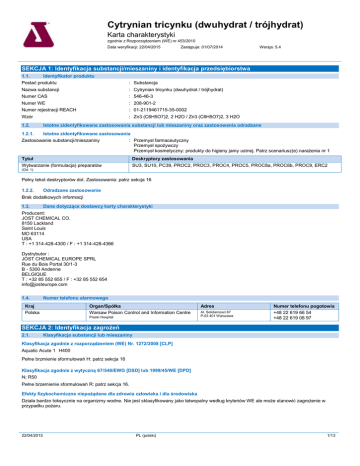 Cytrynian tricynku (dwuhydrat / trójhydrat) Karta charakterystyki zgodnie z Rozporządzeniem (WE) nr 453/2010 Data weryfikacji: 22/04/2015 Zastępuje: 01/07/2014 Wersja: 5.4 SEKCJA 1: Identyfikacja substancji/mieszaniny i identyfikacja przedsiębiorstwa 1.1. Identyfikator produktu Postać produktu : Substancja Nazwa substancji : Cytrynian tricynku (dwuhydrat / trójhydrat) Numer CAS : 546-46-3 Numer WE : 208-901-2 Numer rejestracji REACH : 01-2119461715-35-0002 Wzór : Zn3 (C6H5O7)2, 2 H2O / Zn3 (C6H5O7)2, 3 H2O 1.2. Istotne zidentyfikowane zastosowania substancji lub mieszaniny oraz zastosowania odradzane 1.2.1. Istotne zidentyfikowane zastosowania Zastosowanie substancji/mieszaniny : Przemysł farmaceutyczny Przemysł spożywczy Przemysł kosmetyczny: produkty do higieny jamy ustnej. Patrz scenariusz(e) narażenia nr 1 Tytuł Wytwarzanie (formulacja) preparatówX Deskryptory zastosowania SU3, SU10, PC39, PROC2, PROC3, PROC4, PROC5, PROC8a, PROC8b, PROC9, ERC2 (Od: 1) Pełny tekst deskryptorów dot. Zastosowania: patrz sekcja 16 1.2.2. Odradzane zastosowanie Brak dodatkowych informacji 1.3. Dane dotyczące dostawcy karty charakterystyki Producent: JOST CHEMICAL CO. 8150 Lackland Saint Louis MO 63114 USA T : +1 314-428-4300 / F : +1 314-428-4366 Dystrybutor : JOST CHEMICAL EUROPE SPRL Rue du Bois Portal 30/1-3 B - 5300 Andenne BELGIQUE T : +32 85 552 655 / F : +32 85 552 654 [email protected] 1.4. Numer telefonu alarmowego Organ/Spółka Warsaw Poison Control and Information Centre Kraj Polska Praski Hospital Adres Al. Solidarnosci 67 P-03 401 Warszawa Numer telefonu pogotowia +48 22 619 66 54 +48 22 619 08 97 SEKCJA 2: Identyfikacja zagrożeń 2.1. Klasyfikacja substancji lub mieszaniny Klasyfikacja zgodnie z rozporządzeniem (WE) Nr. 1272/2008 [CLP]# Aquatic Acute 1 H400 Pełne brzmienie sformułowań H: patrz sekcja 16 Klasyfikacja zgodnie z wytyczną 67/548/EWG [DSD] lub 1999/45/WE [DPD] N; R50 Pełne brzemienie sformułowań R: patrz sekcja 16. Efekty fizykochemiczne niepożądane dla zdrowia człowieka i dla środowiska Działa bardzo toksycznie na organizmy wodne. Nie jest sklasyfikowany jako łatwopalny według kryteriów WE ale może stanowić zagrożenie w przypadku pożaru. 22/04/2015 PL (polski) 1/13 Cytrynian tricynku (dwuhydrat / trójhydrat) Karta charakterystyki zgodnie z Rozporządzeniem (WE) nr 453/2010 2.2. Elementy oznakowania Oznakowanie zgodnie z rozporządzeniem (WE) nr. 1272/2008 [CLP] Piktogramy określające rodzaj zagrożenia (CLP) : GHS09 Hasło ostrzegawcze (CLP) : Uwaga Zwroty wskazujące rodzaj zagrożenia (CLP) : H400 - Działa bardzo toksycznie na organizmy wodne Zwroty wskazujące środki ostrożności (CLP) : P273 - Unikać uwolnienia do środowiska P391 - Zebrać wyciek P501 - Zawartość/pojemnik usuwać do upoważniona firma zajmująca się usuwaniem 2.3. Inne zagrożenia Brak dodatkowych informacji SEKCJA 3: Skład/informacja o składnikach 3.1. Substancja Nazwa Identyfikator produktu % Klasyfikacja zgodnie z dyrektywą 67/548/EEC Cytrynian tricynku (dwuhydrat / trójhydrat) (Numer CAS) 546-46-3 (Numer WE) 208-901-2 (REACH-nr) 01-2119461715-35-0002 97,4 - 100 N; R50 Nazwa Identyfikator produktu % Klasyfikacja zgodnie z rozporządzeniem (WE) Nr. 1272/2008 [CLP] Cytrynian tricynku (dwuhydrat / trójhydrat) (Numer CAS) 546-46-3 (Numer WE) 208-901-2 (REACH-nr) 01-2119461715-35-0002 97,4 - 100 Aquatic Acute 1, H400 Brzmienie sformułowań R i H: patrz sekcja 16 3.2. Mieszanina Nie dotyczy SEKCJA 4: Środki pierwszej pomocy 4.1. Opis środków pierwszej pomocy Pierwsza pomoc - środki po zainhalowaniu : Wyprowadzić poszkodowanego ze strefy zakażonej na świeże powietrze. Pierwsza pomoc - środki po kontakcie ze skórą : Zdjąć natychmiast zanieczyszczoną odzież lub obuwie. Płukać obficie wodą. Pierwsza pomoc - środki po kontakcie z oczami : Natychmiastowe i dłuższe płukanie w wodzie trzymając powieki szeroko rozwarte (przynajmniej przez 15 minut). Skonsultować się z okulistą w przypadku utrzymującego się podrażnienia. Pierwsza pomoc - środki po połknięciu : Jeżeli spożyto znaczne ilości: Zasięgnąć porady/zgłosić się pod opiekę lekarza. 4.2. Najważniejsze ostre i opóźnione objawy oraz skutki narażenia Symptomy/urazy w przypadku inhalacji : Gorączka odlewników. Symptomy/urazy w przypadku połknięcia : Wymioty. Biegunka. 4.3. Wskazania dotyczące wszelkiej natychmiastowej pomocy lekarskiej i szczególnego postępowania z poszkodowanym Leczenie objawowe. SEKCJA 5: Postępowanie w przypadku pożaru 5.1. Środki gaśnicze Odpowiednie środki gaśnicze 5.2. Szczególne zagrożenia związane z substancją lub mieszaniną Zagrożenie pożarowe 5.3. : Woda rozpylana. Ditlenek węgla. Suchy proszek. Piana. : Łatwopalny. Podczas spalania. Potencjalne wydzielanie się toksycznych oparów. Informacje dla straży pożarnej Instrukcja gaśnicza : Zatrzymać ciecze gaśnicze przez obwałowanie (produkt jest niebezpieczny dla środowiska). Schłodzić narażone pojemniki rozpylaną wodą lub mgłą wodną. Ochrona w przypadku gaszenia pożaru : Nie interweniować bez stosownego wyposażenia ochronnego. Kompletna odzież ochronna. Samodzielny, izolujący aparat ochronny do oddychania. 22/04/2015 PL (polski) 2/13 Cytrynian tricynku (dwuhydrat / trójhydrat) Karta charakterystyki zgodnie z Rozporządzeniem (WE) nr 453/2010 SEKCJA 6: Postępowanie w przypadku niezamierzonego uwolnienia do środowiska 6.1. Indywidualne środki ostrożności, wyposażenie ochronne i procedury w sytuacjach awaryjnych 6.1.1. Dla osób nienależących do personelu udzielającego pomocy Procedury działania na wypadek zagrożenia 6.1.2. Dla osób udzielających pomocy Wyposażenie ochronne 6.2. : Unikać kontaktu ze skórą i z oczami. : Nie interweniować bez stosownego wyposażenia ochronnego. Celem uzyskania dodatkowych informacji, patrz sekcja 8: "Ograniczenie narażenia/Środki ochrony indywidualnej". Środki ostrożności w zakresie ochrony środowisk