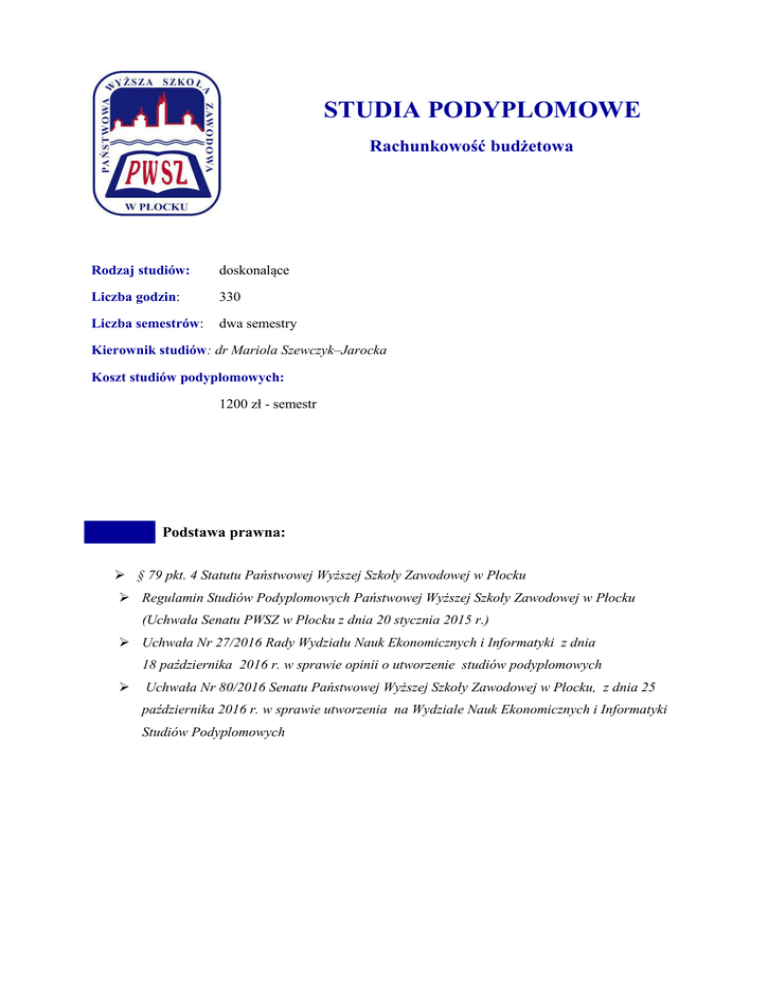 STUDIA PODYPLOMOWE Rachunkowość budżetowa Rodzaj studiów: doskonalące Liczba godzin: 330 Liczba semestrów: dwa semestry Kierownik studiów: dr Mariola Szewczyk–Jarocka Koszt studiów podyplomowych: 1200 zł - semestr Podstawa prawna: § 79 pkt. 4 Statutu Państwowej Wyższej Szkoły Zawodowej w Płocku Regulamin Studiów Podyplomowych Państwowej Wyższej Szkoły Zawodowej w Płocku (Uchwała Senatu PWSZ w Płocku z dnia 20 stycznia 2015 r.) Uchwała Nr 27/2016 Rady Wydziału Nauk Ekonomicznych i Informatyki z dnia 18 października 2016 r. w sprawie opinii o utworzenie studiów podyplomowych Uchwała Nr 80/2016 Senatu Państwowej Wyższej Szkoły Zawodowej w Płocku, z dnia 25 października 2016 r. w sprawie utworzenia na Wydziale Nauk Ekonomicznych i Informatyki Studiów Podyplomowych STUDIA PODYPLOMOWE Rachunkowość Budżetowa Cel studiów Głównym celem studiów jest osiągnięcie przez uczestników studiów podyplomowych założonych efektów kształcenia tj. przygotowanie do pracy w placówkach budżetowych. Adresaci Studia skierowane są do osób, które chcą uzyskać bądź poszerzyć zasób wiedzy oraz umiejętności dotyczący rachunkowości budżetowej. Oferta przewidziana jest zatem dla osób, które swoją karierę zawodową wiążą z pracą na stanowisku księgowego, analityka, kosztów. Studia skierowane są również do odbiorców zainteresowanych poszerzeniem wiedzy z rachunkowości gospodarstw pomocniczych, rachunkowości zakładów rachunkowości budżetów jednostek samorządu terytorialnego. Charakterystyka studiów Łączna liczba godzin dla jednego słuchacza:330 w tym: liczba godzin zajęć teoretycznych (wykłady): 120 liczba godzin zajęć praktycznych (konwersatoria, ćwiczenia): 200 liczba godzin na seminarium dyplomowe (seminarium): 10 Planowane terminy rozpoczęcia i zakończenia studiów rozpoczęcie – luty 2017 r. zakończenia – luty 2018 r. Zasady zaliczenia studiów Zaliczenie przedmiotów kształcenia Napisanie i obrona pracy dyplomowej Warunki uzyskania świadectw Zaliczenie przedmiotów kształcenia Napisanie i obrona pracy dyplomowej Miejsce lokalizacji zajęć Państwowa Wyższa Szkoła Zawodowa w Płocku, ul. Gałczyńskiego 28 Państwowa Wyższa Szkoła Zawodowa w Płocku Wydział Nauk Ekonomicznych i Informatyki 09-402 Płock, Nowe Trzepowo 55 tel. 24 366 54 25 lub 24 366 54 08 e-mail: [email protected] budżetowych, STUDIA PODYPLOMOWE Rachunkowość Budżetowa Opis nabytych umiejętności i kompetencji w przypadku studiów podyplomowych W toku studiów słuchacze zdobędą kompleksową wiedzę, pełne umiejętności, jak również kompetencje potrzebne w wykonywaniu pracy na stanowiskach związanych z rachunkowością budżetową. Zostaną więc przygotowani do przeprowadzania prawidłowego księgowania operacji gospodarczych w jednostkach budżetowych. Absolwent będzie posiadał umiejętności wykonywania analiz wykorzystywanych dla administracji państwowej i publicznej. Uczestnicy studiów zostaną wyposażeni w umiejętność myślenia analitycznego. Państwowa Wyższa Szkoła Zawodowa w Płocku Wydział Nauk Ekonomicznych i Informatyki 09-402 Płock, Nowe Trzepowo 55 tel. 24 366 54 25 lub 24 366 54 08 e-mail: [email protected] STUDIA PODYPLOMOWE Rachunkowość Budżetowa Plan studiów Liczba godz. Przedmioty Lp. W K/ćw S Forma zaliczenia Łączna Punkty liczba godz. ECTS 1 Rachunkowość budżetów JST I sem. 20 20ćw E 40 7 3 Finanse samorządu terytorialnego I sem. 20 20ćw E 20 7 2 Budżet państwa I sem. 20k ZO 20 4 4 Budżety JST I sem. 20k ZO 20 4 5 Sektor finansów publicznych I sem. 20k ZO 20 4 6 Sprawozdawczość budżetowa II sem. 20 20ćw E 40 7 7 Rachunkowość organów podatkowych 20 II sem. 20ćw E 40 4 8. Ustawa o rachunkowości II sem. 20 ZO 20 2 9. Elementy prawa II sem. 20 E 20 2 10 Organizacja pracy biurowej I sem. 20k ZO 20 4 11 Rachunkowość pomocniczych II sem. gospodarstw 20k ZO 20 4 12 Rachunkowość zakładów budżetowych II sem. 20k ZO 20 4 13 Seminarium II sem. ZO 10 7 330 60 10s Łącznie 120 200 10 W – wykład k/ćw – konwersatoria/ćwiczenia S - seminarium E – egzamin ZO – zaliczenie z oceną Państwowa Wyższa Szkoła Zawodowa w Płocku Wydział Nauk Ekonomicznych i Informatyki 09-402 Płock, Nowe Trzepowo 55 tel. 24 366 54 25 lub 24 366 54 08 e-mail: [email protected] STUDIA PODYPLOMOWE Rachunkowość Budżetowa Program studiów Wymagania wstępne: Studia adresowane do absolwentów studiów co najmniej pierwszego stopnia. Procedura rekrutacji jest przeprowadzana bez względu na kierunek ukończonych studiów. Kwalifikacje: Program studiów przygotowuje do wykonywania zawodu księgowego (skarbnika) w placówkach budżetowych. Zdobyte w trakcie studiów kwalifikacje są również cenne dla kadry przeprowadzającej analizy i planowanie. W toku studiów słuchacze zdobędą kompleksową wiedzę, pełne umiejętności, jak również kompetencje potrzebne do pracy na stanowiskach związanych ze współczesną rachunkowością budżetową. Zostaną więc przygotowani do przeprowadzania księgowanie, analiz, planowania, interpretacji przepisów prawnych dot. obszaru budżetowego. Absolwent będzie posiadał umiejętności wykonywania analiz budżetów jednostek samorządu terytorialnego oraz budżetu centralnego. Uczestnicy studiów zostaną wyposażeni w umiejętność myślenia analitycznego. Poznają zasady rachunkowości gospodarstw pomocniczych, rachunkowość zakładów budżetowych, rachunkowość organów podatkowych. Praca: Studia przewidziane są dla osób, które swoją karierę zawodową wiążą z pracą na stanowiskach w księgowości i działach analiz finansowych i analiz kosztów w jednostkach samorządu terytorialnego, US, gospodarstwach pomocniczych, zakładach budżetowych. Studia skierowane są również do odbiorców rachunkowości budżetowej. Państwowa Wyższa Szkoła Zawodowa w Płocku Wydział Nauk Ekonomicznych i Informatyki 09-402 Płock, Nowe Trzepowo 55 tel. 2