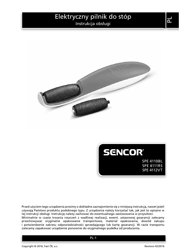 PL Elektryczny pilnik do stóp Instrukcja obsługi SPE 4110BL SPE 4111RS SPE 4112VT Przed użyciem tego urządzenia prosimy o dokładne zaznajomienie się z niniejszą instrukcją, nawet jeżeli używają Państwo produktu podobnego typu. Z urządzenia należy korzystać tak, jak jest to opisane w tej instrukcji obsługi. Instrukcję należy zachować do ewentualnego zastosowania w przyszłości. Minimalnie w czasie trwania roszczeń z wadliwej realizacji, ewent. ustawowej gwarancji zalecamy przechowywać oryginalne opakowanie transportowe, materiał opakowania, dowód zakupu i potwierdzenie zakresu odpowiedzialności sprzedającego lub kartę gwarancji. W razie transportu zalecamy zapakować urządzenie ponownie do oryginalnego pudełka od producenta. PL-1 Copyright © 2016, Fast ČR, a.s. Revision 02/2016 PL Elektryczny pilnik do stóp SPE 4110BL / SPE 4111RS / SPE 4112VT Spis treści WAŻNE INSTRUKCJE DOTYCZĄCE BEZPIECZEŃSTWA......................................................................3 OPIS PILNIKA ELEKTRYCZNEGO.........................................................................................................6 CZYM JEST ZROGOWACIAŁY NASKÓREK.........................................................................................7 CEL ZASTOSOWANIA PILNIKA ELEKTRYCZNEGO.............................................................................7 ŹRÓDŁO ZASILANIA...........................................................................................................................7 WKŁADANIE I WYJMOWANIE NAKŁADKI ŚCIERNEJ........................................................................7 OBSŁUGA PILNIKA ELEKTRYCZNEGO................................................................................................9 PIELĘGNACJA POWIERZCHNI STÓP PO ZASTOSOWANIU PILNIKA..................................................9 KONSERWACJA I CZYSZCZENIE.........................................................................................................9 DANE TECHNICZNE...........................................................................................................................10 WSKAZÓWKI I INFORMACJE DOTYCZĄCE POSTĘPOWANIA ZE ZUŻYTYM OPAKOWANIEM.....10 LIKWIDACJA ZUŻYTYCH BATERII ...................................................................................................10 LIKWIDACJA ZUŻYTYCH URZĄDZEŃ ELEKTRYCZNYCH I ELEKTRONICZNYCH.............................10 PL-2 Copyright © 2016, Fast ČR, a.s. Revision 02/2016 PL Elektryczny pilnik do stóp SPE 4110BL / SPE 4111RS / SPE 4112VT WAŻNE INSTRUKCJE DOTYCZĄCE BEZPIECZEŃSTWA PROSIMY UWAŻNIE PRZECZYTAĆ I ZACHOWAĆ NA PRZYSZŁOŚĆ. • Z niniejszego urządzenia mogą korzystać dzieci w wieku od 8 lat oraz osoby o obniżonych zdolnościach fizycznych, percepcyjnych i umysłowych lub niewielkim doświadczeniu i wiedzy, o ile jest nad nimi sprawowany nadzór lub zostały one pouczone o korzystaniu z urządzenia w bezpieczny sposób i zdają sobie sprawę z ewentualnego niebezpieczeństwa. Czyszczenia i konserwacji nie mogą wykonywać dzieci poniżej 8 roku życia i o ile nie są pod nadzorem. Urządzenie należy przechowywać poza zasięgiem dzieci poniżej 8 roku życia. Dzieci nie powinny się bawić urządzeniem. • Niniejsze urządzenie przeznaczone jest do zastosowania domowego i służy do usuwania zrogowaciałego naskórka ze stóp osób dorosłych. Nie stosować go do stóp dziecięcych lub do innych celów. W przeciwnym wypadku może dojść do jego uszkodzenia. • Urządzenia nie narażaj na działanie środowiska zewnętrznego, ekstremalnych temperatur, bezpośredniego promieniowania słonecznego, PL-3 Copyright © 2016, Fast ČR, a.s. Revision 02/2016 PL Elektryczny pilnik do stóp SPE 4110BL / SPE 4111RS / SPE 4112VT nadmiernej wilgotności lub nadmiernie zapylonego środowiska. • Urządzenia nie umieszczaj w pobliżu elementów grzewczych, otwartego płomienia oraz innych odbiorników lub urządzeń, które są źródłami ciepła. •Urządzenie stosuj wyłącznie z oryginalną nakładką ścierną. • Przed każdym zastosowaniem upewnij się, czy urządzenie nie jest uszkodzone i czy nakładka ścierna poprawnie zamocowana jest w głowicy pilnika. Jeżeli widoczne są jakiekolwiek objawy uszkodzenia, nie korzystaj z niego. • Z urządzenia korzystaj w odpowiedniej odległości od wanny, umywalki albo innych naczyń z napuszczoną wodą. • Z urządzenia nie korzystaj w wannie ani biorąc prysznic. Nie czyść go pod kranem, nie pryskaj wodą ani innymi płynami ani nie zanurzaj go w wodzie ani innej cieczy. • Nie pozostawiaj urządzenia bez nadzoru. • Nie stosuj niniejszego urządzenia do podrażnionego, zapalonego, skaleczonego lub poparzonego naskórka, znamion pigmentowych, wyrostków skóry, brodawek lub PL-4 Copyright © 2016, Fast ČR, a.s. Revision 02/2016 PL Elektryczny pilnik do stóp SPE 4110BL / SPE 4111RS / SPE 4112VT naskórka z wypryskami lub wysypką itp. Tak samo nie wolno niniejszego urządzenia stosować do usuwania zdrowego naskórka. W odwrotnym przypadku może dojść do naruszenia niektórej z warstw naskórka. • Diabetycy oraz osoby z wysokim ciśnieniem krwi powinni skonsultować korzystanie z niniejszego urządzenia ze swoim lekarzem. • Zawsze po zakończeniu stosowania wyłącz urządzenie. •Baterie przechowuj poza zasięgiem dzieci, ponieważ w ich pobliżu mogą oznaczać one niebezpieczeństwo. Jeżeli dziecko połknie baterię, natychmiast wyszukaj pomocy lekarskiej. • Nie próbuj wykonać zwarcia baterii, łamać ich ani nie wrzucaj ich do ognia. Baterii nie narażaj na bezpośrednie promieniowanie słoneczne. •By uniknąć powstania niebezpiecznej sytuacji, nie naprawiaj ani nie przerabiaj sam urządzenia. Wszelkie naprawy należy powierzyć autoryzowanemu serwisowi. Ingerencją w urządzenie narażasz się na ryzyko utraty ustawowego prawa wynikającego z roszczeń do wad gwarancji jakości. PL-5 Copyright 