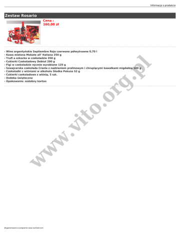 Informacje o produkcie Zestaw Rosario Cena : 160,00 zł or g. pl Wino argentyńskie Septiembre Rojo czerwone półwytrawne 0,70 l Kawa mielona Mokate all’ Italiana 250 g Trufl a szkocka w czekoladzie 350 g Cukierki Czekoladowy Debiut 200 g Figi w czekoladzie ręcznie wyrabiane 125 g Szwajcarska czekolada Cresta z nadzieniem pralinowym i chrupiącymi kawałkami migdałów 100 g Czekoladki z wiśniami w alkoholu Słodka Pokusa 52 g Cukierki czekoladowe z wiśnią, 5 szt. Ozdoba świąteczna Opakowanie: ozdobny karton w w w .v it o. - Wygenerowano w programie www.oscGold.com