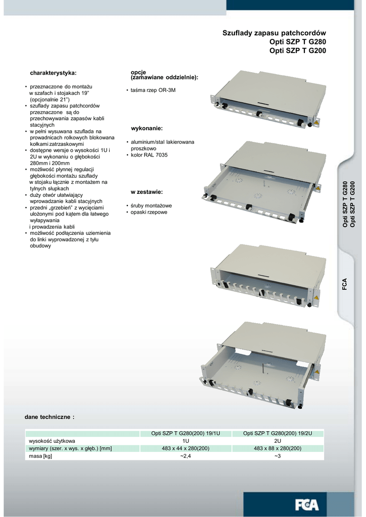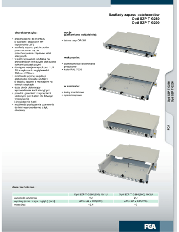 Szuflady zapasu patchcordów Opti SZP T G280 Opti SZP T G200 • taśma rzep OR-3M wykonanie: • aluminium/stal lakierowana proszkowo • kolor RAL 7035 w zestawie: • śruby montażowe • opaski rzepowe FCA • przeznaczone do montażu w szafach i stojakach 19” (opcjonalnie 21”) • szuflady zapasu patchcordów przeznaczone są do przechowywania zapasów kabli stacyjnych • w pełni wysuwana szuflada na prowadnicach rolkowych blokowana kołkami zatrzaskowymi • dostępne wersje o wysokości 1U i 2U w wykonaniu o głębokości 280mm i 200mm • możliwość płynnej regulacji głębokości montażu szuflady w stojaku łącznie z montażem na tylnych słupkach • duży otwór ułatwiający wprowadzanie kabli stacyjnych • przedni „grzebień” z wycięciami ulożonymi pod kątem dla łatwego wyłapywania i prowadzenia kabli • możliwość podłączenia uziemienia do linki wyprowadzonej z tyłu obudowy opcje (zamawiane oddzielnie): Opti SZP T G280 Opti SZP T G200 charakterystyka: dane techniczne : wysokość użytkowa wymiary (szer. x wys. x głęb.) [mm] masa [kg] Opti SZP T G280(200) 19/1U 1U 483 x 44 x 280(200) ~2,4 Opti SZP T G280(200) 19/2U 2U 483 x 88 x 280(200) ~3 44 88 2 3 szuflada zapasu patchcordów Opti SZP T G280 głębokość 280mm G200 głębokość 200mm 19 montaż w stojaku 19” 21 montaż w stojaku 21” Przykładowa konfiguracja: Opti SZP T G280 19/1U Szuflada zapasu patchcordów o głębokości 280mm z możliwością montażu w stojaku 19” o wysokości użytkowej 1U. 1U wysokość użytkowa 1U 2U wysokość użytkowa 2U 55 Opti SZP T G280 Opti SZP T G200 1 280 (200) FCA 483