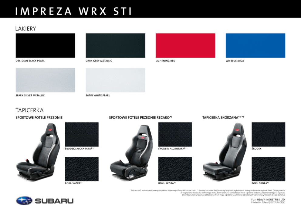 I M P RE Z A W R X S TI LAKIERY Obsidian Black Pearl Dark Grey Metallic Spark Silver Metallic Satin White Pearl Lightning Red WR Blue Mica TAPICERKA SPORTOWE FOTELE PRZEDNIE SPORTOWE FOTELE PRZEDNIE RECARO*3 TAPICERKA SKÓRZANA*2 *3 ŚRODEK: Alcantara®* 1 ŚRODEK: Alcantara®* 1 ŚRODEK BOKI: SKÓRA* 2 BOKI: SKÓRA* 2 BOKI: SKÓRA* 2 *1 Alcantara® jest zarejestrowanym znakiem towarowym firmy Alcantara S.p.A. *2 Syntetyczna skóra (PVC) może być użyta dla wykończenia pewnych obszarów tapicerki foteli. *3 Opcjonalnie. Ze względu na stosowaną technologię druku, kolor lakieru na samochodzie może się różnić od koloru prezentowanego na wydruku. Dodatkowo, kolory lakieru oraz tapicerka foteli mogą się różnić w zależności od lokalnych warunków rynkowych danego państwa. FUJI HEAVY INDUSTRIES LTD. Printed in Poland (10GTPLPL-01CC)