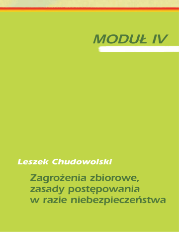 MODUŁ IV Leszek Chudowolski Zagrożenia zbiorowe, zasady postępowania w razie niebezpieczeństwa ZAGROŻENIA ZBIOROWE... MODUŁ IV TEMAT: Zagrożenia zbiorowe, zasady postępowania w razie niebezpieczeństwa PRZEZNACZONY DLA: uczniów gimnazjum CZAS REALIZACJI: 5 godzin lekcyjnych POZIOM WIEDZY POCZĄTKOWEJ: wiadomości i umiejętności z zakresu szkoły podstawowej POMOCE DYDAKTYCZNE: – – – – – komputer z oprogramowaniem biurowym, rzutnik pisma, foliogramy, prezentacje, karty pracy ucznia CELE EDUKACYJNE: Po zakończeniu zajęć uczeń gimnazjum powinien: – mieć świadomość zagrożeń pożarowych, – racjonalnie zachować się w przypadku pożaru, – mieć świadomość zagrożeń związanych z hałasem, – znać metody ochrony przed hałasem, – mieć świadomość zagrożeń związanych z żywiołami, – znać procedury postępowania w czasie klęsk, katastrof, – mieć świadomość zagrożeń związanych ze skażeniami, radiologicznym, biologicznym, – znać metody ochrony przed skażeniami, – mieć świadomość zagrożeń związanych z agresją, terroryzmem, – rozwijać postawy tolerancji wobec inności, – racjonalnie zachować się w przypadku ataku terrorystycznego. TREŚCI: 1. Zagrożenie pożarowe • najczęstsze przyczyny powstawania pożarów i ich rozprzestrzeniania się. • czynniki decydujące o zagrożeniu życia w czasie pożaru. • ogólne wskazania ograniczające zagrożenie pożarowe. • rodzaje pożarów. 198 MODUŁ IV 2. Zagrożenie hałasem • drgania akustyczne. • ciśnienie akustyczne. • natężenie dźwięku. • zapoznanie uczniów z ujemnym wpływem hałasu na organizm człowieka. 3. Klęski żywiołowe • powódź. • trzęsienia ziemi. • wiatry. • lawiny. 4. Skażenia: toksyczne, radiologiczne, biologiczne • niebezpieczne substancje chemiczne. • zasady postępowania przy skażeniu substancjami toksycznymi. • skażenie radiologiczne (promieniotwórcze). • sposoby ochrony przed napromieniowaniem. • skażenie biologiczne. • zasady postępowania przy zagrożeniu skażeniem biologicznym. 5. Zagrożenia terrorystyczne • terroryzm. • jak się chronić przed agresją? • instrukcja alarmowa – zasady postępowania. . SPIS JEDNOSTEK LEKCYJNYCH L.p. Jednostka lekcyjna Metoda nauczania Czas realizacji 1. Zagrożenie pożarowe. Pogadanka, praca w grupach 45 min. 2. Zagrożenie hałasem. Pogadanka, praca w grupach 45 min. 3. Klęski żywiołowe. Pogadanka, praca w grupach 45 min. 4. Skażenia toksyczne, radiologiczne, biologiczne. Pogadanka, praca w grupach 45 min. 5. Zagrożenia terrorystyczne. Pogadanka, praca w grupach 45 min. 199 ZAGROŻENIA ZBIOROWE... LITERATURA: 1. Ciemiński W., Bezpieczeństwo pożarowe, praktyczny poradnik, Skierniewice, 1998. 2. Mączyński N., Poradnik metodyczny−Technika i wychowanie komunikacyjne, 2000. 3. http://panda.bg.univ.gda.pl/~triss/relacje.html 4. Kozłowski S., Granice przystosowania, 1986r. 5. Engel Z., Ochrona środowiska przed drganiami i hałasem, Warszawa, PWN 1993. 6. Kaczmarska−Kozłowska A., Kotarbińska E., Koton J., Mikulski W., Żera J., Hałas, CIOP 2000. 7. http://viva.eko.org.pl/ 8. http://wiem.onet.pl/ 9. Encyklopedia PWN, 1996. 10. Adamczyk G., Breitkopf B., Worwa. Z., Obrona cywilna, WSiP, Warszawa 1999. 11. http://polityka.onet.pl/artykul.asp?DB=162&ITEM=1021082 12. Kozłowski St., Granice przystosowania, WP, Warszawa 1986. 13. Adamczyk G., Breitkopf B., Worwa Z., Obrona cywilna, WSiP, Warszawa 1999. 14. Smolski R., Smolski M., Stadtmüller E., Słownik Encyklopedyczny Edukacja Obywatelska, 1999. 15. http://www.kaan123.republika.pl/sz1.html 16. http://www.pzh.gov.pl/ Autor: KCdsAIDS 17. http://bse.pl/ 18. Rembowski J., Empatia. Studium psychologiczne, PWN Warszawa 1989 19. http://www.kram.katowice.pl./terroryzm/ 20. http://www.ariadna.pl/hrb/bomba.htm 21. http://www.kgp.gov.pl/. 200