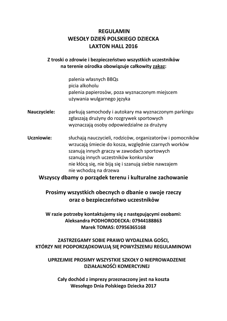 REGULAMIN WESOŁY DZIEŃ POLSKIEGO DZIECKA LAXTON HALL 2016 Z troski o zdrowie i bezpieczeństwo wszystkich uczestnikὀw na terenie ośrodka obowiązuje całkowity zakaz: palenia własnych BBQs picia alkoholu palenia papierosὀw, poza wyznaczonym miejscem używania wulgarnego języka Nauczyciele: parkują samochody i autokary ma wyznaczonym parkingu zgłaszają drużyny do rozgrywek sportowych wyznaczają osoby odpowiedzialne za drużyny Uczniowie: słuchają nauczycieli, rodzicὀw, organizatorὀw i pomocnikὀw wrzucają śmiecie do kosza, względnie czarnych workὀw szanują innych graczy w zawodach sportowych szanują innych uczestnikὀw konkursὀw nie kłὀcą się, nie biją się i szanują siebie nawzajem nie wchodzą na drzewa Wszyscy dbamy o porządek terenu i kulturalne zachowanie Prosimy wszystkich obecnych o dbanie o swoje rzeczy oraz o bezpieczeństwo uczestnikὀw W razie potrzeby kontaktujemy się z następującymi osobami: Aleksandra PODHORODECKA: 07944188863 Marek TOMAS: 07956365168 ZASTRZEGAMY SOBIE PRAWO WYDALENIA GOṠCI, KTÓRZY NIE PODPORZĄDKOWUJĄ SIĘ POWYŻSZEMU REGULAMINOWI UPRZEJMIE PROSIMY WSZYSTKIE SZKOŁY O NIEPROWADZENIE DZIAŁALNOŚĆI KOMERCYJNEJ Cały dochὀd z imprezy przeznaczony jest na koszta Wesołego Dnia Polskiego Dziecka 2017
