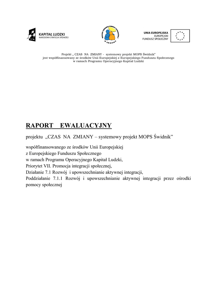 Projekt „ CZAS NA ZMIANY - systemowy projekt MOPS Świdnik” jest współfinansowany ze środków Unii Europejskiej z Europejskiego Funduszu Społecznego w ramach Programu Operacyjnego Kapitał Ludzki RAPORT EWALUACYJNY projektu „CZAS NA ZMIANY – systemowy projekt MOPS Świdnik” współfinansowanego ze środków Unii Europejskiej z Europejskiego Funduszu Społecznego w ramach Programu Operacyjnego Kapitał Ludzki, Priorytet VII. Promocja integracji społecznej, Działanie 7.1 Rozwój i upowszechnianie aktywnej integracji, Poddziałanie 7.1.1 Rozwój i upowszechnianie aktywnej integracji przez ośrodki pomocy społecznej 2 1. Wprowadzenie. Prezentowany raport stanowi podsumowanie badania ewaluacyjnego projektu „CZAS NA ZMIANY – systemowy projekt MOPS Świdnik” współfinansowanego ze środków Unii Europejskiej z Europejskiego Funduszu Społecznego w ramach Programu Operacyjnego Kapitał Ludzki, Priorytet VII. Promocja integracji społecznej, Działanie 7.1 Rozwój i upowszechnianie aktywnej integracji, Poddziałanie 7.1.1 Rozwój i upowszechnianie aktywnej integracji przez ośrodki pomocy społecznej. Dokument przedstawia ocenę realizacji w/w projektu w kontekście zasadności kontynuowania wsparcia w kolejnym okresie programowania. Raport przygotowano na podstawie jakościowej i ilościowej analizy dokumentów projektowych oraz przeprowadzonych wywiadów środowiskowych. Projekt „CZAS NA ZMIANY – systemowy projekt MOPS Świdnik” był realizowany w okresie 1.05.2008r. – 31.12.2014r. i skierowany do świadczeniobiorców Miejskiego Ośrodka Pomocy Społecznej w Świdniku, szczególnie narażonych na zjawisko wykluczenia społecznego z powodu bezrobocia, bezradności życiowej, niewydolności wychowawczej, niepełnosprawności czy też uzależnień. W dniu 18 lipca 2008r. zawarto Umowę Ramową pomiędzy Samorządem Województwa Lubelskiego a Gminą Miejską Świdnik na realizację projektu „CZAS NA ZMIANY – systemowy projekt MOPS Świdnik”. W dniu 25.03.2013r. aneksem do Umowy Ramowej ustalono termin zakończenia projektu na dzień 30.06.2015r. Realizacja projektu była zgodna z Programem Operacyjnym Kapitał Ludzki, przyjętym Planem Działania na lata 2007-2015, Strategią Rozwoju Województwa Lubelskiego na lata 2006-2020 oraz Gminną Strategią Rozwiązywania Problemów Społecznych ze szczególnym uwzględnieniem programów pomocy społecznej w latach 2005-2020. 2. Grupa docelowa projektu. W projekcie „CZAS NA ZMIANY – systemowy projekt MOPS Świdnik” w latach 2008-2014 wzięło udział 208 osób posiadających status świadczeniobiorcy Miejskiego Ośrodka Pomocy Społecznej w Świdniku. W 72% uczestnikami projektu były kobiety, a w 97% wszystkich uczestników projektu stanowiły osoby bezrobotne. 3 Tab.1 Uczestnicy projektu z uwzględnieniem podziału na płeć oraz status na rynku pracy. Status na rynku pracy / Płeć Kobiety Mężczyźni Ogółem Osoby bezrobotne 148 54 202 Osoby zatrudnione 0 1 1 Osoby niepełnosprawne 1 4 5 149 59 208 Ogółem Dane GUS oraz Wojewódzkiego Urzędu Pracy w Lublinie począwszy od 2008 roku wskazywały na narastający problem bezrobocia w powiecie świdnickim. Analizując dane można zaobserwować wyższe wskaźniki bezrobocia w powiecie świdnickim od średniej województwa i kraju. Tab.2 Stopa bezrobocia w powiecie świdnickim z uwzględnieniem średniej krajowej i województwa oraz bezrobotnych świadczeniobiorców MOPS w Świdniku w latach 2008-20141 Rok/stopa Średnia kraju bezrobocia Średnia Średnia powiatu Bezrobotni województwa świadczeniobiorcy MOPS w Świdniku 2008 9,5 % 11,3 % 13,1 % 53,7 % 2009 12,1 % 12,8 % 13,1 % 46,5 % 2010 12,4 % 13,6 % 15,7 % 38,0 % 2011 12,5 % 13,3 % 15,3 % 39,9 % 2012 13,4 % 14,1 % 14,9 % 52,0 % 2013 13,4 % 14,4 % 15,7 % 51,1 % 2014/I pół. 11,9 % 12,8 % 14,8 % 48,2 % 1 Dane pochodzą ze strony www.MPiPS.gov.pl/analizy-i-raporty/bezrobocie rejestrowane w Polsce/ 4 Bezrobotni świadczeniobiorcy MOPS w Świdniku stanowią prawie połowę ogółu osób objętych wsparciem. Uczestników projektu ponadto charakteryzował niski poziom kwalifikacji zawodowych lub posiadanie zdezaktualizowanych umiejętności zawodowych, utrudniających znalezienie pracy i usamodzielnienie finansowe od środków pomocy społecznej. Prawie 25% uczestników projektu nie posiadało żadnych kwalifikacji i umiejętności zawodowych a w 62% osoby legitymowały się niskim wykształceniem zasadniczym lub średnim ogólnym z ograniczoną możliwością podjęcia aktywności zawodowej. Tab.3 Uczestnicy projektu z uwzględnieniem podziału na płeć i wykształcenie Wykształcenie / Płeć Kobiety Mężczyźni Ogółem Podstawowe, gimnazjalne lub niższe Zasadnicze zawodowe lub średnie Pomaturalne 37 14 51 (24,6%) 88 41 129 (62,0%) 12 3 15 (7,0%) Wyższe 12 1 13 (6,4%) Ogółem 149 59 208 (100,0%) Wtórnym skutkiem bezrobocia jest zubożenie, narastanie zjawisk patologii społecznej, przyjmowanie nieprawidłowych postaw życiowych a w szczególności kryzys rodziny skutkujący rozpadem struktury rodzinnej, niewydolnością wychowawczą i degradacją młodego pokolenia. Analiza przeprowadzonych wywiadów środowiskowych oraz wstępnych ankiet ewaluacyjnych wskazuje u uczestników projektu na trudności w funkcjonowaniu społeczno-rodzinnym, trudności w przyjmowaniu prawidłowych norm społecznych, zaburzenia motywacyjne i bezradność wobec trudnej sytuacji rodzinnej (np. przewlekłej choroby członka rodziny, problemu uzależnienia członka rodziny, przemocy domowej itp.) Połowa uczestniczek projektu samotnie wychowuje dzieci natomiast rodziny pełne lub osoby samotne charakteryzowały w większości przypadków problemy rodzinne („rodzina rekonstruowana”, stan po rozwodzie, separacja, niesformalizowany rozpad związku itp.). Skutkowało to również problemami w sferze wychowawczej oraz licznymi zaburzeniami w codziennym wypełnianiu roli rodzicielskim. 5 Tab.4 Uczestnicy projektu z uwzględnieniem 