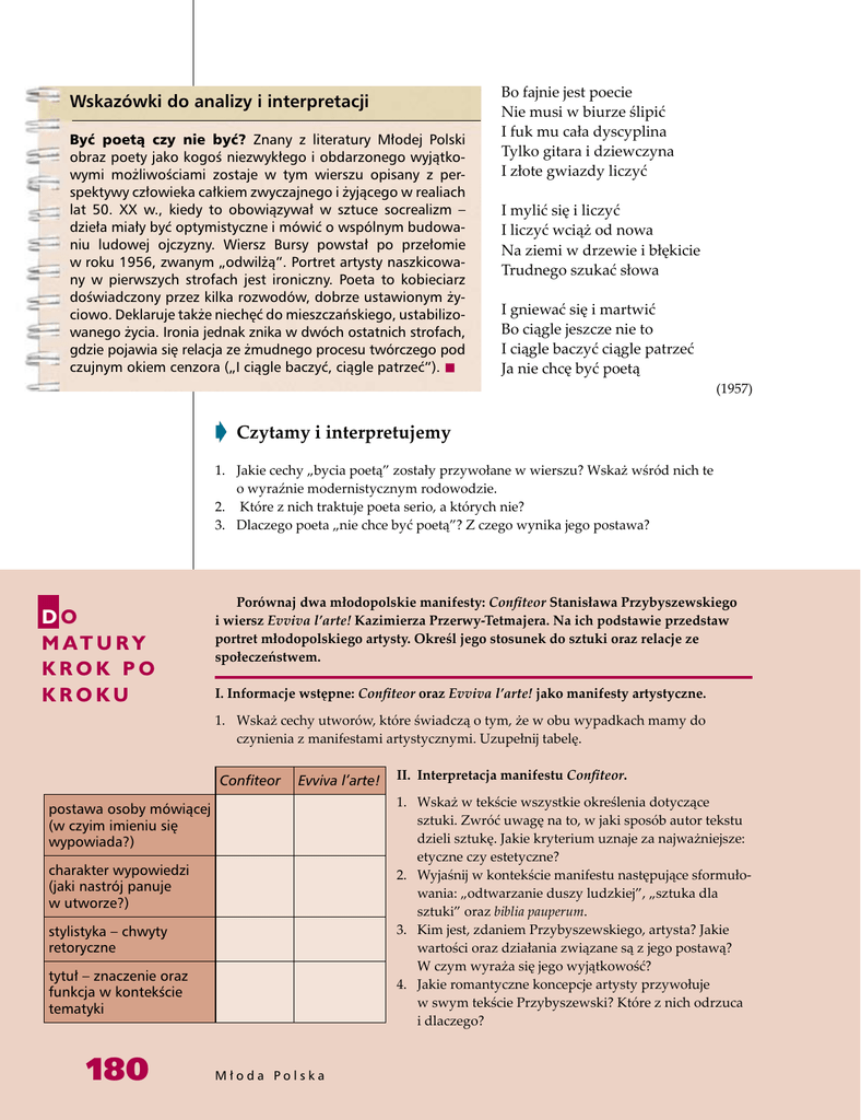 Wskazówki do analizy i interpretacji Być poetą czy nie być? Znany z literatury Młodej Polski obraz poety jako kogoś niezwykłego i obdarzonego wyjątkowymi możliwościami zostaje w tym wierszu opisany z perspektywy człowieka całkiem zwyczajnego i żyjącego w realiach lat 50. XX w., kiedy to obowiązywał w sztuce socrealizm – dzieła miały być optymistyczne i mówić o wspólnym budowaniu ludowej ojczyzny. Wiersz Bursy powstał po przełomie w roku 1956, zwanym „odwilżą”. Portret artysty naszkicowany w pierwszych strofach jest ironiczny. Poeta to kobieciarz doświadczony przez kilka rozwodów, dobrze ustawionym życiowo. Deklaruje także niechęć do mieszczańskiego, ustabilizo wanego życia. Ironia jednak znika w dwóch ostatnich strofach, gdzie pojawia się relacja ze żmudnego procesu twórczego pod czujnym okiem cenzora („I ciągle baczyć, ciągle patrzeć”). n Bo fajnie jest poecie Nie musi w biurze ślipić I fuk mu cała dyscyplina Tylko gitara i dziewczyna I złote gwiazdy liczyć I mylić się i liczyć I liczyć wciąż od nowa Na ziemi w drzewie i błękicie Trudnego szukać słowa I gniewać się i martwić Bo ciągle jeszcze nie to I ciągle baczyć ciągle patrzeć Ja nie chcę być poetą (1957) , Czytamy i interpretujemy 1. Jakie cechy „bycia poetą” zostały przywołane w wierszu? Wskaż wśród nich te o wyraźnie modernistycznym rodowodzie. 2. Które z nich traktuje poeta serio, a których nie? 3. Dlaczego poeta „nie chce być poetą”? Z czego wynika jego postawa? Do m at u ry krok po kroku Porównaj dwa młodopolskie manifesty: Confiteor Stanisława Przybyszewskiego i wiersz Evviva l’arte! Kazimierza Przerwy-Tetmajera. Na ich podstawie przedstaw portret młodopolskiego artysty. Określ jego stosunek do sztuki oraz relacje ze społeczeństwem. I. Informacje wstępne: Confiteor oraz Evviva l’arte! jako manifesty artystyczne. 1. Wskaż cechy utworów, które świadczą o tym, że w obu wypadkach mamy do czynienia z manifestami artystycznymi. Uzupełnij tabelę. Confiteor Evviva l’arte! 1. Wskaż w tekście wszystkie określenia dotyczące sztuki. Zwróć uwagę na to, w jaki sposób autor tekstu dzieli sztukę. Jakie kryterium uznaje za najważniejsze: etyczne czy estetyczne? 2. Wyjaśnij w kontekście manifestu następujące sformułowania: „odtwarzanie duszy ludzkiej”, „sztuka dla sztuki” oraz biblia pauperum. 3. Kim jest, zdaniem Przybyszewskiego, artysta? Jakie wartości oraz działania związane są z jego postawą? W czym wyraża się jego wyjątkowość? 4. Jakie romantyczne koncepcje artysty przywołuje w swym tekście Przybyszewski? Które z nich odrzuca i dlaczego? postawa osoby mówiącej (w czyim imieniu się wypowiada?) charakter wypowiedzi (jaki nastrój panuje w utworze?) stylistyka – chwyty retoryczne tytuł – znaczenie oraz funkcja w kontekście tematyki 180 II. Interpretacja manifestu Confiteor. Młoda Polska 5. Na podstawie manifestu zdefiniuj pojęcie narodu. Określ związek narodu z artystą. Jak należy rozumieć powinności artysty wobec narodu? III. Interpretacja wiersza Evviva l’arte. 1. Na podstawie utworu podaj cechy młodopolskiego artysty. a) Zinterpretuj fragmenty mówiące o egzystencji artysty, np.: „kto pieniędzy nie ma, jest pariasem”, „nędza porywa za gardło i dusi”. b) Zinterpretuj fragmenty mówiące o związku artysty ze sztuką, np.: „W piersiach naszych płoną / ognie przez Boga samego włożone”. c) Na podstawie punktów a) i b) określ artystę. Czy jest to dekadent? Odpowiedź uzasadnij. 2. Zinterpretuj ukazany w utworze obraz społeczeństwa. a) Wyjaśnij znaczenie słowa „filister”. b) Określ, jakie miejsce w hierarchii społecznej zajmuje artysta. c) Jaką postawę przyjmuje artysta? Możesz wybrać z poniższych propozycji lub zaproponować własne. bunt n pogarda n duma n samotność n cierpienie n pokora n wyniosłość, która podkreśla indywidualizm n wyjątkowość artysty n akceptacja 3. Uzasadnij krótko na podstawie utworu, że sztuka jest wartością najwyższą. Co artysta dzięki niej zyskuje? Zwróć uwagę na porównanie: „ale jak orły z skrzydły złamanemi”. Zastanów się, czy dzięki sztuce artysta jest szczęśliwy. 1. Zestaw wnioski wynikające z interpretacji obu utworów. W tym celu uzupełnij tabelę. 2. Przywołując informacje z tekstu Bożeny Sadkowskiej Homo dandys (zob. s. #), uzasadnij, że artysta w obu omawianych tekstach nosi cechy dandysa. V. Przywołanie odpowiednich kontekstów. Confiteor Evviva l’arte! cechy artysty postawa artysty wobec sztuki zadania artysty Wnioski IV. Interpretacja porównawcza. podobieństwa różnice 1. Krótko przedstaw wizerunek artysty w literaturze wcześniejszych epok, przywołaj właściwe utwory (w tym klasyczne i romantyczne). W którym z nich odnajdujesz horacjański motyw Non omnis moriar? 2. Korzystając z informacji wprowadzających do rozdziału Być artystą (zob. s. #), wyjaśnij następujące pojęcia: „artysta przeklęty”, „estetyka nowoczesności”, „forpoczta”. 3. Jaki dostrzegasz związek między nowym wizerunkiem artysty a powstaniem kultury masowej? 4. Określ związek między filozofią Schopenhauera i Nietzschego a kreacją artysty młodopolskiego. VI. Wnioski. 1. Skonfrontuj postawę młodopolskiego artysty i jego podejście do sztuki oraz stosunek do społeczeństwa z przywołanymi kontekstami historycznoliterackimi (koncepcją poety klasycznego oraz romantycznego), światopoglądem i filozofią Młodej Polski. 2. Zastanów się, czy sztuka rzeczywiście traci swoją moc, gdy jest na usługach etyki i moralności. 3. Jak oceniasz młodopolskie hasło: „sztuka dla sztuki”? Czy ucieczka w sztukę okazała się właściwym lekarstwem na cierpienie? Zwróć uwagę na reakcje antyartystowskie (zob. s. #). A może wizerunek młodopolskiego artysty jest niejednoznaczny i złożony? Uzasadnij swoje stanowisko. VI. Napisz wypracowanie na główny temat. 