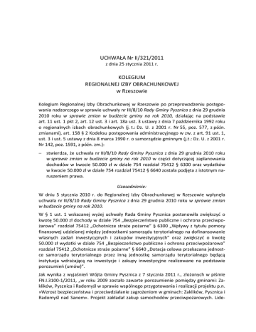 UCHWAŁA Nr II/321/2011 z dnia 25 stycznia 2011 r. KOLEGIUM REGIONALNEJ IZBY OBRACHUNKOWEJ w Rzeszowie Kolegium Regionalnej Izby Obrachunkowej w Rzeszowie po przeprowadzeniu postępowania nadzorczego w sprawie uchwały nr III/8/10 Rady Gminy Pysznica z dnia 29 grudnia 2010 roku w sprawie zmian w budżecie gminy na rok 2010, działając na podstawie art. 11 ust. 1 pkt 2, art. 12 ust. 3 i art. 18a ust. 3 ustawy z dnia 7 października 1992 roku o regionalnych izbach obrachunkowych (j. t.: Dz. U. z 2001 r. Nr 55, poz. 577, z późn. zmianami), art. 158 § 2 Kodeksu postępowania administracyjnego w zw. z art. 91 ust. 1, ust. 3 i ust. 5 ustawy z dnia 8 marca 1990 r. o samorządzie gminnym (j.t.: Dz. U. z 2001 r. Nr 142, poz. 1591, z późn. zm.): − stwierdza, że uchwała nr III/8/10 Rady Gminy Pysznica z dnia 29 grudnia 2010 roku w sprawie zmian w budżecie gminy na rok 2010 w części dotyczącej zaplanowania dochodów w kwocie 50.000 zł w dziale 754 rozdział 75412 § 6300 oraz wydatków w kwocie 50.000 zł w dziale 754 rozdział 75412 § 6640 została podjęta z istotnym naruszeniem prawa. Uzasadnienie: W dniu 5 stycznia 2010 r. do Regionalnej Izby Obrachunkowej w Rzeszowie wpłynęła uchwała nr III/8/10 Rady Gminy Pysznica z dnia 29 grudnia 2010 roku w sprawie zmian w budżecie gminy na rok 2010. W § 1 ust. 1 wskazanej wyżej uchwały Rada Gminy Pysznica postanowiła zwiększyć o kwotę 50.000 zł dochody w dziale 754 „Bezpieczeństwo publiczne i ochrona przeciwpożarowa” rozdział 75412 „Ochotnicze straże pożarne” § 6300 „Wpływy z tytułu pomocy finansowej udzielanej między jednostkami samorządu terytorialnego na dofinansowanie własnych zadań inwestycyjnych i zakupów inwestycyjnych” oraz zwiększyć o kwotę 50.000 zł wydatki w dziale 754 „Bezpieczeństwo publiczne i ochrona przeciwpożarowa” rozdział 75412 „Ochotnicze straże pożarne” § 6640 „Dotacja celowa przekazana jednostce samorządu terytorialnego przez inną jednostkę samorządu terytorialnego będącą instytucja wdrażającą na inwestycje i zakupy inwestycyjne realizowane na podstawie porozumień (umów)”. Jak wynika z wyjaśnień Wójta Gminy Pysznica z 7 stycznia 2011 r., złożonych w piśmie FN.I.3100-1/2011, „w roku 2009 zostało zawarte porozumienie pomiędzy gminami: Zaklików, Pysznica i Radomyśl w sprawie wspólnego przygotowania i realizacji projektu p.n. »Wzrost bezpieczeństwa i przeciwdziałanie zagrożeniom w gminach: Zaklików, Pysznica i Radomyśl nad Sanem«. Projekt zakładał zakup samochodów przeciwpożarowych. Lide- rem porozumienia została gmina Zaklików, dofinansowanie projektu zadeklarował Powiat Stalowowolski, który uchwałą nr L/344/10 z dnia 5 listopada 2010 r. udzielił pomocy finansowej gminom: Zaklików, Pysznica i Radomyśl nad Sanem w łącznej kwocie 150.000,00 zł, tj. po 50.000 zł dla każdej gminy. Powyższe środki wpłynęły do Gminy Pysznica i z tego tytułu zwiększamy budżet zgodnie z celem określonym z Powiatem”. Z załączonej uchwały Rady Powiatu Stalowowolskiego z 5 listopada 2010 r. nr L/344/10 zmieniającej uchwałę w sprawie udzielenia pomocy finansowej dla innych jednostek samorządu terytorialnego wynika, że powiat dokonał zmiany uchwały własnej nr XLVI/313/10 z 29 czerwca 2010 r., poprzez zmniejszenie o kwotę 20.000 zł pomocy finansowej dla gminy Zaklików i przeznaczenie jej na zadanie „Wykonanie konserwacji rowu B na długości 1.800 mb w miejscowości Lipa”. Wskazaną uchwałą nie dokonano zmian pomocy finansowej dotyczącej zadania „Wzrost bezpieczeństwa i przeciwdziałanie zagrożeniom w Gminach Zaklików, Pysznica, Radomyśl nad Sanem”. Pomoc finansowa na to zadanie określona została w § 1 ust. 3.1. uchwały Rady Powiatu Stalowowolskiego z 29 czerwca 2010 r. nr XLVI/313/10 w sprawie udzielenia pomocy finansowej dla innych jednostek samorządu terytorialnego. Z uchwały tej wynika, że pomoc finansowa w kwocie 150.000 zł udzielana jest gminie Zaklików. W dniu 29 czerwca 2010 r. pomiędzy Powiatem Stalowowolskim a Gminą Zaklików zawarta została umowa nr BF/16/2010, zgodnie z którą (§ 1 ust. 1 pkt 2) powiat udzieli tej gminie pomocy finansowej w kwocie 150.000 zł z przeznaczeniem na zadanie „Wzrost bezpieczeństwa i przeciwdziałanie zagrożeniom w Gminach Zaklików, Pysznica, Radomyśl nad Sanem”. Jak wynika z powyższych ustaleń Powiat Stalowowolski nie udzielił w roku 2010 pomocy finansowej w kwocie 50.000 zł gminie Pysznica. Pomoc finansowa na wskazane wyżej zadanie w kwocie 150.000 zł została w całości udzielona Gminie Zaklików. Kolegium Regionalnej Izby Obrachunkowej w Rzeszowie zważyło, co następuje: Stosownie do treści przepisu art. 216 ust. 2 pkt 5 ustawy z 27 sierpnia 2009 r. o finansach publicznych (Dz. U. Nr 157, poz. 1240, z późn. zm.) wydatki budżetu jednostki samorządu terytorialnego są przeznaczone na realizację zadań określonych w odrębnych przepisach, a w szczególności na pomoc rzeczową lub finansową dla innych jednostek samorządu terytorialnego, określoną odrębną uchwałą przez organ stanowiący jednostki samorządu terytorialnego. Natomiast zgodnie z przepisem art. 220 ust. 1 ustawy o finansach publicznych z budżetu jednostki samorządu terytorialnego może być udzielona innym jednostkom samorządu terytorialnego pomoc finansowa w formie dotacji celowej lub pomoc rzeczowa, a w myśl ust. 2 – podstawą udzielenia pomocy, o której mowa w ust. 1, jest umowa. Z powyższego wynika, że aby Powiat Stalowowolski mógł udzielić Gminie Pysznica pomocy finansowej organ stanowiący powiatu musiałby podjąć odpowiednią uchwałę o udzieleniu tej pomocy, zaplanować wydatek w budżecie, a ostatecznie podstawą udzielenia pomocy byłaby stosowna umowa. Ponieważ Powiat Stalowowolski w roku 2010 nie podjął uchwały w sprawie udzielenia pomocy finansowej Gminy Pysznica na wskazane zadanie, nie zaplanował wydatku z tego tytułu we w