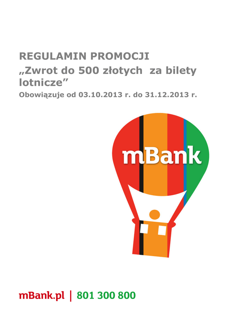 REGULAMIN PROMOCJI „Zwrot do 500 złotych za bilety lotnicze” Obowiązuje od 03.10.2013 r. do 31.12.2013 r. I. Organizator Promocji 1. Promocja „Zwrot do 500 złotych za bilety lotnicze”, zwana dalej Promocją organizowana jest przez BRE Bank SA – mBank z siedzibą w Warszawie przy ul. Senatorskiej 18, wpisany do rejestru przedsiębiorców Krajowego Rejestru Sądowego przez Sąd Rejonowy dla m.st. Warszawy, XII Wydział Gospodarczy Krajowego Rejestru Sądowego pod numerem KRS 0000025237, posiadający numer identyfikacji podatkowej NIP: 526-021-50-88, o wpłaconym w całości kapitale zakładowym, którego wysokość wg stanu na dzień 01.01.2013 r. wynosi 168 555 904 zł zwany dalej „mBankiem” lub „Organizatorem”. 2. Do zadań Organizatora należy bieżące nadzorowanie, czy w związku z przebiegiem Promocji nie powstaje zagrożenie wystąpienia konfliktów interesów pomiędzy mBankiem a pracownikami mBanku lub Klientami mBanku. 3. BRE Bank SA jest administratorem danych osobowych Uczestników Promocji w rozumieniu przepisów ustawy z dnia 29 sierpnia 1997 r. o ochronie danych osobowych i przetwarza je w zakresie i celu przeprowadzenia niniejszej Promocji. 4. Uczestnikowi Promocji przysługuje prawo dostępu do dotyczących go danych osobowych oraz ich poprawiania, a także prawo żądania usunięcia danych osobowych przetwarzanych przez Organizatora, w związku z niniejszą Promocją. II. Objaśnienie pojęć W treści niniejszego Regulaminu użyte poniżej określenia oznaczają: 1. Karta – główna karta kredytowa MasterCard Miles & More lub Visa Miles & More wydana przez mBank z minimalnym limitem 3 000 zł. 2. Nagroda - kwota pieniężna, jednorazowo wypłacana Uczestnikowi Promocji za zakup biletu lotniczego, po spełnieniu warunków opisanych w niniejszym Regulaminie. 3. Rachunek Karty - rachunek kredytowy w złotych, służący do rejestracji transakcji oraz spłaty zadłużenia Karty. 4. Uczestnik Promocji – osoba fizyczna, która w okresie trwania Promocji jest posiadaczem Rachunku Karty, spełniająca wszystkie warunki uczestnictwa w Promocji, określone w niniejszym Regulaminie. 5. Umowa Karty – oznacza Umowę o korzystanie z karty kredytowej mBanku, w ramach której wydana została Karta. 6. Zlecenie Wypłaty Nagrody – zgłoszenie, w terminie o jakim mowa w rozdziale V punkcie 1, wniosku o wypłatę nagrody z tytułu dokonania transakcji, o której mowa w rozdziale V punkcie 1 niniejszego Regulaminu złożone przez Uczestnika Promocji za pośrednictwem mLinii lub samodzielnie w serwisie transakcyjnym mBanku. Wypłata Nagrody – uznanie Rachunku Karty Nagrodą. III. Czas trwania Promocji 1. Promocja rozpoczyna się w dniu 03 października 2013 roku i trwa do dnia 31 grudnia 2013 roku. 2. Warunkiem skorzystania z Promocji objętej niniejszym Regulaminem, poza warunkami wynikającymi z pkt IV. i V. niniejszego Regulaminu, jest dokonanie przez Uczestnika Promocji zakupu kuponu udostępnionego na stronie www.groupon.pl, uprawniającego do złożenia wniosku o Kartę. IV. Uczestnictwo w promocji 1. Aby stać się Uczestnikiem Promocji należy spełnić łącznie poniższe warunki: a) być pełnoletnią osoby fizyczną, która w okresie od dnia 03 października 2012 r. do dnia 03 października 2013 r. nie była stroną Umowy kredytu o korzystanie z karty kredytowej mBanku oraz na dzień rozpoczęcia niniejszej Promocji nie była w trakcie wnioskowania o wydanie jakiejkolwiek karty kredytowej mBanku, b) w momencie przystąpienia do Promocji nie posiadać wobec Organizatora wymagalnych zobowiązań finansowych, c) w okresie od dnia 03 października do dnia 13 października 2013 roku dokonać zakupu kuponu udostępnionego na stronie www.groupon.pl, uprawniającego do złożenia wniosku o Kartę, d) w okresie od dnia 03 października do dnia 18 października 2013 r. zrealizować kupon, poprzez złożenie wniosku o Kartę za pośrednictwem linku promocyjnego dostępnego w mailingu wysłanym przez www.groupon.pl, z zastrzeżeniem, że jeden Uczestnik może zrealizować tylko jeden kupon, e) wyrazić zgodę o treści określonej we wniosku, o którym mowa punkcie 1 lit d) powyżej, na obciążenia rachunku Karty, wydanej w oparciu o zawartą Umowę Kredytu o korzystanie z karty kredytowej mBanku wartością wypłaconej Nagrody, w przypadku zaistnienia, co najmniej jednej z poniższych okoliczności: i. rozwiązania Umowy kredytu o korzystanie z karty kredytowej mBanku wydanej w ramach niniejszej Promocji przed upływem 12 miesięcy od daty jej zawarcia, lub ii. zwrotu biletu lotniczego lub anulowania transakcji zakupu biletu lotniczego, za który została wypłacona nagroda, lub iii. wylot samolotem, na podstawie zakupionego biletu lotniczego, o jakim mowa w rozdziale V punkcie 1a), nastąpił po dniu 30 czerwca 2014 r. f) w przypadku wnioskowania o Kartę w ramach przeniesienia karty z innego banku, być posiadaczem karty kredytowej w innym banku oraz spełnić warunki regulaminu promocji „Przenieś kartę do mBanku”. Na potrzeby niniejszego Regulaminu za przeniesienie karty do mBanku nie uznaje się, przypadków przeniesienia karty kredytowej z MultiBanku i BRE Banku SA do mBanku. 2. Po pozytywnym rozpatrzeniu wniosku, o którym mowa w punkcie 1 lit d) powyżej, przez mBank, Uczestnikowi wydana zostanie Karta. Dla oceny uczestnictwa w Promocji uwzględniana będzie data zarejestrowania wniosku o Kartę główną w systemie mBanku. 3. Z Promocji wyłączeni są pracownicy Organizatora oraz osoby zatrudnione przez Organizatora na podstawie stosunku cywilnoprawnego, tj. osoby pozostające w stosunkach wynikających z umów zlecenia, z umów o dzieło, z kontraktów menadżerskich zawartych z Organizatorem oraz spółek zależnych Organizatora, w rozumieniu Kodeksu Spółek Handlowych. 4. mBank informuje, iż w dniu 03 października 2013 roku udostępnia 3 000 kuponów. Informacja o aktualnej ilości dostępnych jeszcze kuponów będzie publikowana na stronie