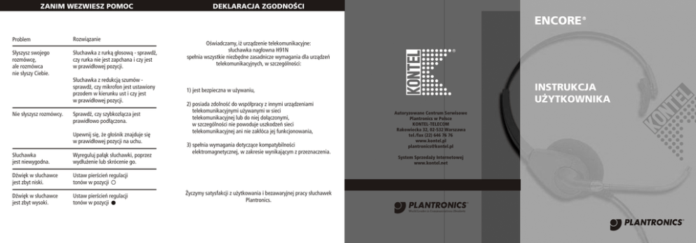 ZANIM WEZWIESZ POMOC DEKLARACJA ZGODNOŒCI ENCORE Problem Rozwi¹zanie S³yszysz swojego rozmówcê, ale rozmówca nie s³yszy Ciebie. S³uchawka z rurk¹ g³osow¹ - sprawdŸ, czy rurka nie jest zapchana i czy jest w prawid³owej pozycji. Nie s³yszysz rozmówcy. S³uchawka z redukcj¹ szumów sprawdŸ, czy mikrofon jest ustawiony przodem w kierunku ust i czy jest w prawid³owej pozycji. SprawdŸ, czy szybkoz³¹cza jest prawid³owo pod³¹czona. Upewnij siê, ¿e g³oœnik znajduje siê w prawid³owej pozycji na uchu. S³uchawka jest niewygodna. Wyreguluj pa³¹k s³uchawki, poprzez wyd³u¿enie lub skrócenie go. DŸwiêk w s³uchawce jest zbyt niski. Ustaw pierœcieñ regulacji tonów w pozycji DŸwiêk w s³uchawce jest zbyt wysoki. Ustaw pierœcieñ regulacji tonów w pozycji Oœwiadczamy, i¿ urz¹dzenie telekomunikacyjne: s³uchawka nag³owna H91N spe³nia wszystkie niezbêdne zasadnicze wymagania dla urz¹dzeñ telekomunikacyjnych, w szczególnoœci: INSTRUKCJA U¯YTKOWNIKA 1) jest bezpieczna w u¿ywaniu, 2) posiada zdolnoœæ do wspó³pracy z innymi urz¹dzeniami telekomunikacyjnymi u¿ywanymi w sieci telekomunikacyjnej lub do niej do³¹czonymi, w szczególnoœci nie powoduje uszkodzeñ sieci telekomunikacyjnej ani nie zak³óca jej funkcjonowania, 3) spe³nia wymagania dotycz¹ce kompatybilnoœci elektromagnetycznej, w zakresie wynikaj¹cym z przeznaczenia. ¯yczymy satysfakcji z u¿ytkowania i bezawaryjnej pracy s³uchawek Plantronics. Autoryzowane Centrum Serwisowe Plantronics w Polsce KONTEL-TELECOM Rakowiecka 32, 02-532 Warszawa tel./fax (22) 646 76 76 www.kontel.pl [email protected] System Sprzeda¿y Internetowej www.kontel.net DIAGRAM DIAGRAM Fig.1 Fig.2 DIAGRAM Fig.3 USTAWIENIE PA£¥KA S£UCHAWKI - Rys. 1-2 Aby ustawiæ pa³¹k, nale¿y rozci¹gaæ lub skracaæ go do momentu, a¿ bêdzie komfortowo dopasowany- Rys. 1 "Click-stop" zapewnia stabilne ustawienie pa³¹ka. Poduszki z g¹bki powinny byæ ustawione centralnie na uchu.W modelu na jedno ucho wspornik T-pad powinien znajdowaæ siênad uchem - Rys. 2 Fig.7 DIAGRAM Fig.7 SZYBKOZ£¥CZKA S³uchawki profesjonalne standardowo wyposa¿one s¹ w szybkoz³¹czkê - Rys. 10 Aby u¿ywaæ takiej s³uchawki nale¿y po³¹czyæ j¹ do telefonu poprzez odpowiedni adaptera lub kabla po³¹czeniowego. Aby podkreœliæ tony niskie, nale¿y ustawiæ pierœcieñ w pozycji oznaczonej Aby podkreœliæ tony wysokie, nale¿y ustawiæ pierœcieñ w pozycji oznaczonej - Rys. 7 Fig.8 Fig.8 USTAWIENIE MIKROFONU Model z rurk¹ g³osow¹- Rys. 3: Przytrzymuj¹c jedn¹ rêk¹ s³uchawkê przy uchu, drug¹ nale¿y ustawiæ rurkê g³osow¹ w odleg³oœci ok. 3cm od k¹cika ust. Aby rozmówca nie s³ysza³ Pañstwa oddechu nale¿y unikaæ ustawiania rurki g³osowej przed ustami Seria Encore H91, H101 INSTRUKCJA U¯YTKOWNIKA S£UCHAWKI Fig.4 Fig.5 MODELE POLARIS s¹ wyposa¿one w standardowe z³¹cze RJ-45 - Rys. 8 S³uchawki serii Polaris pod³¹czamy do portu s³uchawkowego w kompatybilnym aparacie telefonicznym. Fig.6 Opis s³uchawki: 1 2 3 4 5 6 Regulowany pa³¹k Wspornik T G³oœnik Poduszka z g¹bki Rurka g³osowa Szybkoz³¹czka 7 Klips do ubrania 8 Kabel s³uchawki 9 Regulacja tonów 10 Wysiêgnik 11 Obrotowa g³owica wysiêgnika 12 Mikrofon z redukcj¹ szumów Fig.9 Model z redukcj¹ szumów Rys. 4-5: Delikatnie, obiema d³oñmi nadaæ po¿¹dany kszta³t wysiêgnikowi mikrofonu -Ustawiæ wysiêgnik mikrofonu w takiej pozycji, aby mikrofon znajdowa³ siê o odleg³oœci ok. 3 cm od k¹cika ust. Nale¿y siê upewniæ, ¿e mikrofon jest ustawiony przodem w kierunku ust. Je¿eli jest to konieczne mo¿na delikatnie obróciæ mikrofon do w³aœciwej pozycji. Nale¿y unikaæ czêstego obracania mikrofonu. REGULACJA TONÓW Tony mo¿na regulowaæ poprzez obracanie pierœcieni przy g³oœniku - Rys. 8. Aby wyrównaæ brzmienie w obu g³oœnikach (w modelach na dwoje uszu), nale¿y ustawiæ oba pierœcienie w tej samej pozycji. KLIPS DO UBRANIA U³atwia pozycjonowanie s³uchawki na g³owie i uwalnia j¹ od ciê¿aru kabla. Klips przypinamy do ubrania na odpowiedniej dla nas wysokoœci - Rys. 9 TELEFONY DECT & GSM Aby u¿ywaæ s³uchawkê z telefonem DECT lub GSM, nale¿y u¿yæ konektora z wtykiem "mini Jack" 2,5mm, pod³¹czaj¹c go do portu s³uchawki nag³ownej w telefonie - Rys. 11