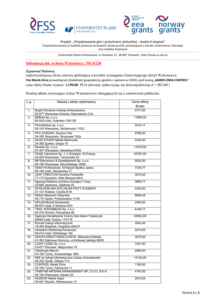 Projekt „Projektowanie gier i przestrzeni wirtualnej - studia II stopnia” Projekt finansowany ze środków funduszy norweskich i funduszy EOG, pochodzących z Islandii, Lichtensteinu i Norwegii oraz środków krajowych. Uniwersytet Śląski w Katowicach, ul. Bankowa 12, 40-007 Katowice, http://www.us.edu.pl Informacja dot. wyboru Wykonawcy: NR 61238 Szanowni Państwo, najkorzystniejszą ofertę cenową spełniającą wszystkie wymagania Zamawiającego złożył Wykonawca: Pan Marek Zima prowadzącym działalność gospodarczą zgodnie z wpisem w CEIDG, pod nazwą „MAREK ZIMA CONTROL” cena oferty brutto wynosi: 1.190,00 PLN (słownie: jeden tysiąc sto dziewięćdziesiąt zł + 00/100 ) Poniżej tabela zawierająca wykaz Wykonawców ubiegających się o zamówienie publiczne: L.p. 1. 2. Nazwa i adres wykonawcy Bright Solutions Andrzej Ambroziewicz 05-077 Warszawa-Wesoła, Mazowiecka 21A BZBnet Sp. z o.o. 90-520 Łódź, Gdańska 126/128 Cena oferty Brutto 4777,00 11685,00 3. PrimeMotion sp. z o.o. 00-140 Warszawa, Solidarności 115/2 3418,17 4. PPC EUROPA, Szymon Peć 34-205 Stryszowa, Stryszawa 742a Sm32 STUDIO Marek Machurski 34-300 Żywiec, Grapa 10 Ravelia Sp. z o.o. 01-447 Warszawa, Newelska 6/432 PAGE Interactive Sp. J. Ł.Grodecki, W.Prokop 02-023 Warszawa, Tarczyńska 22 MP Electronics & Dewelopment Sp. z o.o. 00-195 Warszawa, Słomińskiego 19/80 VENTI R.Wierzbicki, M.Rytych Spółka Jawna 93-192 Łódź, Senatorska 31 LEAF CREATIVE Karolina Podsiedlik 71-173 Szczecin, Wita Stwosza 6A/4 Agencja Reklamy eVictory-Grzegorz Tukaj 43-600 Jaworzno, Zabłocie 25 SPÓŁDZIELNIA SOCJALNA PIĄTY ELEMENT 31-121 Kraków, Czysta 8/18 MXnet Sławomir Olszyński 45-710 Opole, Prószkowska 11/24 APLAN Michał Wasilewski 90-637 Łódź, 6 Sierpnia 52/4 TROL INTERMEDIA Sp. z o.o. 64-510 Wronki, Poznańska 56 Agencja Interaktywna Czarny Kod Adam Trojańczyk 93465 Łódź, Dubois 114/116 Komart Usługi Informatyczne 15-354 Białystok, Pogodna 29A/27 24siedem Bartłomiej Konarczyk 90-012 Łódź, Kilińskiego 104 GRUPA KREATYWNA D’ARTE Milewska Elżbieta 41-300 Dąbrowa Górnicza, ul Królowej Jadwigi 28/93 LIGHT CODE Sp. z o.o. 53-677 Wroclaw, Nabycińska 19 Urbańczyk Marcin, 43-100 Tychy, Arctowskiego 1B/5 NSF.pl Usługi Informatyczne Łukasz Andrzejewski 45-222 Opole, Oleska 71A CONTROL Marek Zima 43-100 Tychy, Fabryczna 11 TRIMTAB ARTERIA MANAGEMENT SP. Z O.O. S.K.A. 00-193 Warszawa, Stawki 2A KADEOR Marek Najar 05-831 Rozalin, Rekreacyjna 14 9798,00 5. 6. 7. 8. 9. 10. 11. 12. 13. 14. 15. 16. 17. 18. 19. 20. 21. 22. 23. 24. 25. 2435,40 11070,00 20787,00 9225,00 7378,77 3075,00 3688,77 4305,00 8826,48 2400,00 6148,77 34932,00 3542,40 2414,00 3075,00 7257,00 2480,00 14145,00 1190,00 4797,00 2810,55 Strona 1 z 1