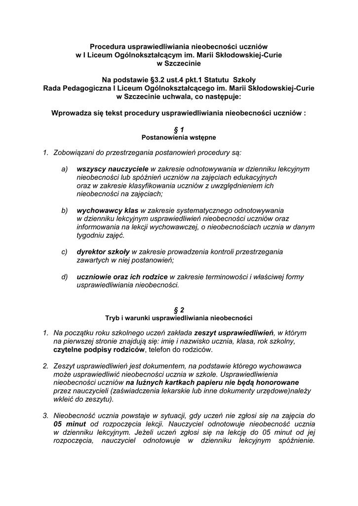 Procedura usprawiedliwiania nieobecności uczniów w I Liceum Ogólnokształcącym im. Marii Skłodowskiej-Curie w Szczecinie Na podstawie §3.2 ust.4 pkt.1 Statutu Szkoły Rada Pedagogiczna I Liceum Ogólnokształcącego im. Marii Skłodowskiej-Curie w Szczecinie uchwala, co następuje: Wprowadza się tekst procedury usprawiedliwiania nieobecności uczniów : §1 Postanowienia wstępne 1. Zobowiązani do przestrzegania postanowień procedury są: a) wszyscy nauczyciele w zakresie odnotowywania w dzienniku lekcyjnym nieobecności lub spóźnień uczniów na zajęciach edukacyjnych oraz w zakresie klasyfikowania uczniów z uwzględnieniem ich nieobecności na zajęciach; b) wychowawcy klas w zakresie systematycznego odnotowywania w dzienniku lekcyjnym usprawiedliwień nieobecności uczniów oraz informowania na lekcji wychowawczej, o nieobecnościach ucznia w danym tygodniu zajęć. c) dyrektor szkoły w zakresie prowadzenia kontroli przestrzegania zawartych w niej postanowień; d) uczniowie oraz ich rodzice w zakresie terminowości i właściwej formy usprawiedliwiania nieobecności. §2 Tryb i warunki usprawiedliwiania nieobecności 1. Na początku roku szkolnego uczeń zakłada zeszyt usprawiedliwień, w którym na pierwszej stronie znajdują się: imię i nazwisko ucznia, klasa, rok szkolny, czytelne podpisy rodziców, telefon do rodziców. 2. Zeszyt usprawiedliwień jest dokumentem, na podstawie którego wychowawca może usprawiedliwić nieobecności ucznia w szkole. Usprawiedliwienia nieobecności uczniów na luźnych kartkach papieru nie będą honorowane przez nauczycieli (zaświadczenia lekarskie lub inne dokumenty urzędowe)należy wkleić do zeszytu). 3. Nieobecność ucznia powstaje w sytuacji, gdy uczeń nie zgłosi się na zajęcia do 05 minut od rozpoczęcia lekcji. Nauczyciel odnotowuje nieobecność ucznia w dzienniku lekcyjnym. Jeżeli uczeń zgłosi się na lekcję do 05 minut od jej rozpoczęcia, nauczyciel odnotowuje w dzienniku lekcyjnym spóźnienie. 4. Usprawiedliwienia we właściwej formie wymaga każda nieobecność ucznia, na każdej godzinie zajęć lekcyjnych. 5. Jedyną osobą uprawnioną do odnotowania usprawiedliwienia w dzienniku lekcyjnym jest wychowawca klasy. 6. Warunkiem usprawiedliwienia nieobecności jest przekazanie wychowawcy odpowiednich dokumentów przez ucznia lub jego rodziców, pozwalające na usprawiedliwienie przyczyny nieobecności. 7. Dopuszcza się następujące formy usprawiedliwiania nieobecności: zaświadczenie wystawione przez fachowe służby medyczne o niezdolności do uczestniczenia w zajęciach; pisemną prośbę rodzica (lub pełnoletniego ucznia), zawierającą własnoręczny podpis, o usprawiedliwienie i zawierającą uzasadnienie nieobecności; zaświadczenie urzędowe wystawione przez organ sądowniczy, instytucję publiczną, itp. stwierdzające, że nieobecność ucznia wynikała z istotnych społecznie przyczyn; 8. Uczeń lub jego rodzice są zobowiązani do usprawiedliwienia nieobecności w terminie jednego tygodnia od dnia zakończenia nieobecności i nie później niż do drugiego dnia zajęć dydaktycznych w miesiącu następującym po powstaniu nieobecności i nie później niż do dnia poprzedzającego klasyfikacyjne posiedzenie rady pedagogicznej. 9. Usprawiedliwienie dostarczone po upływie 7 dni od daty udokumentowanej w dzienniku lekcyjnym nieobecności nie będzie uwzględnione a godziny będą odnotowane jako nieusprawiedliwione : 10. Jeżeli nieobecność ucznia trwa, w sposób ciągły, dłużej niż tydzień, uczeń lub jego rodzice mają obowiązek poinformowania wychowawcy danej klasy o przyczynach powstania tej nieobecności, a wychowawca klasy przedłuża termin usprawiedliwiania nieobecności do czasu powrotu ucznia na zajęcia lekcyjne. 11. Wychowawca może odmówić usprawiedliwienia nieobecności ucznia na podstawie zaświadczenia rodziców lub w przypadku ucznia pełnoletniego na jego wniosek, jeśli uzna, że podane przez nich powody są niewystarczające do usprawiedliwienia nieobecności: - uczeń opuścił 2 razy z rzędu ten sam przedmiot, - opuszcza te same dni w kolejnych dwóch tygodniach. 12. Nieobecności z powodu choroby, które nie zostały potwierdzone zaświadczeniem lekarskim , wychowawca może nie usprawiedliwić jeśli nieobecności obejmują więcej niż 5 kolejnych dni lub więcej niż 3 dni pojedyncze w miesiącu. 13. Wychowawca może usprawiedliwić nieobecności ucznia z powodu ważnych spraw rodzinnych tylko w przypadku, gdy nie przekraczają one więcej niż 3 dni w miesiącu, przy czym łączna liczba dni, które można usprawiedliwić w miesiącu nie przekroczy 5 dni (mowa o chorobie i innych ważnych sprawach rodzinnych). 14. O usprawiedliwieniu pojedynczych lekcji decyduje wychowawca. 15. Wychowawca może nie wyrazić zgody na zwolnienie z zajęć, jeśli zdarzają się one zbyt często lub nie istnieje uzasadniona konieczność. 16. Wychowawca nie usprawiedliwia pojedynczych nieobecności bez podania uzasadnionej przyczyny. 17. Uczniowie, którzy biorą udział w zawodach, olimpiadach lub innych uroczystościach i zostali oddelegowani przez szkołę są liczeni jako obecni na zajęciach. Wychowawca fakt ten zapisuje w dzienniku z właściwą adnotacją. 18. Osoba usprawiedliwiająca nieobecność ma obowiązek przechowywać dokumenty, na podstawie, których nastąpiło usprawiedliwienie nieobecności do dnia zakończenia roku szkolnego. 19. Wychowawca klasy jest zobowiązany do bezwzględnego informowania pedagoga szkolnego o uczniach niespełniających obowiązku nauki (nieusprawiedliwiona nieobecność w okresie jednego miesiąca, na co najmniej 50 % godzin). 20. Na wniosek wychowawcy klasy, dyrektor szkoły, może zastosować wobec ucznia, który ma wysoką nieusprawiedliwioną absencję, kary lub środki dyscyplinujące określone w Statucie szkoły. §3 Postanowienia końcowe 1. Niniejsza procedura uchwalana jest przez radę pedagogiczną jako procedura wewnątrzs