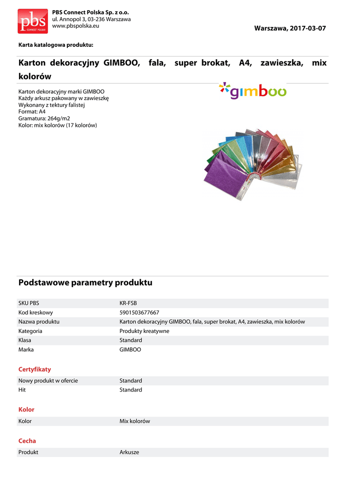 PBS Connect Polska Sp. z o.o. ul. Annopol 3, 03-236 Warszawa www.pbspolska.eu Warszawa, 2017-03-07 Karta katalogowa produktu: Karton dekoracyjny GIMBOO, fala, super brokat, A4, zawieszka, mix kolorów Karton dekoracyjny marki GIMBOO Każdy arkusz pakowany w zawieszkę Wykonany z tektury falistej Format: A4 Gramatura: 264g/m2 Kolor: mix kolorów (17 kolorów) Podstawowe parametry produktu SKU PBS KR-FSB Kod kreskowy 5901503677667 Nazwa produktu Karton dekoracyjny GIMBOO, fala, super brokat, A4, zawieszka, mix kolorów Kategoria Produkty kreatywne Klasa Standard Marka GIMBOO Certyfikaty Nowy produkt w ofercie Standard Hit Standard Kolor Kolor Mix kolorów Cecha Produkt Arkusze PBS Connect Polska Sp. z o.o. ul. Annopol 3, 03-236 Warszawa www.pbspolska.eu Warszawa, 2017-03-07 Karta katalogowa produktu cd. Karton dekoracyjny GIMBOO, fala, super brokat, A4, zawieszka, mix kolorów Podstawowe parametry produktu Typ Super brokat Materiał Tektura falista W ofercie od 2015-11 Wymiary Gramatura (g/m2) 264 Szerokość (mm) 210 Wymiary (mm) 210x297 Wysokość (mm) 297 Format A4 Wspólny słownik zamówień CPV 30197600-2 Papier i tektura gotowe Jednostki logistyczne Opakowanie 1 25 szt Opakowanie 2 200 szt Opakowanie 3 5600 szt