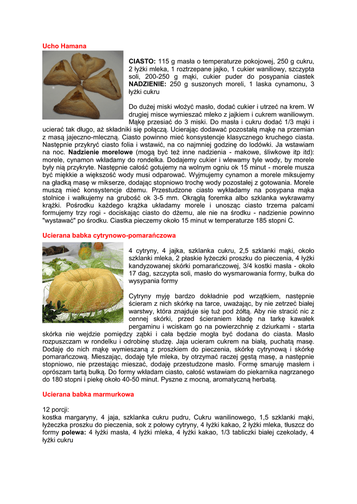 Ucho Hamana CIASTO: 115 g masła o temperaturze pokojowej, 250 g cukru, 2 łyżki mleka, 1 roztrzepane jajko, 1 cukier waniliowy, szczypta soli, 200-250 g mąki, cukier puder do posypania ciastek NADZIENIE: 250 g suszonych moreli, 1 laska cynamonu, 3 łyżki cukru Do dużej miski włożyć masło, dodać cukier i utrzeć na krem. W drugiej misce wymieszać mleko z jajkiem i cukrem waniliowym. Mąkę przesiać do 3 miski. Do masła i cukru dodać 1/3 mąki i ucierać tak długo, aż składniki się połączą. Ucierając dodawać pozostałą mąkę na przemian z masą jajeczno-mleczną. Ciasto powinno mieć konsystencje klasycznego kruchego ciasta. Następnie przykryć ciasto folia i wstawić, na co najmniej godzinę do lodówki. Ja wstawiam na noc. Nadzienie morelowe (mogą być też inne nadzienia - makowe, śliwkowe itp itd): morele, cynamon wkładamy do rondelka. Dodajemy cukier i wlewamy tyle wody, by morele były nią przykryte. Następnie całość gotujemy na wolnym ogniu ok 15 minut - morele musza być miękkie a większość wody musi odparować. Wyjmujemy cynamon a morele miksujemy na gładką masę w mikserze, dodając stopniowo trochę wody pozostałej z gotowania. Morele muszą mieć konsystencje dżemu. Przestudzone ciasto wykładamy na posypana mąka stolnice i wałkujemy na grubość ok 3-5 mm. Okrągłą foremka albo szklanka wykrawamy krążki. Pośrodku każdego krążka układamy morele i unosząc ciasto trzema palcami formujemy trzy rogi - dociskając ciasto do dżemu, ale nie na środku - nadzienie powinno "wystawać" po środku. Ciastka pieczemy około 15 minut w temperaturze 185 stopni C. Ucierana babka cytrynowo-pomarańczowa 4 cytryny, 4 jajka, szklanka cukru, 2,5 szklanki mąki, około szklanki mleka, 2 płaskie łyżeczki proszku do pieczenia, 4 łyżki kandyzowanej skórki pomarańczowej, 3/4 kostki masła - około 17 dag, szczypta soli, masło do wysmarowania formy, bułka do wysypania formy Cytryny myję bardzo dokładnie pod wrzątkiem, następnie ścieram z nich skórkę na tarce, uważając, by nie zetrzeć białej warstwy, która znajduje się tuż pod żółtą. Aby nie stracić nic z cennej skórki, przed ścieraniem kładę na tarkę kawałek pergaminu i wciskam go na powierzchnię z dziurkami - starta skórka nie wejdzie pomiędzy ząbki i cała będzie mogła być dodana do ciasta. Masło rozpuszczam w rondelku i odrobinę studzę. Jaja ucieram cukrem na białą, puchatą masę. Dodaję do nich mąkę wymieszaną z proszkiem do pieczenia, skórkę cytrynową i skórkę pomarańczową. Mieszając, dodaję tyle mleka, by otrzymać raczej gęstą masę, a następnie stopniowo, nie przestając mieszać, dodaję przestudzone masło. Formę smaruję masłem i oprószam tartą bułką. Do formy wkładam ciasto, całość wstawiam do piekarnika nagrzanego do 180 stopni i piekę około 40-50 minut. Pyszne z mocną, aromatyczną herbatą. Ucierana babka marmurkowa 12 porcji: kostka margaryny, 4 jaja, szklanka cukru pudru, Cukru wanilinowego, 1,5 szklanki mąki, łyżeczka proszku do pieczenia, sok z połowy cytryny, 4 łyżki kakao, 2 łyżki mleka, tłuszcz do formy polewa: 4 łyżki masła, 4 łyżki mleka, 4 łyżki kakao, 1/3 tabliczki białej czekolady, 4 łyżki cukru Przygotuj ciasto: margarynę utrzyj z żółtkami, cukrem pudrem i wanilinowym. Mąkę przesiej z proszkiem do pieczenia i wymieszaj z masą z żółtek. Ciasto podziel na pół, jedną część wymieszaj z kakao i mlekiem, a drugą z sokiem z cytryny. Połowę ubitej z białek piany wymieszaj z jasnym ciastem, a drugą z ciemnym. W formie posmarowanej tłuszczem umieść najpierw jasną masę, potem ciemną i wstaw ją na 45-50 minut do piekarnika rozgrzanego do 180°C. Przygotuj polewę: mleko podgrzej z cukrem oraz kakao, po czym zdejmij z ognia, lekko przestudź i wymieszaj z masłem. Dwie łyżki gorącej polewy wymieszaj z połamaną na kawałki białą czekoladą. Gotową babkę pokryj polewą i zanim zastygnie, ozdób polewą z białą czekoladą. Ucierane ciasto ze śliwkami 1 margaryna, 2 jajka, 2 żółtka, 1 szklanka cukru, 3,5 szklanki mąki, 3/4 szklanki śmietany lub zsiadłego mleka, 2 łyżeczki proszku do pieczenia, szczypta soli, 1 kg śliwek na kruszonkę 1/4 kostki margaryny, 1/2 szklanki cukru, mąki tyle, aby kruszonka była sypka Margarynę utrzeć z cukrem. Dodawać po jednym żółtka i całe jajka i ucierać aż do otrzymania gładkiej, jednolitej masy. Wsypać mąkę, sól, proszek i dodać śmietanę. Dokładnie wymieszać. Ciasto powinno być gęste. Wykładamy je na blaszkę 30 na 40 cm. Na ciasto układamy śliwki skórką do dołu i posypujemy kruszonką. Pieczemy ok 40 minut - do zrumienienia. dodatkowe informacje Jest pyszne z każdymi owocami sezonowymi Ucierane z makiem 2 szklanki maku, 6 łyżek mąki ziemniaczanej, 2 szklanki cukru, 13 jajek, 1 cukier waniliowy, 1 mały zapach rumowy, 1 łyżka tłuszczu, 1 łyżka bułki tartej do przygotowania formy. Mak umyć, sparzyć wrzątkiem, osączyć i zemleć przez sito o małych otworach. Żółtka ucierać z cukrem, cukrem waniliowym i zapachem rumowym na puszystą masę. Stopniowo dodawać mąkę i zmielony mak. Białka ubić na sztywną pianę i delikatnie wymieszać z masą makową. Formę do pieczenia wysmarować tłuszczem, posypać tartą bułką i przelać do niej ciasto. Piec 1 godz. w temp. 190 st.C. Po ostudzeniu ciasto można polać lukrem lub polewą czekoladową. Ukrainka ciasto: 3 jajka, 2 łyżki kakao, 3/4 szkl. Cukru, 1 łyżka sody, 3 łyżki miodu prawdziwego Krem: 1 l mleka, 2 czubate łyżki mąki pszennej, 2 czubate łyżki mąki ziemniaczanej, 2 jajka, 2 cukry waniliowe, 1 szkl. Cukru ciasto: Podane składniki ubijać na parze 15 min. Następnie dodać 1,5 szkl. mąki i wymieszać na gładką masę zdejmując już z pary. Dodać następne 1,5 szkl. mąki i wyrobić ciast na stolnicy. Ciasto jest gumkowate. Podzielić je na 5 równych części i 6-tą malutką. Rozwałkować na wymi