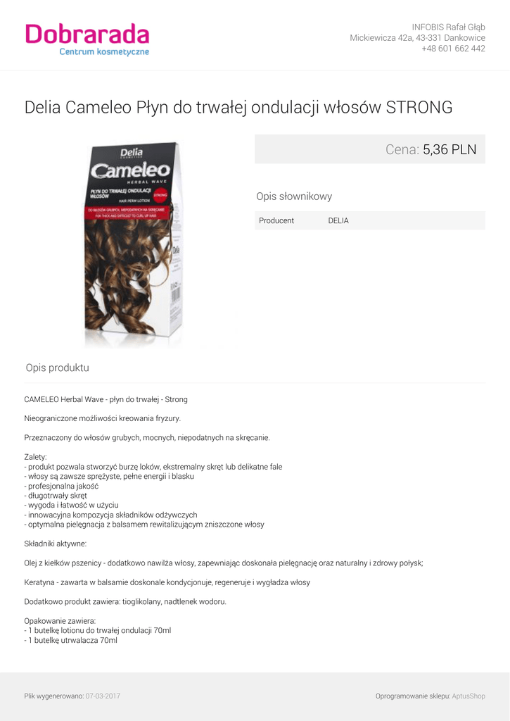 INFOBIS Rafał Głąb Mickiewicza 42a, 43-331 Dankowice +48 601 662 442 Delia Cameleo Płyn do trwałej ondulacji włosów STRONG Cena: 5,36 PLN Opis słownikowy Producent DELIA Opis produktu CAMELEO Herbal Wave - płyn do trwałej - Strong Nieograniczone możliwości kreowania fryzury. Przeznaczony do włosów grubych, mocnych, niepodatnych na skręcanie. Zalety: - produkt pozwala stworzyć burzę loków, ekstremalny skręt lub delikatne fale - włosy są zawsze sprężyste, pełne energii i blasku - profesjonalna jakość - długotrwały skręt - wygoda i łatwość w użyciu - innowacyjna kompozycja składników odżywczych - optymalna pielęgnacja z balsamem rewitalizującym zniszczone włosy Składniki aktywne: Olej z kiełków pszenicy - dodatkowo nawilża włosy, zapewniając doskonała pielęgnację oraz naturalny i zdrowy połysk; Keratyna - zawarta w balsamie doskonale kondycjonuje, regeneruje i wygładza włosy Dodatkowo produkt zawiera: tioglikolany, nadtlenek wodoru. Opakowanie zawiera: - 1 butelkę lotionu do trwałej ondulacji 70ml - 1 butelkę utrwalacza 70ml Plik wygenerowano: 07-03-2017 Oprogramowanie sklepu: AptusShop INFOBIS Rafał Głąb Mickiewicza 42a, 43-331 Dankowice +48 601 662 442 - 1 saszetkę z balsamem rewitalizującym włosy 15ml - instrukcje użycia - 1 parę rękawic - czepek foliowy Galeria Plik wygenerowano: 07-03-2017 Powered by TCPDF (www.tcpdf.org) Oprogramowanie sklepu: AptusShop