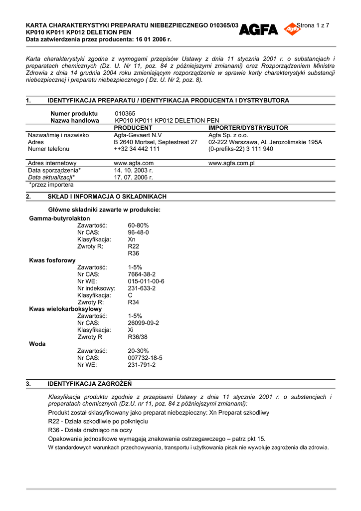 KARTA CHARAKTERYSTYKI PREPARATU NIEBEZPIECZNEGO 010365/03 KP010 KP011 KP012 DELETION PEN Data zatwierdzenia przez producenta: 16 01 2006 r. Strona 1 z 7 Karta charakterystyki zgodna z wymogami przepisów Ustawy z dnia 11 stycznia 2001 r. o substancjach i preparatach chemicznych (Dz. U. Nr 11, poz. 84 z późniejszymi zmianami) oraz Rozporządzeniem Ministra Zdrowia z dnia 14 grudnia 2004 roku zmieniającym rozporządzenie w sprawie karty charakterystyki substancji niebezpiecznej i preparatu niebezpiecznego ( Dz. U. Nr 2, poz. 8). 1. IDENTYFIKACJA PREPARATU / IDENTYFIKACJA PRODUCENTA I DYSTRYBUTORA Numer produktu Nazwa handlowa Nazwa/imię i nazwisko Adres Numer telefonu Adres internetowy Data sporządzenia* Data aktualizacji* *przez importera 2. 010365 KP010 KP011 KP012 DELETION PEN PRODUCENT IMPORTER/DYSTRYBUTOR Agfa-Gevaert N.V Agfa Sp. z o.o. B 2640 Mortsel, Septestreat 27 02-222 Warszawa, Al. Jerozolimskie 195A ++32 34 442 111 (0-prefiks-22) 3 111 940 www.agfa.com 14. 10. 2003 r. 17. 07. 2006 r. www.agfa.com.pl SKŁAD I INFORMACJA O SKŁADNIKACH Główne składniki zawarte w produkcie: Gamma-butyrolakton Zawartość: 60-80% Nr CAS: 96-48-0 Klasyfikacja: Xn Zwroty R: R22 R36 Kwas fosforowy Zawartość: 1-5% Nr CAS: 7664-38-2 Nr WE: 015-011-00-6 Nr indeksowy: 231-633-2 Klasyfikacja: C Zwroty R: R34 Kwas wielokarboksylowy Zawartość: 1-5% Nr CAS: 26099-09-2 Klasyfikacja: Xi Zwroty R R36/38 Woda Zawartość: 20-30% Nr CAS: 007732-18-5 Nr WE: 231-791-2 3. IDENTYFIKACJA ZAGROŻEŃ Klasyfikacja produktu zgodnie z przepisami Ustawy z dnia 11 stycznia 2001 r. o substancjach i preparatach chemicznych (Dz.U. nr 11, poz. 84 z późniejszymi zmianami): Produkt został sklasyfikowany jako preparat niebezpieczny: Xn Preparat szkodliwy R22 - Działa szkodliwie po połknięciu R36 - Działa drażniąco na oczy Opakowania jednostkowe wymagają znakowania ostrzegawczego – patrz pkt 15. W standardowych warunkach przechowywania, transportu i użytkowania pisak nie wywołuje zagrożenia dla zdrowia. KARTA CHARAKTERYSTYKI PREPARATU NIEBEZPIECZNEGO 010365/03 KP010 KP011 KP012 DELETION PEN Data zatwierdzenia przez producenta: 16 01 2006 r. 4. Strona 2 z 7 PIERWSZA POMOC Wdychanie: Wyprowadzić poszkodowanego na świeże powietrze. W przypadku utrzymywania się dolegliwości zwrócić się o pomoc medyczną. Skóra: Natychmiast zmywać dużą ilością wody z mydłem. Nałożyć żel zawierający glukonian wapnia na miejsce kontaktu preparatu ze skórą oraz bliską okolicę tego miejsca cięgle wcierając żel przez okres 15 minut od chwili gdy ustąpi ból. Podrażnione miejsce nakryć opatrunkiem zawierającym glukonian wapnia. Zwrócić się o pomoc lekarską. Oczy: W przypadku dostania się produktu do oczu natychmiast przemywać oczy dużą ilością czystej bieżącej wody przez minimum 15 minut. Zwrócić się o pomoc do lekarza okulisty. Połknięcie: Przemyć usta dużą ilością wody. Wezwać lekarza i pokazać opakowanie lub etykietę. 5. POSTĘPOWANIE W PRZYPADKU POŻARU Zalecane środki gaśnicze: Preparat jest roztworem wodnym. Środki gaśnicze woda, CO2, piana gaśnicza, proszek gaśniczy, piasek. Nieodpowiednie środki gaśnicze: Producent nie określił. Szczególne zagrożenie ze strony produktów spalania i wydzielających się gazów: W przypadku rozkładu termicznego możliwa emisja toksycznych gazów. Preparat zawarty w pojedynczym pisaku nie wywołuje zagrożenie dla zdrowia, gdy płonie większa ilość może dojść do uwolnienia toksycznych gazów. Skład tych gazów zależy od warunków w jakich następuje spalanie pisaków, skład nie różni się znacznie od gazów wydzielanych podczas spalania innych plastikowych elementów. Zagrożenie wybuchowe i pożarowe: Nie są znane. Specjalne wyposażenie ochronne strażaków: W razie potrzeby nosić kombinezony ochronne i aparaty oddechowe z niezależnym źródłem powietrza. 6. POSTĘPOWANIE W PRZYPADKU NIEZAMIERZONEGO UWOLNIENIA DO ŚRODOWISKA Zapewnić odpowiednią wentylację tak by stężenia składników w środowisku pracy były niższe od stężeń NDS patrz pkt. 8. Uwolniony produkt przesypać materiałem pochłaniającym (suchy piasek, ziemia lub inny neutralny absorbent), zebrać do odpowiednio oznakowanego pojemnika na odpady oraz powiadomić odpowiednie służby. Powierzchnię w miejscu wycieku dokładnie oczyścić z pozostałości uwolnionego produktu. Zabezpieczyć przed przedostaniem się substancji do wód powierzchniowych kanalizacji lub gleby. Postępowanie z odpadami patrz punkt 13. 7. POSTĘPOWANIE Z PREPARATEM I MAGAZYNOWANIE Postępowanie z preparatem: Chronić oczy, skórę i odzież przed kontaktem z produktem. Podczas stosowania zapewnić odpowiednią wentylację. Po pracy z produktem dokładnie umyć ręce. Magazynowanie: Przechowywać w zamkniętych pojemnikach w temperaturze 5-35°C, w suchym miejscu (15%<RH<65%) Chronić przed światłem słonecznym. Przechowywać z dala od źródeł ciepła. Nie przechowywać razem z materiałami reagującymi z produktem (patrz punkt 10 „Stabilność i reaktywność”). Wymagania dotyczące wentylacji: KARTA CHARAKTERYSTYKI PREPARATU NIEBEZPIECZNEGO 010365/03 KP010 KP011 KP012 DELETION PEN Data zatwierdzenia przez producenta: 16 01 2006 r. 7. Strona 3 z 7 POSTĘPOWANIE Z PREPARATEM I MAGAZYNOWANIE Zapewnić odpowiednią wentylację tak by stężenia składników w środowisku pracy były niższe od stężeń NDS patrz pkt. 8. Środki ostrożności: Specjalne środki ochrony przeciwogniowej i przeciwwybuchowej nie są potrzebne. 8. KONTROLA NARAŻENIA I ŚRODKI OCHRONY INDYWIDUALNEJ Dodatkowe zalecenia w zakresie środków inżynieryjnych: Zapewnić odpowiednią wentylację tak by stężenia składników w środowisku pracy były niższe od stężeń NDS Parametry kontroli narażenia: Rozporządzenie MPiPS z dnia 29 listopada 2002 r. w sprawie najwyższych dopuszczalnych stężeń i natężeń czynników szkodliwych dla zdrowia w środowisku pracy (Dz.U. z 2002 r. 