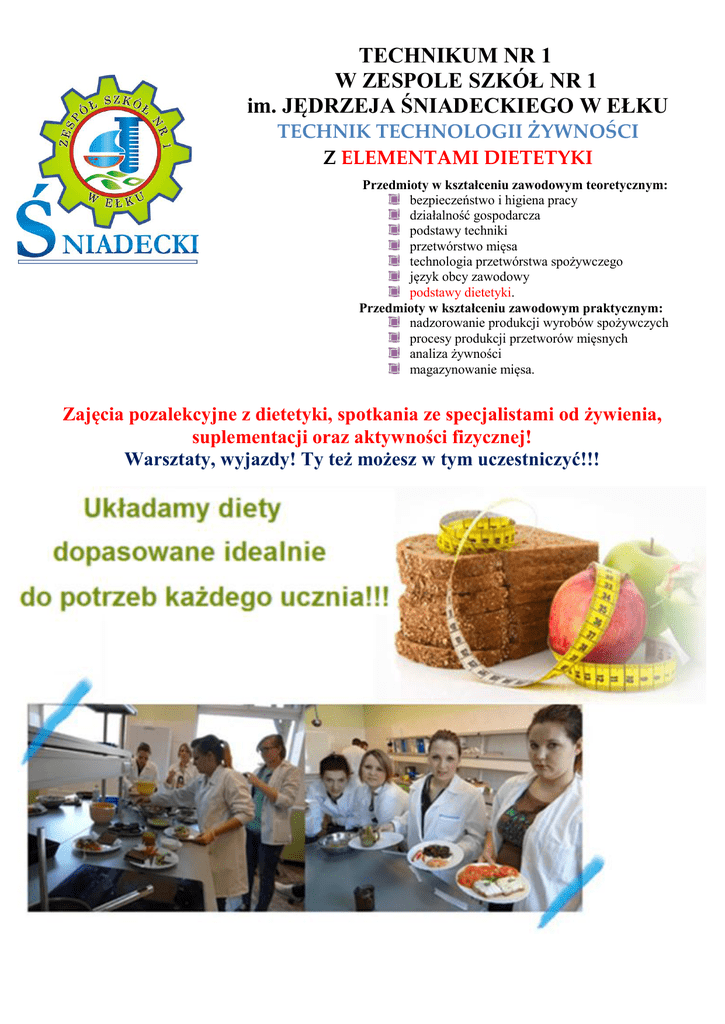 TECHNIKUM NR 1 W ZESPOLE SZKÓŁ NR 1 im. JĘDRZEJA ŚNIADECKIEGO W EŁKU TECHNIK TECHNOLOGII ŻYWNOŚCI Z ELEMENTAMI DIETETYKI Przedmioty w kształceniu zawodowym teoretycznym: bezpieczeństwo i higiena pracy działalność gospodarcza podstawy techniki przetwórstwo mięsa technologia przetwórstwa spożywczego język obcy zawodowy podstawy dietetyki. Przedmioty w kształceniu zawodowym praktycznym: nadzorowanie produkcji wyrobów spożywczych procesy produkcji przetworów mięsnych analiza żywności magazynowanie mięsa. Zajęcia pozalekcyjne z dietetyki, spotkania ze specjalistami od żywienia, suplementacji oraz aktywności fizycznej! Warsztaty, wyjazdy! Ty też możesz w tym uczestniczyć!!! W zawodzie technik technologii żywności wyodrębnia się dwie kwalifikacje: T.5. Produkcja przetworów mięsnych i tłuszczowych. T.16. Organizacja i nadzorowanie produkcji wyrobów spożywczych. Wyjazdy studyjne na Uniwersytet Warmińsko-Mazurski w Olsztynie! Zajęcia laboratoryjne, sympozja i wiele innych atrakcji!!! GIMNAZJALISTO! Przyjdź do nas i przekonaj się, że dobrze trafiłeś!!! Absolwenci zostaną przygotowani do wykonywania następujących zadań zawodowych: wytwarzania produktów spożywczych od momentu przyjęcia surowców do zakładu aż do uzyskania gotowych wyrobów; obsługiwania maszyn i urządzeń stosowanych do produkcji wyrobów spożywczych; organizowania i nadzorowania przebiegu procesów technologicznych w przetwórstwie spożywczym; kontrolowania jakości surowców i produktów na każdym etapie procesu technologicznego; kontrolowania pracy maszyn stosowanych w przetwórstwie żywności. Miejscem pracy technika technologii żywności mogą być: zakłady przetwórstwa spożywczego np. w zakłady mięsne, mleczarskie, owocowo-warzywne, piekarsko-ciastkarskie, cukiernicze, rybne, drobiarskie, fermentacyjne; placówki zajmujące się handlem żywnością, oraz samodzielnie prowadzona działalność gospodarcza. Praca może odbywać się w nowoczesnych, wyposażonych w zautomatyzowane linie produkcyjne, zakładach spożywczych oraz w zakładach rzemieślniczych na różnych typowych stanowiskach np.: technologa, który opracowuje nowe receptury i wprowadza je do produkcji, zmienia i doskonali istniejące wyroby; mistrza, brygadzisty, który nadzoruje i kontroluje podległych pracowników, organizuje ich pracę, szkoli, odpowiada za jakość, terminowość i wydajność pracy. Przygotowuje rozliczenia zużycia surowców i opakowań; laboranta - bada organoleptycznie i za pomocą specjalistycznej aparatury surowce, półprodukty, dodatki na każdym etapie produkcji oraz każdą partię gotowego wyrobu. Ukończenie tego typu szkoły umożliwia uzyskanie świadectwa dojrzałości oraz dyplomu potwierdzającego kwalifikacje w zawodzie, który honorują kraje Unii Europejskiej. Absolwent technikum technologii żywności może kontynuować dalsze kształcenie kierunkowe na wyższych uczelniach lub zdobywać nowe kwalifikacje w szkołach policealnych oraz na kwalifikacyjnych kursach zawodowych! Zajęcia praktyczne i płatne staże w Animex Foods Sp. z o. o. sp.k. Oddział w Ełku! Absolwenci tego zawodu mają zagwarantowaną pracę! Dla przyszłego ucznia Technikum nr 1 w zawodzie technik technologii żywności z elementami dietetyki oferujemy: