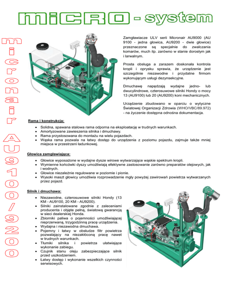 Zamgławiacze ULV serii Micronair AU9000 (AU 9100 - jedna głowica, AU9200 - dwie głowice) przeznaczone są specjalnie do zwalczania komarów, much itp. zarówno w stanie dorosłym jak i larwalnym. Prosta obsługa a zarazem doskonała kontrola kropli i oprysku sprawia, że urządzenie jest szczególnie niezawodne i przydatne firmom wykonującym usługi dezynsekcyjne. Dmuchawę napędzają wydajne jedno- lub dwucylindrowe, czterosuwowe silniki Hondy o mocy 13 (AU9100) lub 20 (AU9200) koni mechanicznych. Urządzenie zbudowano w oparciu o wytyczne Światowej Organizacji Zdrowia (WHO/VBC/89.972) - na życzenie dostępna odnośna dokumentacja. Rama i konstrukcja: Solidna, spawana stalowa rama odporna na eksploatację w trudnych warunkach. Amortyzowane zawieszenia silnika i dmuchawy. Rama przystosowana do montażu na wielu pojazdach. Wąska rama pozwala na łatwy dostęp do urządzenia z poziomu pojazdu, zajmuje także mniej miejsca w przestrzeni ładunkowej. Głowica zamgławiająca: Głowice wyposażone w wydajne dysze wirowe wytwarzające wąskie spektrum kropli. Wymienne końcówki dyszy umożliwiają efektywne zastosowanie zarówno preparatów olejowych, jak i wodnych. Głowice niezależnie regulowane w poziomie i pionie. Wysoki maszt głowicy umożliwia rozprowadzenie mgły powyżej zawirowań powietrza wytwarzanych przez pojazd. Silnik i dmuchawa: Niezawodne, czterosuwowe silniki Hondy (13 KM - AU9100, 20 KM - AU9200). Silniki zainstalowane zgodnie z zaleceniami producenta i objęte pełną, światową gwarancją w sieci dealerskiej Honda. Zbiorniki paliwa o pojemności umożliwiającej nieprzerwaną, trzygodzinną pracę urządzenia. Wydajna i niezawodna dmuchawa. Pojemny i łatwy w obsłudze filtr powietrza pozwalający na niezakłóconą pracę nawet w trudnych warunkach. Tłumiki silnika i powietrza ułatwiające wykonanie zabiegu. Czujnik stanu oleju zabezpieczające silnik przed uszkodzeniem. Łatwy dostęp i wykonanie wszelkich czynności serwisowych. Układ cieczowy i sterowanie: 50-litrowy zbiornik na insektycyd. Wygodny wlew o szerokości 180 mm, wyposażony w filtr. Zawór spustowy do opróżniania zbiornika. Bezobsługowa pompa o napędzie elektromagnetycznym. Panel sterowniczo-kontrolny montowany w kabinie (w opcji z elektroniczną regulacją przepływu). Zabezpieczenie przed przypadkowym wypływem środka - pompa nie działa bez włączonego silnika i dmuchawy. Pojemny, łatwy w obsłudze filtr cieczowy. Odporne zarówno na chemię jak uszkodzenia mechaniczne, teflonowe węże ze stalowymi zakuciami. Złączki z mosiądzu i stali nierdzewnej odporne na działanie formulacji olejowych i wodnych. Przepływ cieczy regulowany poprzez dławik lub elektronicznie (opcja). Zasilanie z pojazdu bądź z własnego akumulatora. Zakład Handlowy KOLACERIS ul. Zawadzkiego 18 * 46-380 Dobrodzień www.micro-system.com.pl 34 357 56 45 PPH „Hydro-Masz” Sęcerski SJ Zapole 79/5 * 98-275 Brzeźnio www.hydro-masz.pl 43 820 38 95