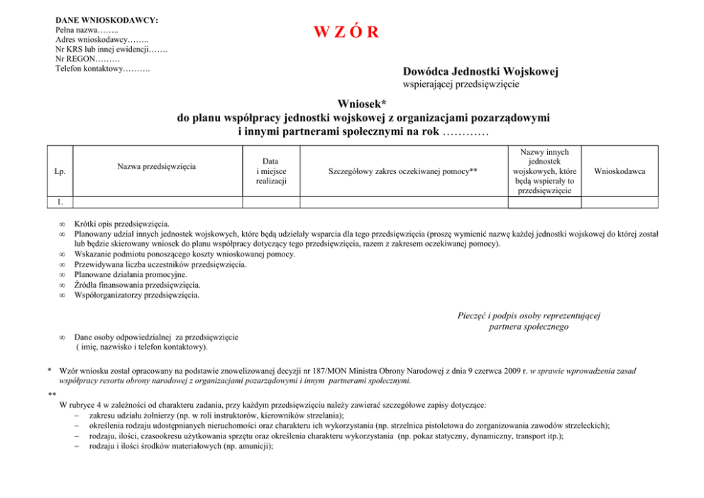 DANE WNIOSKODAWCY: Pełna nazwa…….. Adres wnioskodawcy…….. Nr KRS lub innej ewidencji……. Nr REGON……… Telefon kontaktowy………. WZÓR Dowódca Jednostki Wojskowej wspierającej przedsięwzięcie Wniosek* do planu współpracy jednostki wojskowej z organizacjami pozarządowymi i innymi partnerami społecznymi na rok ………… Lp. Nazwa przedsięwzięcia Data i miejsce realizacji Szczegółowy zakres oczekiwanej pomocy** Nazwy innych jednostek wojskowych, które będą wspierały to przedsięwzięcie Wnioskodawca 1. • • • • • • • • Krótki opis przedsięwzięcia. Planowany udział innych jednostek wojskowych, które będą udzielały wsparcia dla tego przedsięwzięcia (proszę wymienić nazwę każdej jednostki wojskowej do której został lub będzie skierowany wniosek do planu współpracy dotyczący tego przedsięwzięcia, razem z zakresem oczekiwanej pomocy). Wskazanie podmiotu ponoszącego koszty wnioskowanej pomocy. Przewidywana liczba uczestników przedsięwzięcia. Planowane działania promocyjne. Źródła finansowania przedsięwzięcia. Współorganizatorzy przedsięwzięcia. Pieczęć i podpis osoby reprezentującej partnera społecznego Dane osoby odpowiedzialnej za przedsięwzięcie ( imię, nazwisko i telefon kontaktowy). * Wzór wniosku został opracowany na podstawie znowelizowanej decyzji nr 187/MON Ministra Obrony Narodowej z dnia 9 czerwca 2009 r. w sprawie wprowadzenia zasad współpracy resortu obrony narodowej z organizacjami pozarządowymi i innym partnerami społecznymi. ** W rubryce 4 w zależności od charakteru zadania, przy każdym przedsięwzięciu należy zawierać szczegółowe zapisy dotyczące: − zakresu udziału żołnierzy (np. w roli instruktorów, kierowników strzelania); − określenia rodzaju udostępnianych nieruchomości oraz charakteru ich wykorzystania (np. strzelnica pistoletowa do zorganizowania zawodów strzeleckich); − rodzaju, ilości, czasookresu użytkowania sprzętu oraz określenia charakteru wykorzystania (np. pokaz statyczny, dynamiczny, transport itp.); − rodzaju i ilości środków materiałowych (np. amunicji); Zadania opisane ogólnie, bez wskazania ww. informacji nie będą ujmowane w planie Dowództwa Generalnego RSZ. 2