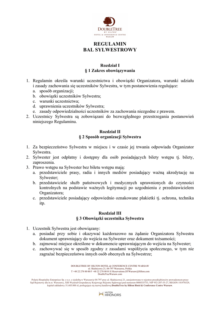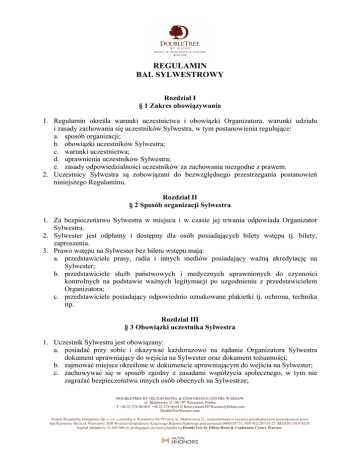 REGULAMIN BAL SYLWESTROWY Rozdział I § 1 Zakres obowiązywania 1. Regulamin określa warunki uczestnictwa i obowiązki Organizatora, warunki udziału i zasady zachowania się uczestników Sylwestra, w tym postanowienia regulujące: a. sposób organizacji; b. obowiązki uczestników Sylwestra; c. warunki uczestnictwa; d. uprawnienia uczestników Sylwestra; e. zasady odpowiedzialności uczestników za zachowania niezgodne z prawem. 2. Uczestnicy Sylwestra są zobowiązani do bezwzględnego przestrzegania postanowień niniejszego Regulaminu. Rozdział II § 2 Sposób organizacji Sylwestra 1. Za bezpieczeństwo Sylwestra w miejscu i w czasie jej trwania odpowiada Organizator Sylwestra. 2. Sylwester jest odpłatny i dostępny dla osób posiadających bilety wstępu tj. bilety, zaproszenia. 3. Prawo wstępu na Sylwester bez biletu wstępu mają: a. przedstawiciele prasy, radia i innych mediów posiadający ważną akredytację na Sylwester; b. przedstawiciele służb państwowych i medycznych uprawnionych do czynności kontrolnych na podstawie ważnych legitymacji po uzgodnieniu z przedstawicielem Organizatora; c. przedstawiciele posiadający odpowiednio oznakowane plakietki tj. ochrona, technika itp. Rozdział III § 3 Obowiązki uczestnika Sylwestra 1. Uczestnik Sylwestra jest obowiązany: a. posiadać przy sobie i okazywać każdorazowo na żądanie Organizatora Sylwestra dokument uprawniający do wejścia na Sylwester oraz dokument tożsamości; b. zajmować miejsce określone w dokumencie uprawniającym do wejścia na Sylwester; c. zachowywać się w sposób zgodny z zasadami współżycia społecznego, w tym nie zagrażać bezpieczeństwu innych osób obecnych na Sylwestrze; DOUBLETREE BY HILTON HOTEL & CONFERENCE CENTRE WARSAW ul. Skalnicowa 21, 04-797 Warszawa, Polska T +48 22 278 00 00 F +48 22 278 00 01 E [email protected] DoubleTreeWarsaw.com Polaris Hospitality Enterprises Sp. z o.o. z siedzibą w Warszawie 04-797 przy ul. Skalnicowej 21, zarejestrowana w rejestrze przedsiębiorców prowadzonym przez Sąd Rejonowy dla m.st. Warszawy, XIII Wydział Gospodarczy Krajowego Rejestru Sądowego pod numerem 0000335753, NIP 952-207-55-27, REGON 141978529, kapitał zakładowy 51.605.000 zł, posługująca się nazwą handlową DoubleTree by Hilton Hotel & Conference Centre Warsaw. d. stosować się do zarządzeń i poleceń Organizatora, kierownika ds. bezpieczeństwa, pracowników służby informacyjnej i porządkowej oraz spikera, a w przypadku interwencji funkcjonariuszy Policji, Państwowej Straży Pożarnej, Straży Granicznej, Żandarmerii Wojskowej lub pracowników innych uprawnionych służb i organów – do wykonywania ich poleceń; 2. Uczestnicy Sylwestra na żądanie funkcjonariuszy lub pracowników służby porządkowej i służby informacyjnej zobowiązani są zajmować miejsca inne niż określone w dokumencie uprawniającym do wejścia na Sylwester. Rozdział IV § 4 Warunki uczestnictwa w Sylwestrze 1. Zakazuje się wstępu na Sylwester osobie: a. wobec której wydane zostało orzeczenie zakazujące wstępu na imprezy masowe lub zobowiązujące do powstrzymania się od przebywania w miejscach przeprowadzanych imprez masowych, b. wobec której wydano zakaz zagraniczny, c. odmawiającej: a. poddania się sprawdzeniu i stwierdzeniu, czy osoba ta jest uprawniona do uczestniczenia w Sylwestrze; b. poddania się przeglądaniu zawartości bagaży i odzieży w przypadku podejrzenia, § posiada broń lub inne niebezpieczne przedmioty, materiały wybuchowe, wyroby pirotechniczne, materiały pożarowo niebezpieczne, napoje alkoholowe, środki odurzające lub substancje psychotropowe c. poddania się badaniu stanu trzeźwości, d. znajdującej się pod widocznym wpływem alkoholu, środków odurzających i psychotropowych lub innych podobnie działających środków, e. zachowującej się agresywnie, prowokacyjnie albo w inny sposób stwarzającej zagrożenie dla bezpieczeństwa i porządku publicznego, oraz innych uczestników Sylwestra lub której zachowanie bądź ubiór nie licuje z powagą Sylwestra. f. małoletniej do lat 13, niebędącej pod opieką opiekuna. g. Osoby uczestniczące w imprezie masowej są obowiązane zachowywać się w sposób nie zagrażający bezpieczeństwu innych osób obecnych na tej imprezie, przestrzegać postanowień niniejszego regulaminu, a w szczególności zakazu: - wnoszenia i spożywania napojów alkoholowych na terenie imrpezy, - wnoszenia i posiadania w jej trakcie broni lub innych niebezpiecznych przedmiotów, materiałów wybuchowych, wyrobów pirotechnicznych, materiałów pożarowe niebezpiecznych, środków odurzających lub substancji psychotropowych, - wnoszenia i posiadania wszelkich płynów i napojów w opakowaniach szklanych, plastikowych lub puszkach metalowych. DOUBLETREE BY HILTON HOTEL & CONFERENCE CENTRE WARSAW ul. Skalnicowa 21, 04-797 Warszawa, Polska T +48 22 278 00 00 F +48 22 278 00 01 E [email protected] DoubleTreeWarsaw.com Polaris Hospitality Enterprises Sp. z o.o. z siedzibą w Warszawie 04-797 przy ul. Skalnicowej 21, zarejestrowana w rejestrze przedsiębiorców prowadzonym przez Sąd Rejonowy dla m.st. Warszawy, XIII Wydział Gospodarczy Krajowego Rejestru Sądowego pod numerem 0000335753, NIP 952-207-55-27, REGON 141978529, kapitał zakładowy 51.605.000 zł, posługująca się nazwą handlową DoubleTree by Hilton Hotel & Conference Centre Warsaw. 2. Podczas Sylwestra zabrania się: a. rzucania przedmiotami; b. wnoszenia własnego alkoholu, używania środków odurzających lub psychotropowych; c. rozniecania i podsycania ognia, w tym palenia tytoniu w miejscach niedozwolonych; d. używania środków pirotechnicznych, rac świetlnych i dymnych, petard, pochodni itp.; e. blokowania miejsc w rejonie wyjść, wejść oraz dróg ewakuacyjnych; f. przebywania osób w miejscach nieprzeznaczonych do przebywania. 3. Zabrania się wnoszenia na teren Hotelu i posiadania na Sylwesterze: a. przedmiotów niebezpiecznych, w tym sz