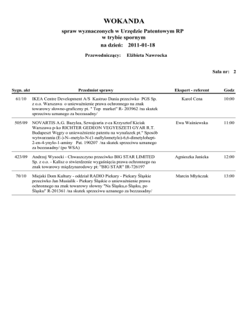 WOKANDA spraw wyznaczonych w Urzędzie Patentowym RP w trybie spornym na dzień: 2011-01-18 Przewodniczący: Elżbieta Nawrocka Sala nr: 2 Sygn. akt Przedmiot sprawy Ekspert - referent Godz 61/10 IKEA Centre Development A/S Kastruo Dania przeciwko PGS Sp. z o.o. Warszawa o unieważnienie prawa ochronnego na znak towarowy słowno-graficzny pt. " Top market" R- 203962 /na skutek sprzeciwu uznanego za bezzasadny/ Karol Cena 10:00 505/09 NOVARTIS A.G. Bazylea, Szwajcaria z-ca Krzysztof Kiciak Warszawa p-ko RICHTER GEDEON VEGYESZETI GYAR R.T. Budapeszt Węgry o unieważnienie patentu na wynalazek pt." Sposób wytwarzania (E-)-N--metylo-N-(1-naftylometylo)-6,6-dimetylohept2-en-4-ynylo-1-aminy Pat. 190207 /na skutek sprzeciwu uznanego za bezzasadny/ (po WSA) Ewa Waśniewska 11:00 423/09 Andrzej Wysocki - Chwaszczyno przeciwko BIG STAR LIMITED Sp. z o.o. - Kalisz o stwierdzenie wygaśnięcia prawa ochronnego na znak towarowy międzynarodowy pt: "BIG STAR" IR-726197 Agnieszka Janicka 12:00 70/10 Miejski Dom Kultury - oddział RADIO Piekary - Piekary Śląskie przeciwko Jan Musialik - Piekary Śląskie o unieważnienie prawa ochronnego na znak towarowy słowny "Na Śląsku,o Śląsku, po Śląsku" R-201361 /na skutek sprzeciwu uznanego za bezzasadny/ Marcin Młyńczak 13:00