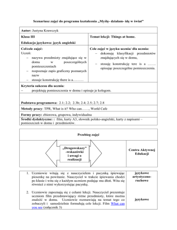 Scenariusz zajęć do programu kształcenia „Myślę- działam- idę w świat” Autor: Justyna Krawczyk Klasa III Temat lekcji: Things at home. Edukacja językowa: język angielski Cel/cele zajęć: Cele zajęć w języku ucznia/ dla ucznia: Uczeń: dokonuję klasyfikacji przedmiotów nazywa przedmioty znajdujące się w znajdujących się w domu, domu w poszczególnych stosuję konstrukcję tere is a ……. pomieszczeniach opisując poszczególne pomieszczenia. rozpoznaje zapis graficzny poznanych nazw stosuje konstrukcję there is a……… Kryteria sukcesu dla ucznia: projektuję pomieszczenia w domu i opisuje je kolegom. Podstawa programowa: 2.1; 2.2; 2.3b; 2.4; 2.5; 2.7; 2.8 Metody pracy: TPR, What is it? Who can……, World Cafe Formy pracy: zbiorowa, grupowa, indywidualna Środki dydaktyczne: : film, karty A3, słownik polsko-angielski, karty z napisami – pomieszczeń w domu i przedmiotów. Przebieg zajęć „Drogowskazy” -wskazówki i uwagi o realizacji Uczniowie witają się z nauczycielem i pacynką śpiewając piosenkę na powitanie. Nauczyciel w trakcie śpiewania chodzi po klasie i wita się z każdym uczniem podając mu dłoń. Wita się również z nimi wykorzystując pacynkę. Uczniowie zapoznają się z celami lekcji. Nauczyciel prezentuje uczniom film przedstawiający różne przedmioty, które można znaleźć w domu. Uczniowie rozmawiają na temat tego co zobaczyli i samodzielnie formułują cele lekcji. Film What can you see (załącznik 3) Centra Aktywnej Edukacji językowe artystycznoruchowe językowe Nauczyciel ponownie pokazuje przedmioty i nazywa je w języku angielskim, a następnie pyta się uczniów w jakich pomieszczeniach w domu można je znaleźć (przypomnienie nazw pomieszczeń w domu). Nauczyciel prosi uczniów przyczepienie nazw pomieszczeń na tablicy. ( załącznik 1) językowe Nauczyciel rozkłada na dywanie nazwy różnych przedmiotów, a dopasowania jej do odpowiedniego pomieszczenia (w razie problemów nauczyciel podpowiada uczniom pokazując słowa mimiką.) (załącznik 2) Zabawa World Cafe. Nauczyciel prosi uczniów o wylosowanie karteczki (4 różne kolory). Po wylosowaniu karteczek nauczyciel prosi uczniów aby usiedli w 4 grupach przy stolikach zgodnie z kolorem karteczek, którym przyporządkowane są poszczególne pomieszczenia np. blue – kitchen, red – bedroom, green – bathroom, yellow – living room. Uczniowie projektują pomieszczenia mogą tworzyć rysunki lub zapisywać ich nazwy. Po 5 minutach grupy zamieniają się miejscami zgodnie ze wskazówkami zegara. Podczas wykonywania zadania uczniowie korzystaja ze słowników polsko-angielskich. językowe językowe Podsumowanie: Uczniowie prezentuje swoje projekty. Podczas prezentacji wykorzystują konstrukcję there is a ………in the (kitchen) Uczniowie żegnają się z nauczycielem i pacynką śpiewając piosenkę na pożegnanie. językowe językowe artystycznoruchowe Załącznik 1 – scenariusz-3 Things at home Kitchen Living room Bathroom Bedroom Załącznik 2 – scenariusz 3 things at home spoon plate mug cooker fridge vase coffee table pillow blanket alarm colck rug towel bath shower
