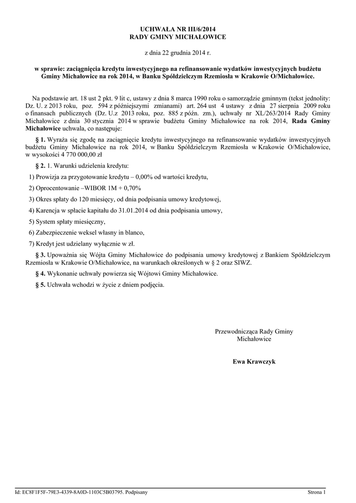 UCHWAŁA NR III/6/2014 RADY GMINY MICHAŁOWICE z dnia 22 grudnia 2014 r. w sprawie: zaciągnięcia kredytu inwestycyjnego na refinansowanie wydatków inwestycyjnych budżetu Gminy Michałowice na rok 2014, w Banku Spółdzielczym Rzemiosła w Krakowie O/Michałowice. Na podstawie art. 18 ust 2 pkt. 9 lit c, ustawy z dnia 8 marca 1990 roku o samorządzie gminnym (tekst jednolity: Dz. U. z 2013 roku, poz. 594 z późniejszymi zmianami) art. 264 ust 4 ustawy z dnia 27 sierpnia 2009 roku o finansach publicznych (Dz. U.z 2013 roku, poz. 885 z późn. zm.), uchwały nr XL/263/2014 Rady Gminy Michałowice z dnia 30 stycznia 2014 w sprawie budżetu Gminy Michałowice na rok 2014, Rada Gminy Michałowice uchwala, co następuje: § 1. Wyraża się zgodę na zaciągnięcie kredytu inwestycyjnego na refinansowanie wydatków inwestycyjnych budżetu Gminy Michałowice na rok 2014, w Banku Spółdzielczym Rzemiosła w Krakowie O/Michałowice, w wysokości 4 770 000,00 zł § 2. 1. Warunki udzielenia kredytu: 1) Prowizja za przygotowanie kredytu – 0,00% od wartości kredytu, 2) Oprocentowanie –WIBOR 1M + 0,70% 3) Okres spłaty do 120 miesięcy, od dnia podpisania umowy kredytowej, 4) Karencja w spłacie kapitału do 31.01.2014 od dnia podpisania umowy, 5) System spłaty miesięczny, 6) Zabezpieczenie weksel własny in blanco, 7) Kredyt jest udzielany wyłącznie w zł. § 3. Upoważnia się Wójta Gminy Michałowice do podpisania umowy kredytowej z Bankiem Spółdzielczym Rzemiosła w Krakowie O/Michałowice, na warunkach określonych w § 2 oraz SIWZ. § 4. Wykonanie uchwały powierza się Wójtowi Gminy Michałowice. § 5. Uchwała wchodzi w życie z dniem podjęcia. Przewodnicząca Rady Gminy Michałowice Ewa Krawczyk Id: EC8F1F5F-79E3-4339-8A0D-1103C5B03795. Podpisany Strona 1 UZASADNIENIE W dniu 11 grudnia 2014r. Gmina Michałowice, ogłosiła przetarg na „Wybór banku, który udzieli kredytu inwestycyjnego na refinansowanie wydatków inwestycyjnych budżetu Gminy Michałowice na rok 2014” Wysokość kredytu do 4 770 000,00 zł.( słownie cztery miliony siedemset siedemdziesiąt tysięcy złotych). Cel kredytowania – refinansowanie wydatków inwestycyjnych budżetu Gminy Michałowice na rok 2014. Okres kredytowania do 10 lat (do 31 grudnia 2024). Okres karencji w spłacie odsetek: do 31.12.2014 r., okres karencji w spłacie kredytu: do 31.01.2015 r. Zabezpieczenie kredytu – weksel własny. System spłaty miesięczny. Oprocentowanie oparte będzie o stawkę WIBIOR 1M. Sposób obliczenia stawki oprocentowania: stopa oprocentowania kredytu równa jest sumie stawki odniesienia obliczonej na podstawie średniej arytmetycznej WIBOR-u dla depozytów jednomiesięcznych ostatniego miesiąca poprzedzającego naliczenie odsetek, zaokrąglonej do 2 miejsc po przecinku i marży banku. Stopa oprocentowania kredytu jest zmienna i będzie się zmieniała każdorazowo z pierwszym dniem miesiąca kalendarzowego proporcjonalnie do stawki odniesienia obliczonej jak w pkt. 2.8. Marża nie ulegnie zmianie. Waluta kredytu: zł (złoty polski) Inne warunki Możliwość uruchomienia kredytu w transzach, w zależności od potrzeb kredytobiorcy, bez pobierania przez Bank prowizji i opłat od niewykorzystanej kwoty kredytu, Możliwość uruchomienia kredytu w pełnej wysokości w dniu 29 grudnia 2014 r., Możliwość wcześniejszej spłaty kredytu bez pobierania przez Bank prowizji i opłat od kwoty spłaconej przed terminem, Możliwość wydłużenia spłaty kredytu bez pobierania przez Bank prowizji i opłat z tego tytułu, Jednorazowa prowizja bankowa pobrana w dniu udzielenia kredytu (jednorazowa prowizja uwzględnia koszty za rozpatrzenie wniosku, za wypłatę transz, za zmianę harmonogramu, za aneksowanie umowy, za wcześniejszą spłatę, za otwarcie i prowadzenie rachunku na potrzeby kredytu, i jego obsługę), Wykonawca nie będzie pobierał żadnych innych opłat ani prowizji niż te wymienione w SIWZ. Termin złożenia ofert został wyznaczony na dzień 19 grudnia 2014r godz. 13.00, natomiast termin otwarcia ofert to 19 grudnia 2014r. godz. 13.30. W wyznaczonym terminie wpłynęło 5 ofert: ZESTAWIENIE OFERT - ZP.271.14.2014 Lp Nazwa Wykonawcy 1. GETIN NOBLE BANK SPÓŁKA AKCYJNA Id: EC8F1F5F-79E3-4339-8A0D-1103C5B03795. Podpisany Marża banku 1,17% Prowizja za przygotowanie kredytu(%) 2,00% Inne opłaty pobierane przez bank 0,00% Kwota brutto całości zamówienia [zł] 885 615,33 Strona 2 Powszechna Kasa Oszczędności Bank Polski Spółka Akcyjna (południowy 2. Regionalny Oddział Korporacyjny w Katowicach Regionanlne Centrum Korporacyjne w Krakowie) 0,75% 0,10% 0,00% 692 495,58 3. Bank Spółdzielczy Rzemiosła Krakowie O/Michałowice 0,74% 0,00% 0,00% 685 663,74 4. Bank Gospodarstwa O/Kraków Krajowego 0,69% 0,50% 0,00% 697 356,86 5. DEUTSCHE BANK SPÓLKA AKCYJNA POLSKA 0,70% 0,70% 0,00% 4 770 000,00 w Dodatkowo oferta nr 5 nie zawierała, prawidłowo sporządzonej listy podmiotów należących do tej samej grupy kapitałowej. Pomimo wezwania do uzupełnienia do godz. 12.00 w dniu 22 grudnia 2014r oferent nie uzupełnił braków formalnych. Wobec powyższego Komisja przetargowa w składzie: Przewodniczący Jacek KOPEĆ Sekretarz Anna DYLĄG Członek Robert DONIEC Zarekomendowała Wójtowi Gminy Michałowice wybór oferty nr 3, tj. Banku Spółdzielczego Rzemiosła w Krakowie O/Michałowice, która w wyniku oceny otrzymała 100% punktów. Poniżej tabela ocen ofert złożonych w przetargu. Id: EC8F1F5F-79E3-4339-8A0D-1103C5B03795. Podpisany Strona 3 Punktowa ocena ofert na podstawie kryteriów zawartych w SIWZ Zadanie pn.: „Wybór banku, który udzieli kredytu inwestycyjnego na refinansowanie wydatków inwestycyjnych budżetu Gminy Michałowice na rok 2014”– znak postępowania ZP.271.14.2014 Kryterium: cena = 100% Kryteria Ofeta Nr 1 Ofeta Nr 2 Ofeta Nr 3 Ofeta Nr 4 Ofeta Nr 5 cena najniższa Kry waga % cena punkty cena cena 100% 885 615,33 77,42% 692 495,58 SUMA 100% 885 615,33 77,42% 692 4