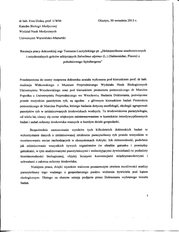 dr hab. Ewa Dzika, prof. U W M Olsztyn, 30 wrzesnia 2013 r. Katedra Biologii Medycznej Wydzial Nauk Medycznych Uniwersytet Warminsko-Mazurski Recenzja pracy doktorskiej mgr Tomasza Luczynskiego pt. „Hebnintofauna anadromicznych i rezydentalnych golc6w arktycznych Salvelinus alpinus (L.) (Salmonidae, Pisces) z pohidniowego Sphsbergenu" Przedstawiona do oceny rozprawa doktorska zostaia wykonana pod kierunkiem prof, dr hab. Andrzeja Witkowskiego z Muzeum Przyrodniczego Wydziahi Nauk Biologicznych Uniwersytetu Wroclawskiego oraz pod kierunkiem promotora pomocniczego dr Marcina Popiolka z Uniwersytetu Przyrodniczego we Wroctawiu. Badania Doktoranta, poswi^cone przede wszystkim pasotytora ryb, zgodne z gl6wnym kierunkiem badan Promotora pomocmczego dr Marcina Popiolka, ktorego badania dotycz^ morfologii, ekologii zgnipowan pasozytow ryb w zr6inicowanych srodowiskach wodnych. Ta ^rodowiskowa parazytologia, od wielu lat, cieszy si? coraz wiekszym zainteresowaniem w kontek^cie interdyscyplinamych badan i zadan ochrony ^rodowiska wainych w kazdym dziale gospodarki. Bezposrednie zastosowanie wynikow tych kilkuletnich doktorskich badan to wykorzystanie danych o zroznicowanej struktuize parazytofauny ryb przede wszystkim w monilorowaniu zmian zachodzqcych w ekosystemach Arktyki. Ich r64norodnosc, podobnie jak zro^cowanie wszystkich 2ywych organizm6w (w obr^bie gatunku i pomi^dzy gatunkami, w lym analizowanymi pasoiytniczymi i wolnozyj^cymi iywicielami) to podmioty bioroznorodno^i biologicznej, obj^tej licznymi konwencjami mi^dzynarodowymi 1 uchwalami z zakresu ochrony srodowiska. Niniejsza praca, dzi?ki wysokim walorom poznawczym otwiera mozliwo^ci analizy parazytofauny tego wainego z gospodarczego punktu widzenia iywiciela pod k^tem ekologicznym. Dlatego za shiszne uznaj? podj^cie przez Doktoranta wybranego tematu badan. 1 Praca spetnia wszystkie wymogi formalne i redakcyjne wlasciwe dia dysertacji naukowej.^ Tre^c - odpowiadaj^a tematowi okreslonemu w tytule - jest podzielona na standardowe w pracach przyrodniczych rozdziaiy. Ich uktad^, kolejnoSc jak i korapletno^c tez w Hcznych podrozdzialach nie budzi zastrze^en. Tabele (6) i ryciny (48) s^ integraln^ cz^sci^ struktury pracy. Prawidlowo zamieszczone w tekscie, dobrze metrycznych. Bibliografia (149 pozycji) obejmuje ilustruj^ setki danych wa^ejsze opracowania polskie v obcoj^zyczne w 100 letnim przedziale czasowym; najstarsza cytowana praca FriCa zostaia opublikowana w 1893 r., a najnowsza Zwolinski et al. w Polish Georaorphological Research w 2013. Nalezy podkre^lid, Doktorant wykazal %\bardzo dobr^ znajomosci^ literatury przedmiotu. Korzystal w wi^kszosci przypadkdw z oryginalnych prac naukowych. Liczne i trafioie dobrane cytaty potwierdzajq trafiio^c perspektywy badawczej Autora. Wst^p liczqcy 6 stron koncz^ jasno sprecyzowane cele badawcze. Doktorant we wst?pie bardzo wnikliwie przedstawil stan badan nad pasoiytami golca arktycznego w Europie i na swiecie. W tym kilkustronicowym syntetycznym p r z e g l ^ i e pismiennictwa zacytowano dobrze dobrane prace z zakresu ekologii pasozytnictwa ryb, zoogeografii i innych uwarunkowari ^rodowiskowych. W nast^pnym drugim podrozdziale (charakterystyka terenu badan str. 7 - 1 4 ) Autor zamie^il charakterystyk? przyrodnicz^ terenu badan zr64nicowanych pod poloienia geograficznego oraz czynnikow fizyko-chemicznych wzgl^dem wody. Ten podrozdzial powinien moim zdaniem znalezd si? w rozdziale „Material i metody" O wymogach i trudnosciach lakich badan terenowo-laboratoryjnych swiadczy, zamieszczony w Materialach i metodach rzeteiny opis technik i metod zwiqzanych z pozyskiwaniem materiaiu, konserwacj% diagnostykq i opracowaniem biologicznym, statystycznym oraz interpretacj^ Wymaga ona, z jednej strony interdyscyplinamej wiedzy przyrodniczej, a z drugiej - znajomoSci szczegolowych metod wla^ciwych dla poszczeg61nych dyscyplin naukowych. Doktorant bardzo dokladnie przedstawil charakterystyk? iywiciela. Wartosciowy jest opis zbierania pasozytow, ich diagnostyki, analizy parazytologicznej, ekoiogicznej i statystycznej. Wymienione wskazniki dominacji Bergera-Parkera, ' Obejmuje 120 stron, w tym wst^p (1-6), teren badan (7-14), material i metody (15-24), wyniki (25-88), dyskusja (89-101), wnioski (102-103), literatura (104-116), streszczenie (117118), summary (119-120). 2 roznorodno^i gatunkowej Simpsona, indeks podobienstwa Jaccarda, niepararaetryczne testy Manna-Whitneya czy Kruskala-WalUsa prawidJowo wykorzystano przy opracowywaniu wynik6w. Za celowe i bardzo poi^dane uwazam, zamieszczony takze w Materiaiach i metodach, dobrze opracowany slownik tenminow parazytologicznych, kt6rym prawidlowo poshiguje si? Autor w nast?pnych rozdzialach. Wyniki (64 strony) podzielono na cztery - stanowi^ce zasadnicz^ cz?sc rozprawy - podrozdziaiy p r e z e n t u j ^ calo^ciowy prawidlowo systematyczny przegl^ gatunkbw obejmujacy zaraienie ryb (ekstensywnosc, intensywno^c, wzgl?dne zag?szczenie, lokalizacj? w zywicielu) na badanych stanowiskach: w jeziorze, w rzece Revelva, oraz w przybrze&iej stiefie Morza Grenlandzkiego, struktur? topiczn^ oraz wsp61wyst?powanie i podobienstwo zgrupowan peisozytniczych w badanych biotopach. Z poznawczego punktu widzenia najbardziej warto^iowa jest dokumentacja ekologiczna. Obejmuje ona wielokierunkow^ analiz? 23 takson6w helmint6w nalez^ych do tasiemc6w, przywr i nicieni, ktore wyizolowano i zidentyfikowano z 43049 zebranych osobnikow podczas sekcji 216 golcow odtowionych w latach 2003 i 2008. Pasozyty zakwalifikowano do trzech grup systematycznych Digenea (8), Nematoda (8) i Cestoda (7). Nalezy podkreslid, te Doktorant wykonal benedyktynskq prac?, Doktorant wykazal si? nie latw^ umiej?tno^i^ pozyskiwania i konserwacji materiahi biologicznego oraz zdolnosciq jego identyfikacji (na podstawie stadi6w rozwojowych pasoiyt6w) oraz liczbowego opracowania na poziomie infra- i metapopulacji. Rozprawa doktorska mgr Tomasza Luczynskiego jest wartosciowym, przyrodniczym opracowaniem. Dane faktograficzne 