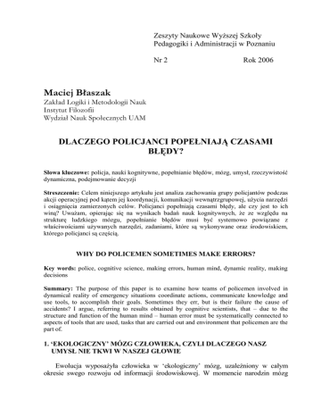 Zeszyty Naukowe Wyższej Szkoły Pedagogiki i Administracji w Poznaniu Nr 2 Rok 2006 Maciej Błaszak Zakład Logiki i Metodologii Nauk Instytut Filozofii Wydział Nauk Społecznych UAM DLACZEGO POLICJANCI POPEŁNIAJĄ CZASAMI BŁĘDY? Słowa kluczowe: policja, nauki kognitywne, popełnianie błędów, mózg, umysł, rzeczywistość dynamiczna, podejmowanie decyzji Streszczenie: Celem niniejszego artykułu jest analiza zachowania grupy policjantów podczas akcji operacyjnej pod kątem jej koordynacji, komunikacji wewnątrzgrupowej, użycia narzędzi i osiągnięcia zamierzonych celów. Policjanci popełniają czasami błędy, ale czy jest to ich winą? Uważam, opierając się na wynikach badań nauk kognitywnych, że ze względu na strukturę ludzkiego mózgu, popełnianie błędów musi być systemowo powiązane z właściwościami używanych narzędzi, zadaniami, które są wykonywane oraz środowiskiem, którego policjanci są częścią. WHY DO POLICEMEN SOMETIMES MAKE ERRORS? Key words: police, cognitive science, making errors, human mind, dynamic reality, making decisions Summary: The purpose of this paper is to examine how teams of policemen involved in dynamical reality of emergency situations coordinate actions, communicate knowledge and use tools, to accomplish their goals. Sometimes they err, but is their failure the cause of accidents? I argue, referring to results obtained by cognitive scientists, that – due to the structure and function of the human mind – human error must be systematically connected to aspects of tools that are used, tasks that are carried out and environment that policemen are the part of. 1. ‘EKOLOGICZNY’ MÓZG CZŁOWIEKA, CZYLI DLACZEGO NASZ UMYSŁ NIE TKWI W NASZEJ GŁOWIE Ewolucja wyposażyła człowieka w „ekologiczny‟ mózg, uzależniony w całym okresie swego rozwoju od informacji środowiskowej. W momencie narodzin mózg 156 Prewencja noworodka jest czterokrotnie lżejszy od mózgu dorosłego człowieka, co oznacza, że trzy czwarte jego masy przyrasta, różnicuje się i specjalizuje poza organizmem matki, w bezpośrednim oddziaływaniu z otoczeniem zewnętrznym.182 Choć dobór niewątpliwie wyposażył nasz układ nerwowy w różnorodne biologiczne predyspozycje (z definicji warunkowane genetycznie), rzeczywiste możliwości poznawcze Homo sapiens mogą być zrealizowane jedynie w procesie interakcji ze światem, czyli według reguł epigenetycznych. Doświadczenie jest zatem kluczowym czynnikiem sterującym rozwojem ludzkiego mózgu. Jego dojrzewanie wykazuje liczne „ekologiczne‟ odchylenia w porównaniu z pozostałymi prymatami: rozwój jest dramatycznie spowolniony już w życiu płodowym, co oznacza, że mózg „oczekuje‟ na doświadczenie zewnętrzne (małpy są znacznie dojrzalsze w momencie narodzin); po narodzinach sytuacja ulega odwróceniu – tempo płodowe (dla niemowlaka bardzo szybkie) utrzymuje się do drugiego roku życia, kiedy to mózg pobudzany przez otoczenie rozwija się błyskawicznie (u małp, po narodzinach, dojrzewanie mózgu ulega drastycznemu spowolnieniu, przez co jest mniej zależne od doświadczenia); mielinizacja neuronów, czyli „udrożnienie‟ kanałów komunikacyjnych w mózgu ulega zakończeniu dopiero w szóstym roku życia, a dojrzewanie wszystkich modułów neuronalnych – w wieku nastolatków. W dorosłym człowieku przez całe jego życie „tkwi dziecko‟, gdyż zarówno anatomicznie (proporcje ciała), jak i behawioralnie (skłonność do zabawy) przypomina młodego szympansa – cechy ludzkie są młodocianymi cechami jego przodków (jest to zjawisko neotenii). Wszystko to oznacza, iż rozwój człowieka uległ znacznemu spowolnieniu183, a ewolucyjnie zostaliśmy zaprogramowani na wydłużone dzieciństwo, opiekę rodziców i socjalizację. Z przedstawionej historii, którą nakreśliła ewolucja, można wyciągnąć trzy ważne wnioski: Po pierwsze, aparat poznawczy wyewoluował po to, by podwyższyć wartość przystosowawczą jego właściciela. Oznacza to, że dla doboru jest istotne nie to, jak doświadczamy świat naszym umysłem (za pomocą naszego mózgu), lecz to, co dzięki naszemu umysłowi potrafimy zdziałać w świecie. Tym samym, punkt ciężkości ulega przeniesieniu z obszaru przeżyć, na obszar aktywności człowieka – jedynie ona może być widoczna dla doboru naturalnego. Pierwszym kluczem do zrozumienia natury ludzkiego umysłu jest zatem uchwycenie wzorców działania człowieka, sposobów jego bycia w-świecie. Po drugie, badanie umysłu człowieka musi koncentrować się w równej mierze na jego psychologii, co na środowisku zadań, które realizuje poprzez podejmowane działania.184 Obydwa aspekty procesu poznawczego są wzajemnie zależne i łącznie determinują funkcjonowanie człowieka w-świecie, „są jak figura i tło – chociaż, który jest który, zależy od chwilowego punktu widzenia.”185 Teoria procesów poznawczych raz koncentruje się na aspekcie „wewnętrznej‟ psychologii jednostki, innym razem na aspekcie „zewnętrznego‟ środowiska, które jednostka „zamieszkuje‟, które jest środowiskiem jej życia (Umwelt). Drugim kluczem dającym nadzieję przybliżenia się do zagadki ludzkiego umysłu jest opisanie i interpretacja środowiska ludzkich działań. 182 Passingham R., The Human Primate, Oxford 1982. T. Deacon, The Symbolic Species, New York 1997. 184 A. Newell, , H. Simon, Human problem solving, Englewood Cliffs (NJ) 1972. 185 Ibidem, s. 55. 183 Maciej Błaszak– Dlaczego policjanci popełniają czasami błędy? 157 Po trzecie, ekologiczny mózg człowieka nie rozwija się wyłącznie w środowisku naturalnym. Paradoksalnie, bardziej „naturalnym‟ dla naszego aparatu poznawczego jest środowisko kultury, wysyłające całą masę „kulturowych ofert‟ analogicznych do ofert (affordances) środowiska naturalnego. Wydaje się, iż podstawowym parametrem ofert tego nowego typu jest ich użyteczność, a przedmiot