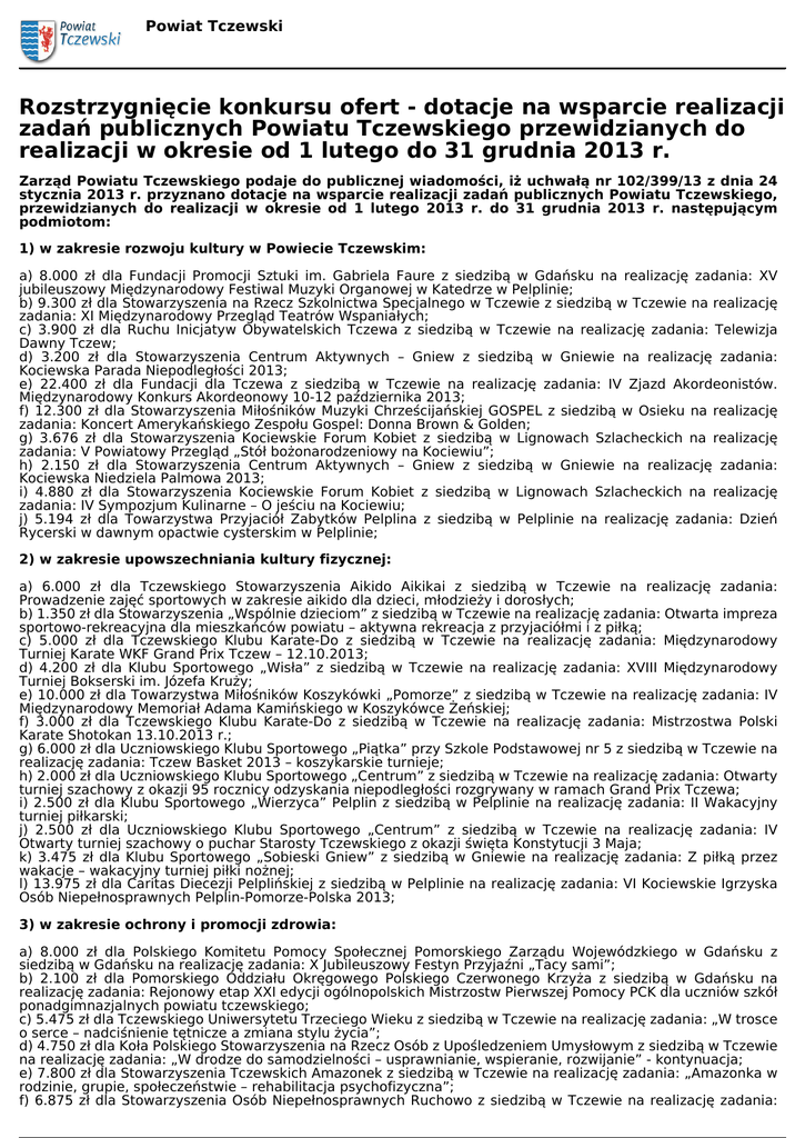 Powiat Tczewski Rozstrzygnięcie konkursu ofert - dotacje na wsparcie realizacji zadań publicznych Powiatu Tczewskiego przewidzianych do realizacji w okresie od 1 lutego do 31 grudnia 2013 r. Zarząd Powiatu Tczewskiego podaje do publicznej wiadomości, iż uchwałą nr 102/399/13 z dnia 24 stycznia 2013 r. przyznano dotacje na wsparcie realizacji zadań publicznych Powiatu Tczewskiego, przewidzianych do realizacji w okresie od 1 lutego 2013 r. do 31 grudnia 2013 r. następującym podmiotom: 1) w zakresie rozwoju kultury w Powiecie Tczewskim: a) 8.000 zł dla Fundacji Promocji Sztuki im. Gabriela Faure z siedzibą w Gdańsku na realizację zadania: XV jubileuszowy Międzynarodowy Festiwal Muzyki Organowej w Katedrze w Pelplinie; b) 9.300 zł dla Stowarzyszenia na Rzecz Szkolnictwa Specjalnego w Tczewie z siedzibą w Tczewie na realizację zadania: XI Międzynarodowy Przegląd Teatrów Wspaniałych; c) 3.900 zł dla Ruchu Inicjatyw Obywatelskich Tczewa z siedzibą w Tczewie na realizację zadania: Telewizja Dawny Tczew; d) 3.200 zł dla Stowarzyszenia Centrum Aktywnych – Gniew z siedzibą w Gniewie na realizację zadania: Kociewska Parada Niepodległości 2013; e) 22.400 zł dla Fundacji dla Tczewa z siedzibą w Tczewie na realizację zadania: IV Zjazd Akordeonistów. Międzynarodowy Konkurs Akordeonowy 10-12 października 2013; f) 12.300 zł dla Stowarzyszenia Miłośników Muzyki Chrześcijańskiej GOSPEL z siedzibą w Osieku na realizację zadania: Koncert Amerykańskiego Zespołu Gospel: Donna Brown & Golden; g) 3.676 zł dla Stowarzyszenia Kociewskie Forum Kobiet z siedzibą w Lignowach Szlacheckich na realizację zadania: V Powiatowy Przegląd „Stół bożonarodzeniowy na Kociewiu”; h) 2.150 zł dla Stowarzyszenia Centrum Aktywnych – Gniew z siedzibą w Gniewie na realizację zadania: Kociewska Niedziela Palmowa 2013; i) 4.880 zł dla Stowarzyszenia Kociewskie Forum Kobiet z siedzibą w Lignowach Szlacheckich na realizację zadania: IV Sympozjum Kulinarne – O jeściu na Kociewiu; j) 5.194 zł dla Towarzystwa Przyjaciół Zabytków Pelplina z siedzibą w Pelplinie na realizację zadania: Dzień Rycerski w dawnym opactwie cysterskim w Pelplinie; 2) w zakresie upowszechniania kultury fizycznej: a) 6.000 zł dla Tczewskiego Stowarzyszenia Aikido Aikikai z siedzibą w Tczewie na realizację zadania: Prowadzenie zajęć sportowych w zakresie aikido dla dzieci, młodzieży i dorosłych; b) 1.350 zł dla Stowarzyszenia „Wspólnie dzieciom” z siedzibą w Tczewie na realizację zadania: Otwarta impreza sportowo-rekreacyjna dla mieszkańców powiatu – aktywna rekreacja z przyjaciółmi i z piłką; c) 5.000 zł dla Tczewskiego Klubu Karate-Do z siedzibą w Tczewie na realizację zadania: Międzynarodowy Turniej Karate WKF Grand Prix Tczew – 12.10.2013; d) 4.200 zł dla Klubu Sportowego „Wisła” z siedzibą w Tczewie na realizację zadania: XVIII Międzynarodowy Turniej Bokserski im. Józefa Kruży; e) 10.000 zł dla Towarzystwa Miłośników Koszykówki „Pomorze” z siedzibą w Tczewie na realizację zadania: IV Międzynarodowy Memoriał Adama Kamińskiego w Koszykówce Żeńskiej; f) 3.000 zł dla Tczewskiego Klubu Karate-Do z siedzibą w Tczewie na realizację zadania: Mistrzostwa Polski Karate Shotokan 13.10.2013 r.; g) 6.000 zł dla Uczniowskiego Klubu Sportowego „Piątka” przy Szkole Podstawowej nr 5 z siedzibą w Tczewie na realizację zadania: Tczew Basket 2013 – koszykarskie turnieje; h) 2.000 zł dla Uczniowskiego Klubu Sportowego „Centrum” z siedzibą w Tczewie na realizację zadania: Otwarty turniej szachowy z okazji 95 rocznicy odzyskania niepodległości rozgrywany w ramach Grand Prix Tczewa; i) 2.500 zł dla Klubu Sportowego „Wierzyca” Pelplin z siedzibą w Pelplinie na realizację zadania: II Wakacyjny turniej piłkarski; j) 2.500 zł dla Uczniowskiego Klubu Sportowego „Centrum” z siedzibą w Tczewie na realizację zadania: IV Otwarty turniej szachowy o puchar Starosty Tczewskiego z okazji święta Konstytucji 3 Maja; k) 3.475 zł dla Klubu Sportowego „Sobieski Gniew” z siedzibą w Gniewie na realizację zadania: Z piłką przez wakacje – wakacyjny turniej piłki nożnej; l) 13.975 zł dla Caritas Diecezji Pelplińskiej z siedzibą w Pelplinie na realizację zadania: VI Kociewskie Igrzyska Osób Niepełnosprawnych Pelplin-Pomorze-Polska 2013; 3) w zakresie ochrony i promocji zdrowia: a) 8.000 zł dla Polskiego Komitetu Pomocy Społecznej Pomorskiego Zarządu Wojewódzkiego w Gdańsku z siedzibą w Gdańsku na realizację zadania: X Jubileuszowy Festyn Przyjaźni „Tacy sami”; b) 2.100 zł dla Pomorskiego Oddziału Okręgowego Polskiego Czerwonego Krzyża z siedzibą w Gdańsku na realizację zadania: Rejonowy etap XXI edycji ogólnopolskich Mistrzostw Pierwszej Pomocy PCK dla uczniów szkół ponadgimnazjalnych powiatu tczewskiego; c) 5.475 zł dla Tczewskiego Uniwersytetu Trzeciego Wieku z siedzibą w Tczewie na realizację zadania: „W trosce o serce – nadciśnienie tętnicze a zmiana stylu życia”; d) 4.750 zł dla Koła Polskiego Stowarzyszenia na Rzecz Osób z Upośledzeniem Umysłowym z siedzibą w Tczewie na realizację zadania: „W drodze do samodzielności – usprawnianie, wspieranie, rozwijanie” - kontynuacja; e) 7.800 zł dla Stowarzyszenia Tczewskich Amazonek z siedzibą w Tczewie na realizację zadania: „Amazonka w rodzinie, grupie, społeczeństwie – rehabilitacja psychofizyczna”; f) 6.875 zł dla Stowarzyszenia Osób Niepełnosprawnych Ruchowo z siedzibą w Tczewie na realizację zadania: Powiat Tczewski Zdrowiej żyć; 4) w zakresie ochrony środowiska: a) 4.000 zł dla Stowarzyszenia Centrum Aktywnych – Gniew z siedzibą w Gniewie na realizację zadania: II Powiatowy Konkurs Wiedzy Ekologicznej; b) 3.000 zł dla Pomorskiego Oddziału Okręgowego Polskiego Czerwonego Krzyża z siedzibą w Gdańsku na realizację zadania: Szkoda pieniędzy na reklamówki … jednorazowe jest obciachowe. Załącz