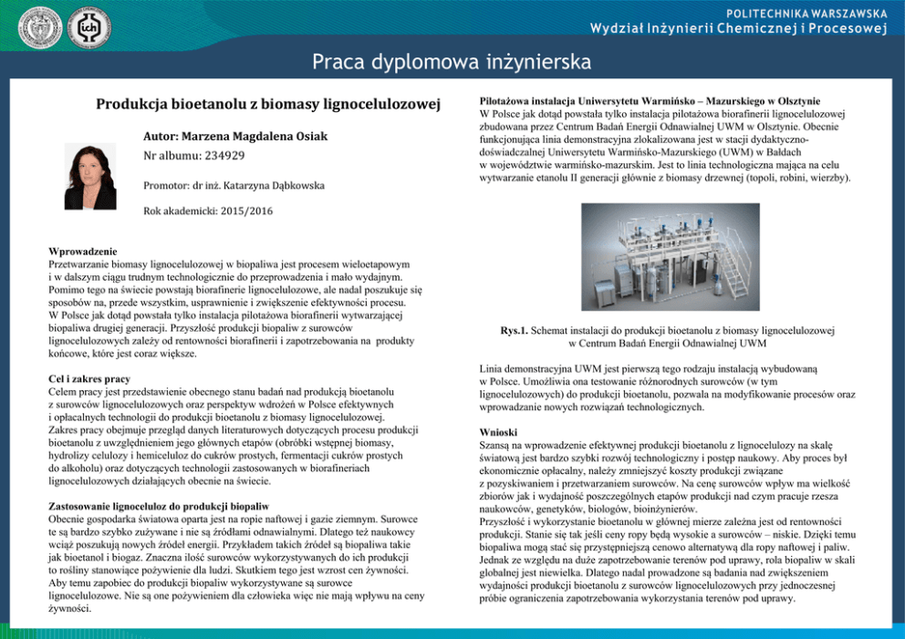 Praca dyplomowa inżynierska Produkcjabioetanoluzbiomasylignocelulozowej Autor:MarzenaMagdalenaOsiak Nralbumu:234929 Promotor:drinż.KatarzynaDąbkowska Pilotażowa instalacja Uniwersytetu Warmińsko – Mazurskiego w Olsztynie W Polsce jak dotąd powstała tylko instalacja pilotażowa biorafinerii lignocelulozowej zbudowana przez Centrum Badań Energii Odnawialnej UWM w Olsztynie. Obecnie funkcjonująca linia demonstracyjna zlokalizowana jest w stacji dydaktycznodoświadczalnej Uniwersytetu Warmińsko-Mazurskiego (UWM) w Bałdach w województwie warmińsko-mazurskim. Jest to linia technologiczna mająca na celu wytwarzanie etanolu II generacji głównie z biomasy drzewnej (topoli, robini, wierzby). Rokakademicki:2015/2016 Wprowadzenie Przetwarzanie biomasy lignocelulozowej w biopaliwa jest procesem wieloetapowym i w dalszym ciągu trudnym technologicznie do przeprowadzenia i mało wydajnym. Pomimo tego na świecie powstają biorafinerie lignocelulozowe, ale nadal poszukuje się sposobów na, przede wszystkim, usprawnienie i zwiększenie efektywności procesu. W Polsce jak dotąd powstała tylko instalacja pilotażowa biorafinerii wytwarzającej biopaliwa drugiej generacji. Przyszłość produkcji biopaliw z surowców lignocelulozowych zależy od rentowności biorafinerii i zapotrzebowania na produkty końcowe, które jest coraz większe. Cel i zakres pracy Celem pracy jest przedstawienie obecnego stanu badań nad produkcją bioetanolu z surowców lignocelulozowych oraz perspektyw wdrożeń w Polsce efektywnych i opłacalnych technologii do produkcji bioetanolu z biomasy lignocelulozowej. Zakres pracy obejmuje przegląd danych literaturowych dotyczących procesu produkcji bioetanolu z uwzględnieniem jego głównych etapów (obróbki wstępnej biomasy, hydrolizy celulozy i hemiceluloz do cukrów prostych, fermentacji cukrów prostych do alkoholu) oraz dotyczących technologii zastosowanych w biorafineriach lignocelulozowych działających obecnie na świecie. Zastosowanie lignoceluloz do produkcji biopaliw Obecnie gospodarka światowa oparta jest na ropie naftowej i gazie ziemnym. Surowce te są bardzo szybko zużywane i nie są źródłami odnawialnymi. Dlatego też naukowcy wciąż poszukują nowych źródeł energii. Przykładem takich źródeł są biopaliwa takie jak bioetanol i biogaz. Znaczna ilość surowców wykorzystywanych do ich produkcji to rośliny stanowiące pożywienie dla ludzi. Skutkiem tego jest wzrost cen żywności. Aby temu zapobiec do produkcji biopaliw wykorzystywane są surowce lignocelulozowe. Nie są one pożywieniem dla człowieka więc nie mają wpływu na ceny żywności. Rys.1. Schemat instalacji do produkcji bioetanolu z biomasy lignocelulozowej w Centrum Badań Energii Odnawialnej UWM Linia demonstracyjna UWM jest pierwszą tego rodzaju instalacją wybudowaną w Polsce. Umożliwia ona testowanie różnorodnych surowców (w tym lignocelulozowych) do produkcji bioetanolu, pozwala na modyfikowanie procesów oraz wprowadzanie nowych rozwiązań technologicznych. Wnioski Szansą na wprowadzenie efektywnej produkcji bioetanolu z lignocelulozy na skalę światową jest bardzo szybki rozwój technologiczny i postęp naukowy. Aby proces był ekonomicznie opłacalny, należy zmniejszyć koszty produkcji związane z pozyskiwaniem i przetwarzaniem surowców. Na cenę surowców wpływ ma wielkość zbiorów jak i wydajność poszczególnych etapów produkcji nad czym pracuje rzesza naukowców, genetyków, biologów, bioinżynierów. Przyszłość i wykorzystanie bioetanolu w głównej mierze zależna jest od rentowności produkcji. Stanie się tak jeśli ceny ropy będą wysokie a surowców – niskie. Dzięki temu biopaliwa mogą stać się przystępniejszą cenowo alternatywą dla ropy naftowej i paliw. Jednak ze względu na duże zapotrzebowanie terenów pod uprawy, rola biopaliw w skali globalnej jest niewielka. Dlatego nadal prowadzone są badania nad zwiększeniem wydajności produkcji bioetanolu z surowców lignocelulozowych przy jednoczesnej próbie ograniczenia zapotrzebowania wykorzystania terenów pod uprawy.