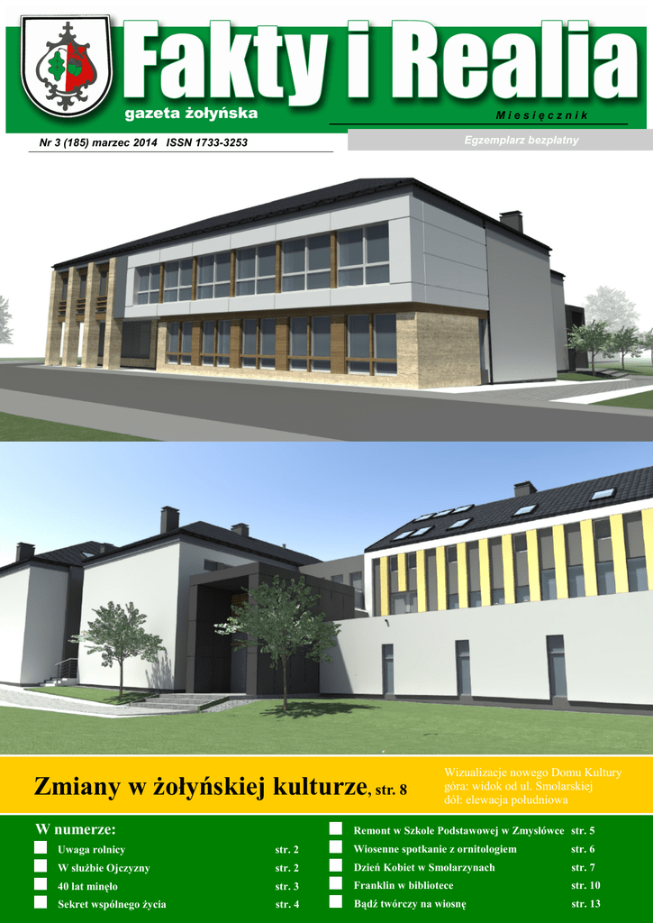 Fakty i Realia - gazeta żołyńska o Miesięcznik Egzemplarz bezpłatny Nr 3 (185) marzec 2014 ISSN 1733-3253 Zmiany w żołyńskiej kulturze, str. 8 W numerze: Wizualizacje nowego Domu Kultury góra: widok od ul. Smolarskiej dół: elewacja południowa Remont w Szkole Podstawowej w Zmysłówce str. 5 Uwaga rolnicy str. 2 Wiosenne spotkanie z ornitologiem W służbie Ojczyzny str. 2 Dzień Kobiet w Smolarzynach 40 lat minęło str. 3 Franklin w bibliotece Sekret wspólnego życia str. 4 Bądź twórczy na wiosnę str. 6 str. 7 Nr 3 (185) marzec 2014 str. 10 str. 13 2 Fakty i Realia - gazeta żołyńska Sprawy gminy Uwaga rolnicy J ak co roku Ośrodek Doradztwa Rolniczego pomaga rolnikom w wypełnianiu wniosków obszarowych. Termin pomocy trwa od 17 marca do 15 maja br. Jeżeli rolnik chce mieć pewność, że wniosek zostanie prawidłowo wypełniony powinien skorzystać z usług doradcy. Pomoc będzie udzielana w biurze doradcy w Urzędzie Gminy w Żołyni w każdy poniedziałek, czwartek i pią- tek w godzinach od 7.30 do 15.30 oraz w Brzózie Stadnickiej w Domu Kultury w każdą sobotę od 29.03 br. od godz. 9.00 do 14.00. Jednocześnie informuje się, że w roku bieżących nastąpiły zmiany w wypełnianiu wniosków. Ponadto informuje się rolników o okresowych badaniach opryskiwaczy (atestacja), której celem jest stwierdzenie sprawności technicznej. W służbie Ojczyzny W związku z nadaniem przez Ministra Obrony Narodowej medalu „Za Zasługi dla Obronności Kraju” w dniu 19 marca 2014 roku odbyło się w Łańcucie uroczyste wręczenie medali rodzicom, którzy wychowali wiele dzieci na wzorowych i ofiarnych żołnierzy. Z terenu naszej gminy medale i upominki otrzymały następujące osoby: 1) Bechta Janina, zam. Zakącie 2) Rozalia i Józef Brzeziccy, zam. Żołynia, ul. Białobrzeska 3) Dobrzański Jan, zam. Żołynia, ul. Białobrzeska 4) Domagała Janina, zam. Żołynia, ul. Kmiecie Uroczystość rozpoczęła się odśpiewaniem „Mazurka Dąbrowskiego”. Następnie Wojskowy Komendant Uzupełnień płk Marcin Żal odczytał Rozporządzenie Ministra Obrony Narodowej w sprawie nadania medali „Za zasługi dla obronności kraju”, po czym nastąpiło uroczyste wręczenie odznaczeń, kwiatów i upominków. Odznaczonym osobom z terenu naszej gminy aktu wręczenia dokonali Wojskowy Komendant Uzupełnień w Rzeszowie pan płk Marcin Żal, Starosta Łańcucki pan Adam Krzysztoń oraz Wójt Gminy Żołynia pan Andrzej Sprawny, wyregulowany opryskiwacz jest gwarancją uzyskania skutecznych zabiegów, zwiększenia wydajności pracy, obniżania kosztów ochrony, a co najważniejsze ogranicza zagrożenie dla zdrowia ludzi, zwierząt i środowiska. Przypomina się, że atestacja ważna jest tylko 3 lata. Rolnicy, którzy chcą dokonać badań opryskiwaczy mogą zgłaszać potrzeby w Biurze Doradztwa Rolniczego w Urzędzie w Żołyni w terminie do 10 kwietnia br. Józef Fus Benedyk. Po uroczystym wręczeniu odznaczeń odbyła się część artystyczna, a następnie poczęstunek. Uroczystość przebiegała w przyjemnym klimacie wzajemnego szacunku oraz uznania dla osób wyróżnionych przez Ministra Obrony Narodowej RP. Piotr Kuras „Fakty i Realia” Wydawca: Wójt Gminy Żołynia, 37-110 Żołynia, ul.Rynek 22, tel. 0172243018, fax. 0172243476, e-mail: [email protected], www.zolynia.pl Redaktor naczelna: Magdalena Kątnik-Kowalska, Redakcja: Gminny Ośrodek Kultury w Żołyni, ul.Smolarska 1, tel. 0172243061, e-mail: [email protected], Druk: TECHGRAF Łańcut. Nakład 1000 egz. Redakcja zastrzega sobie prawo redagowania nadesłanych tekstów i nie odpowiada za treść zamieszczanych reklam. Nr 3 (185) marzec 2014 Fakty i Realia - gazeta żołyńska 3o wy pytań wylosowane w listopadzie i grudniu 1973 r. oraz w styczniu 1974 r. odpowiedział w Zenon Rymkiewicz zwycięzcą „Wielkiej Gry” ciągu kilkudziesięciu sekund. Wspominając przygotowania do numerze z 28 marca uczestników pierwszego podejturnieju p. Zenon mówi, że trudno 1974r. Nowiny Rzeszowścia do dalszego udziału w telebyło pogodzić pracę zawodową z skie podały: „Od dwóch tygodni turnieju zakwalifikowano tylko udziałem w teleturniejach, zwłanajpopularniejszym mieszkańcem dwie osoby. Konkursowy kolega szcza że podczas przygotowań do Żołyni, w powiecie łańcuckim, Zenona Rymkiewicza zakończył eliminacji pisemnych kontynujest nauczyciel miejscowej Szkoswój udział na pytaniach za ował zaoczne studia w rzeszowły Podstawowej - Zenon Rymkie12800 zł, natomiast p. Zenon nie skiej WSP. Przed finałem miał wicz”. Tytuł artykułu brzmiał: zrezygnował z sięgnięcia po trochę więcej czasu, bo na jego „Moją pasją jest geografia - mówi główną wygraną, gdyż jak powieprośbę przesunięto termin startu o laureat teleturnieju WIELKA dział, nie chciał sprawić zawodu miesiąc, jednak w tym czasie barGRA - Zenon Rymkiewicz z Żotym, którzy na niego postawili, tj. dzo absorbowała go znowu praca łyni.” wszystkim mieszkańcom Żołyni, zawodowa, gdyż w szkole, w któTuż po wygranej, dziennikarz a zwłaszcza młodzieży szkolnej. rej uczył kończył się akurat Nowin Adam Kupierwszy okres. nysz, odwiedził p. Nagroda w wysoZenona w Żołyni. kości 25 tys. zł była Gdy po wyjściu z aurównowartością rocztobusu zapytał pierwnych poborów laureszego napotkanego ata. Zapytany przez przechodnia o adres dziennikarza na co nauczyciela, ten jedzostanie przeznaczona nym tchem wskazał: wygrana odpowieTo ten, który wygrał dział: - Oczywiście na w Telewizji 25 tys. wycieczkę zagrazł. Mieszka na Raniczną. Marzył wówkach. Dziennikarz czas o wakacyjnym, zastał p. Zenona pokilkutygodniowym chylonego nad stourlopie z małżonką, sem zeszytów szkolnajchętniej w Turcji nych, profesor popralub Grecji. wiał właśnie wypra- Z.Rymkiewicz (z lewej) w finale, zdjęcie z ekranu telewizora PS Pan Zenon odwiecowania klasowe z języka rosyjW drodze do finału nie obyło się dził mnie w lutym