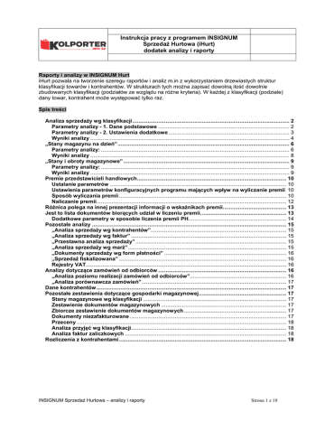 Instrukcja pracy z programem INSIGNUM Sprzedaż Hurtowa (iHurt) dodatek analizy i raporty Raporty i analizy w INSIGNUM Hurt iHurt pozwala na tworzenie szeregu raportów i analiz m.in z wykorzystaniem drzewiastych struktur klasyfikacji towarów i kontrahentów. W strukturach tych można zapisać dowolną ilość dowolnie zbudowanych klasyfikacji (podziałów ze wzglądu na różne kryteria). W każdej z klasyfikacji (podziale) dany towar, kontrahent może występować tylko raz. Spis treści Analiza sprzedaży wg klasyfikacji ........................................................................................................ 2 Parametry analizy - 1. Dane podstawowe ....................................................................................... 2 Parametry analizy - 2. Ustawienia dodatkowe ................................................................................ 3 Wyniki analizy .................................................................................................................................... 4 „Stany magazynu na dzień”.................................................................................................................. 6 Parametry analizy: ............................................................................................................................. 6 Wyniki analizy .................................................................................................................................... 8 „Stany i obroty magazynowe” .............................................................................................................. 9 Parametry analizy: ............................................................................................................................. 9 Wyniki analizy .................................................................................................................................... 9 Premie przedstawicieli handlowych................................................................................................... 10 Ustalanie parametrów ..................................................................................................................... 10 Ustawienia parametrów konfiguracyjnych programu mających wpływ na wyliczanie premii 10 Sposób wyliczania premii ............................................................................................................... 10 Naliczanie premii.............................................................................................................................. 12 Różnica polega na innej prezentacji informacji o wskaźnikach premii.......................................... 13 Jest to lista dokumentów biorących udział w liczeniu premii......................................................... 13 Dodatkowe parametry w sposobie liczenia premii PH................................................................. 14 Pozostałe analizy ................................................................................................................................. 15 „Analiza sprzedaży wg kontrahentów”.......................................................................................... 15 „Analiza sprzedaży wg faktur” ....................................................................................................... 15 „Przestawna analiza sprzedaży” .................................................................................................... 15 „Analiza sprzedaży wg marż”......................................................................................................... 15 „Dokumenty sprzedaży wg form płatności” ................................................................................. 16 „Sprzedaż fiskalizowana” ............................................................................................................... 16 Rejestry VAT..................................................................................................................................... 16 Analizy dotyczące zamówień od odbiorców ..................................................................................... 16 „Analiza poziomu realizacji zamówień od odbiorców”................................................................ 16 „Analiza porównawcza zamówień”................................................................................................ 17 Dane kontrahentów .............................................................................................................................. 17 Pozostałe zestawienia dotyczące gospodarki magazynowej.......................................................... 17 Stany magazynowe wg klasyfikacji ............................................................................................... 17 Zestawienie dokumentów magazynowych ................................................................................... 17 Zbiorcze zestawienie dokumentów magazynowych .................................................................... 17 Dokumenty niezafakturowane ........................................................................................................ 17 Przeceny ........................................................................................................................................... 18 Analiza przyjęć wg klasyfikacji....................................................................................................... 18 Analiza faktur zaliczkowych ........................................................................................................... 18 Rozliczenia z kontrahentami ............................................................................................................... 18 INSIGNUM Sprzedaż Hurtowa – analizy i raporty Strona 1 z 18 Analiza sprzedaży wg klasyfikacji Analiza dostępna z menu głównego iHurt poprzez wybranie „Zestawienia ->
