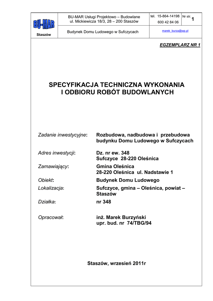 BU-MAR Usługi Projektowo – Budowlane ul. Mickiewicza 18/3, 28 – 200 Staszów Staszów tel. 15-864-14198 Nr str. 600 42 84 06 Budynek Domu Ludowego w Sufczycach 1 [email protected] EGZEMPLARZ NR 1 SPECYFIKACJA TECHNICZNA WYKONANIA I ODBIORU ROBÓT BUDOWLANYCH Zadanie inwestycyjne: Rozbudowa, nadbudowa i przebudowa budynku Domu Ludowego w Sufczycach Adres inwestycji: Dz. nr ew. 348 Sufczyce 28-220 Oleśnica Zamawiający: Gmina Oleśnica 28-220 Oleśnica ul. Nadstawie 1 Obiekt: Budynek Domu Ludowego Lokalizacja: Sufczyce, gmina – Oleśnica, powiat – Staszów Działka: nr 348 Opracował: inż. Marek Burzyński upr. bud. nr 74/TBG/94 Staszów, wrzesień 2011r BU-MAR Usługi Projektowo – Budowlane ul. Mickiewicza 18/3, 28 – 200 Staszów Budynek Domu Ludowego w Sufczycach Staszów tel. 15-864-14198 Nr str. 600 42 84 06 2 [email protected] CZĘŚĆ OGÓLNA 1. WSTĘP 1.1. Przedmiot Specyfikacji Technicznej Przedmiotem niniejszej specyfikacji technicznej są wymagania dotyczące wykonania i odbioru robót budowlanych związanych z rozbudową, nadbudową i przebudową Domu Ludowego w Sufczycach, wraz przyłączem kanalizacyjnym ze zbiornikiem ścieków, utwardzenie terenu oraz remontem ogrodzenia. 1.2. Inwestor Inwestorem bezpośrednim planowanej inwestycji jest Gmina Oleśnica, 28-220 Oleśnica ul. Nadstawie 1 1.3. Zakres stosowania specyfikacji technicznej Specyfikacja techniczna jest jednym z dokumentów niezbędnych przy udzielaniu zamówień publicznych i stanowi zbiór wymagań w zakresie sposobu wykonywania robót budowlanych, obejmujący w szczególności wymagania właściwości materiałów, wymagania dotyczące sposobu wykonania i oceny prawidłowości wykonania poszczególnych robót. 1.4. Zakres robót objętych Specyfikacją Techniczną Ustalenia zawarte w niniejszej specyfikacji obejmują wymagania ogólne dotyczące realizacji robót. 1.5. 0kreślenia podstawowe − Kierownik robót - osoba wyznaczona przez Wykonawcę, upoważniona do kierowania robotami i reprezentacji w sprawie realizacji przedmiotu umowy. − Kosztorys ofertowy - kalkulacja ceny oferty. − Materiały - wszelkie tworzywa i produkty, niezbędne do wykonywania robót, zgodne z dokumentacją projektowo - kosztorysową, zaakceptowane przez Zamawiającego − Polecenie Zamawiającego - wszelkie polecenia przekazywane Wykonawcy przez przedstawiciela Zamawiającego w formie pisemnej, dotyczące sposobu realizacji robót lub innych spraw. − Projektant - uprawniona osoba prawna lub fizyczna będąca autorem dokumentacji projektowej. 1.6. Ogólne wymagania dotyczące robót Wykonawca powinien wykonać pracę kompletnie i rzetelnie, zgodnie z obowiązującymi Polskimi Normami i przepisami, wszystkie roboty winny być wykonane zgodnie z zasadami sztuki budowlanej. Wykonawca musi brać pod uwagę wszystkie trudności, wynikające z usytuowania budowy i podłączenia sieci do instalacji pracujących. Wykonawca odpowiada za wszelkie szkody, wynikłe z wykonywania przez niego robót, a także za skutki wynikające z nieprzestrzegania przepisów lub obowiązujących norm i regulaminów przez siebie i podległe mu jednostki. Powstałe szkody Wykonawca na własny koszt musi usunąć i we własnym zakresie dokonać stosownych napraw. Dotyczy to tak terenu inwestycji jak i dróg publicznych. Wszystkie materiały budowlane muszą odpowiadać wymogom technicznych, stawianym w Specyfikacji Technicznej i mieć określone źródło pochodzenia, co będzie przedmiotem akceptacji lub odrzucenia przez Inwestora. BU-MAR Usługi Projektowo – Budowlane ul. Mickiewicza 18/3, 28 – 200 Staszów Staszów Budynek Domu Ludowego w Sufczycach tel. 15-864-14198 Nr str. 600 42 84 06 3 [email protected] Wykonawca będzie zobowiązany do udowodnienia właściwego wykonania robót budowlanych przez wykonanie stosownych prób i badań, zakończonych odbiorami technicznymi. Odpowiedzialny za organizację stosownych odbiorów technicznych jest Wykonawca, który ponosi też ewentualne ich koszty, chyba że umowa z Inwestorem stanowi inaczej. W zakresie dostawy maszyn, urządzeń i pozostałego wyposażenia, Wykonawca musi uzyskać akceptację Inwestora, udowadniając, że proponowane urządzenia spełniają wszystkie wymogi Specyfikacji Technicznej i wymienionych w niej norm oraz, że proponowani producenci są znanymi wytwórcami tych urządzeń i posiadają wystarczające doświadczenie dla realizacji dostawy. Dla udowodnienia tego faktu, na żądanie Inwestora, Wykonawca może być zobowiązany do przedstawienia list referencyjnych producentów wskazanych urządzeń. 1.7. Przekazanie placu budowy Zamawiający w terminie określonym w umowie przekaże Wykonawcy plac budowy wraz ze wszystkimi wymaganymi uzgodnieniami prawnymi i administracyjnymi. Na Wykonawcy spoczywa odpowiedzialność za ochronę przekazanego mu placu budowy do chwili odbioru końcowego robót. Uszkodzone lub zniszczone elementy i urządzenia znajdujące się na placu budowy Wykonawca odtworzy i naprawi na własny koszt. 1.8. Zgodność robót z dokumentacją projektową i specyfikacją techniczną Specyfikacja techniczna oraz dodatkowe dokumenty przekazane Wykonawcy przez zamawiającego stanowią część umowy, a wymagania wyszczególnione choćby w jednym z nich są obowiązujące dla Wykonawcy tak jakby były w całej dokumentacji. W przypadku rozbieżności w ustaleniach w poszczególnych dokumentach obowiązuje kolejność ich ważności wymieniona w umowie. Wykonawca nie może wykorzystywać błędów lub opuszczeń w dokumentach przetargowych, a o ich wykryciu należy powiadomić Zamawiającego, który dokona odpowiednich zmian i poprawek. W przypadku rozbieżności, opis wymiarów jest ważniejszy od odczytu ze skali rysunków. Wszystkie wykonywane roboty oraz dostarczone materiały muszą być zgodne specyfikacją techniczną. Dane określone w specyfikacji technicznej powinny być uważane za wielkości docelowe, od których dopuszczalne są odchylenia w ramach 