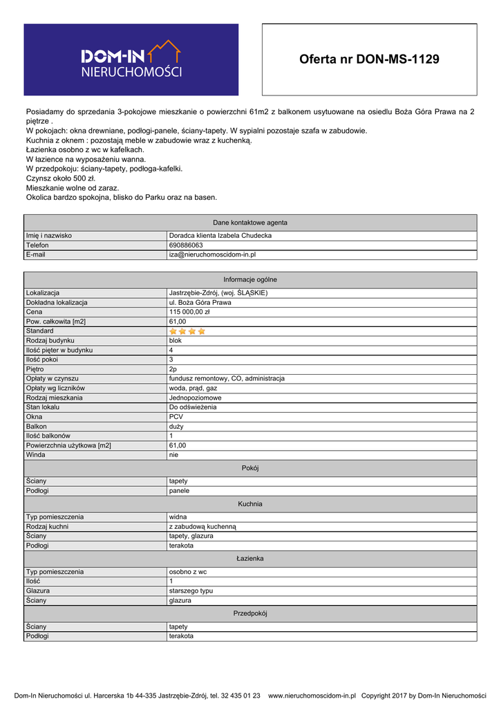 Oferta nr DON-MS-1129 Posiadamy do sprzedania 3-pokojowe mieszkanie o powierzchni 61m2 z balkonem usytuowane na osiedlu Boża Góra Prawa na 2 piętrze . W pokojach: okna drewniane, podłogi-panele, ściany-tapety. W sypialni pozostaje szafa w zabudowie. Kuchnia z oknem : pozostają meble w zabudowie wraz z kuchenką. Łazienka osobno z wc w kafelkach. W łazience na wyposażeniu wanna. W przedpokoju: ściany-tapety, podłoga-kafelki. Czynsz około 500 zł. Mieszkanie wolne od zaraz. Okolica bardzo spokojna, blisko do Parku oraz na basen. Dane kontaktowe agenta Imię i nazwisko Telefon E-mail Doradca klienta Izabela Chudecka 690886063 [email protected] Informacje ogólne Lokalizacja Dokładna lokalizacja Cena Pow. całkowita [m2] Standard Rodzaj budynku Ilość pięter w budynku Ilość pokoi Piętro Opłaty w czynszu Opłaty wg liczników Rodzaj mieszkania Stan lokalu Okna Balkon Ilość balkonów Powierzchnia użytkowa [m2] Winda Jastrzębie-Zdrój, (woj. ŚLĄSKIE) ul. Boża Góra Prawa 115 000,00 zł 61,00 blok 4 3 2p fundusz remontowy, CO, administracja woda, prąd, gaz Jednopoziomowe Do odświeżenia PCV duży 1 61,00 nie Pokój Ściany Podłogi tapety panele Kuchnia Typ pomieszczenia Rodzaj kuchni Ściany Podłogi widna z zabudową kuchenną tapety, glazura terakota Łazienka Typ pomieszczenia Ilość Glazura Ściany osobno z wc 1 starszego typu glazura Ściany Podłogi tapety terakota Przedpokój Dom-In Nieruchomości ul. Harcerska 1b 44-335 Jastrzębie-Zdrój, tel. 32 435 01 23 www.nieruchomoscidom-in.pl Copyright 2017 by Dom-In Nieruchomości