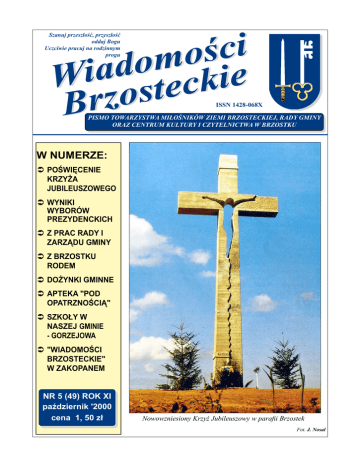 i c ś o m o d a Wi steckie o z r B Szanuj przeszłość, przyszłość oddaj Bogu Uczciwie pracuj na rodzinnym progu ISSN 1428-068X PISMO TOWARZYSTWA MIŁOŚNIKÓW ZIEMI BRZOSTECKIEJ, RADY GMINY ORAZ CENTRUM KULTURY I CZYTELNICTWA W BRZOSTKU W NUMERZE: poświęcenie krzyża jubileuszowego wyniki wyborów prezydenckich z prac rady i zarządu gminy z brzostku rodem DOŻYNKI GMINNE apteka "pod opatrznością" szkoły w naszej gminie - gorzejowa "WIADOMOŚCI BRZOSTECKIE" W ZAKOPANEM NR 5 (49) ROK XI październik '2000 cena 1, 50 zł Nowowzniesiony Krzyż Jubileuszowy w parafii Brzostek Fot. J. Nosal 2 WIADOMOŚCI BRZOSTECKIE Poświęcenie Krzyża Jubileuszowego 14 września w Święto Podwyższenia Krzyża Świętego, które zarazem jest odpustem parafialnym w Brzostku, ks. dziekan Emil Midura poświęcił nowowzniesiony Krzyż Jubileuszowy. Uroczystość ta, połączona z intronizacją Obrazu Bożego Miłosierdzia w parafii, zgromadziła na brzosteckim wzgórzu liczną rzeszę wiernych. K rzyż Jubileuszowy przedstawia dwoistą naturę Chrystusa: Boską - symbolizowaną przez powierzchnię gładką oraz ludzką - symbolizowaną przez powierzchnię chropowatą (fot. na 1 str.). Ma 10 m wysokości i 4 m rozpiętości ramion. Z okazji zakończenia głównego etapu budowy, Komitet Budowy Krzyża Jubileuszowego składa serdeczne podziękowania wszystkim tym, którzy przez swoją pracę, kupno cegiełek lub dary finansowe składane w innej formie, stworzyli materialną podstawę realizacji tego wielkiego zadania. W ostatnim etapie budowy, dzięki dużemu darowi pieniężnemu, Komitet posiadał swobodę działania i mógł sfinansować wykonanie prac wykończeniowych zgodnie z opracowanym wcześniej projektem plastycznym. Darczyńcami znacznej kwoty okazali się Państwo Lucille i Lawrence Kory ze Stanów Zjednoczonych. Rodzice Pana Lawrenca wyemigrowali z Polski w 1915 roku. Trzech ich synów brało udział w II wojnie światowej. Pani Lucilla Kory ma pochodzenie polsko-niemieckie. Państwo Kory, dzięki Pani Barbarze Szybist, dowiedzieli się o naszym milenijnym przedsięwzięciu i poczytali sobie za zaszczyt możliwość uczestniczenia w kosztach budowy Krzyża Jubileuszowego w Brzostku, wyrażając w ten sposób swoje przywiązanie do tradycji dawnej Ojczyzny. Parafialny Komitet Budowy Krzyża Jubileuszowego ma nadzieję, że Milenijny Krzyż na długie lata pozostanie pamiątką naszej wspólnej pracy i wyrazem nadziei na lepszą przyszłość w nowym tysiącleciu. 100 lat Krzyża na Giewoncie P odczas wędrówki po górach jeden z przewodników opowiadał zebra nym dziennikarzom prasy lokalnej o przypadającej w przyszłym roku 100 rocznicy budowy Krzyża na Giewoncie. Ówcześni mieszkańcy Tatr w obawie przed nieznanym, nowym wiekiem wznieśli ofiarny krzyż na najwyższym z otaczających ich szczytów. Całą metalową konstrukcję wraz z mocującymi śrubami wynieśli górale na własnych plecach. Wiara ich była mocna a praca solidna i Krzyż do dzisiejszego dnia góruje nad Zakopanem. Jest on również głównym symbolem w nowym herbie tego miasta Wracając w nasze strony. Czy wybudowany wspólnym wysiłkiem parafian brzostecki Krzyż Jubileuszowy przetrwa do następnego wieku? WIADOMOŚCI BRZOSTECKIE 18 sierpnia br. w Gminnym Domu Kultury odbyła się XXI Sesja Rady Gminy w Brzostku. Obradom przewodniczyła Przewodnicząca Rady Gminy Urszula Wojnarowska. Po stwierdzeniu prawomocności obrad i przyjęciu porządku obrad Przewodniczący Zarządu Leszek Bieniek złożył informację z działalności Zarządu w okresie między sesjami. W kolejnym punkcie Skarbnik Gminy Elżbieta Łukasik przedstawiła informację Zarządu Gminy z przebiegu wykonania budżetu gminy za pierwsze półrocze 2000 roku. Rada Gminy podjęła uchwałę w sprawie zmiany uchwały budżetowej na 2000 rok Nr XVI/149/2000 z dnia 28.01.2000 r. Zmiany w budżecie dotyczyły zwiększenia środków na drogi publiczne gminne oraz na budowę chodników w Kamienicy Dolnej i Zawadce Brzosteckiej. Na wniosek mieszkańców, podjęto dyskusję w sprawie przyłączenia do sołectwa Brzostek przysiółków "Rola" i Ćwierci" należących do sołectwa Nawsie Brzosteckie. Kierując się zasadą przestrzegania samorządności oraz prawa mieszkańców do samostanowienia Rada Gminy podjęła uchwałę intencyjną o przystąpieniu do prac przygotowawczych związanych z przyłączeniem w/w przysiółków do sołectwa Brzostek. Rada Gminy wyraziła zgodę na zawarcie porozumienia pomiędzy Gminą Brzostek a Powiatem Dębickim w sprawie współfinansowania Ośrodka Wczesnej Terapii i Rehabilitacji Dzieci w Dębicy, z którego korzystają również dzieci z naszej gminy. Ponadto Rada Gminy podjęła uchwały w sprawie: – nabycia działek nr 1186/4 i 1093/3 położonych w Brzostku z przeznaczeniem pod lokalizację dwóch przepompowni ścieków sanitarnych, W okresie od 2 sierpnia do 15 września br. Zarząd Gminy odbył 5 posiedzeń. Głównym ich tematem były następujące sprawy: Przedstawiono regulamin określający wysokość oraz szczegółowe warunki przyznawania nauczycielom dodatków motywacyjnego, funkcyjnego i za warunki pracy oraz niektóre inne składniki wynagrodzenia, a także wysokość oraz szczegółowe zasady przyznawania dodatku mieszkaniowego. Przyjęty przez Zarząd regulamin przedłożono związkom zawodowym do uzgodnienia a następnie w formie projektu uchwały zostanie skierowany pod obrady najbliższej sesji. Omówiono i przyjęto informację z przebiegu wykonania budżetu gminy za I półrocze 2000 roku. W informacji uwzględniono zmiany budżetu w ciągu I półrocza oraz zwrócono uwagę na stronę dochodową budżetu, a zwłaszcza brak spływu dochodów z tytułu podatku od nieruchomości od osób prawnych, udziału w podatku dochodowym od osób fizycznych oraz braku sprzedaży mienia komunalnego. Przedstawiono informację na temat ściągalności zaległości podatkowych. Wykonanie budżetu gminy za I półr