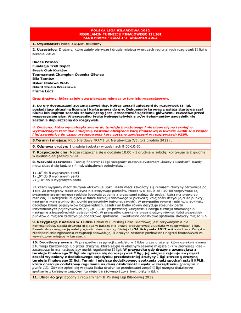 POLSKA LIGA BILARDOWA 2012 REGULAMIN TURNIEJU