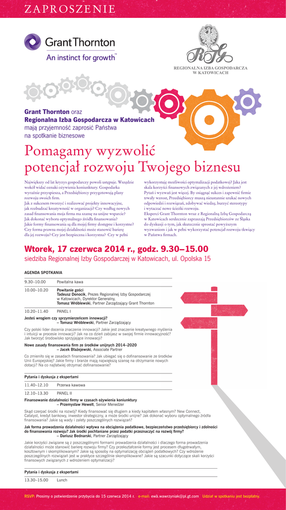 ZAPROSZENIE Grant Thornton oraz Regionalna Izba Gospodarcza w Katowicach mają przyjemność zaprosić Państwa na spotkanie biznesowe Pomagamy wyzwolić potencjał rozwoju Twojego biznesu Największy od lat kryzys gospodarczy powoli ustępuje. Wszędzie wokół widać oznaki ożywienia koniunktury. Gospodarka wyraźnie przyspiesza, a Przedsiębiorcy przygotowują plany rozwoju swoich firm. Jak z sukcesem tworzyć i realizować projekty innowacyjne, jak rozbudzać kreatywność w organizacji? Czy według nowych zasad finansowania moja firma ma szansę na unijne wsparcie? Jak dokonać wyboru optymalnego źródła finansowania? Jakie formy finansowania są dla mojej firmy dostępne i korzystne? Czy forma prawna mojej działalności może stanowić barierę dla jej rozwoju? Czy jest bezpieczna i korzystna? Czy w pełni wykorzystuję możliwości optymalizacji podatkowej? Jaka jest skala korzyści finansowych związanych z jej wdrożeniem? Pytań i wyzwań jest więcej. By osiągnąć sukces i zapewnić firmie trwały wzrost, Przedsiębiorcy muszą nieustannie szukać nowych odpowiedzi i rozwiązań, zdobywać wiedzę, burzyć stereotypy i wytaczać nowe ścieżki rozwoju. Eksperci Grant Thornton wraz z Regionalną Izbą Gospodarczą w Katowicach serdecznie zapraszają Przedsiębiorców ze Śląska do dyskusji o tym, jak skutecznie sprostać powyższym wyzwaniom i jak w pełni wykorzystać potencjał rozwoju tkwiący w Państwa firmach. Wtorek, 17 czerwca 2014 r., godz. 9.30–15.00 siedziba Regionalnej Izby Gospodarczej w Katowicach, ul. Opolska 15 AGENDA SPOTKANIA 9.30–10.00 Powitalna kawa 10.00–10.20 owitanie gości P Tadeusz Donocik, Prezes Regionalnej Izby Gospodarczej w Katowicach, Dyrektor Generalny, Tomasz Wróblewski, Partner Zarządzający Grant Thornton 10.20–11.40PANEL I Jesteś wrogiem czy sprzymierzeńcem innowacji? – Tomasz Wróblewski, Partner Zarządzający Czy polski lider docenia znaczenie innowacji? Jakie jest znaczenie kreatywnego myślenia i intuicji w procesie innowacji? Jak na co dzień zabijasz w swojej firmie innowacyjność? Jak tworzyć środowisko sprzyjające innowacji? Nowe zasady finansowania firm ze środków unijnych 2014–2020 – Jacek Błażejewski, Associate Partner Co zmieniło się w zasadach finansowania? Jak ubiegać się o dofinansowanie ze środków Unii Europejskiej? Jakie firmy i branże mają największą szansę na otrzymanie nowych dotacji? Na co najłatwiej otrzymać dofinansowanie? Pytania i dyskusja z ekspertami 11.40–12.10 Przerwa kawowa 12.10–13.30 PANEL II Finansowanie działalności firmy w czasach ożywienia koniunktury – Przemysław Hewelt, Senior Menedżer Skąd czerpać środki na rozwój? Kiedy finansować się długiem a kiedy kapitałem własnym? New Connect, Catalyst, kredyt bankowy, inwestor strategiczny, a może środki unijne? Jak dokonać wyboru optymalnego źródła finansowania? Jakie są wady i zalety poszczególnych rozwiązań? Jak forma prowadzenia działalności wpływa na obciążenia podatkowe, bezpieczeństwo przedsiębiorcy i zdolności do finansowania rozwoju? Jak środki pochłaniane przez podatki przeznaczyć na rozwój firmy? – Dariusz Bednarski, Partner Zarządzający Jakie korzyści związane są z poszczególnymi formami prowadzenia działalności i dlaczego forma prowadzenia działalności może stanowić barierę rozwoju firmy? Czy przekształcenie formy jest procesem długotrwałym, kosztownym i skomplikowanym? Jakie są sposoby na optymalizację obciążeń podatkowych? Czy wdrożenie poszczególnych rozwiązań jest w praktyce szczególnie skomplikowane? Jakie są szacunki dotyczące skali korzyści finansowych związanych z wdrożeniem optymalizacji? Pytania i dyskusja z ekspertami 13.30–15.00 Lunch RSVP: Prosimy o potwierdzenie przybycia do 15 czerwca 2014 r. e-mail: [email protected] Udział w spotkaniu jest bezpłatny.