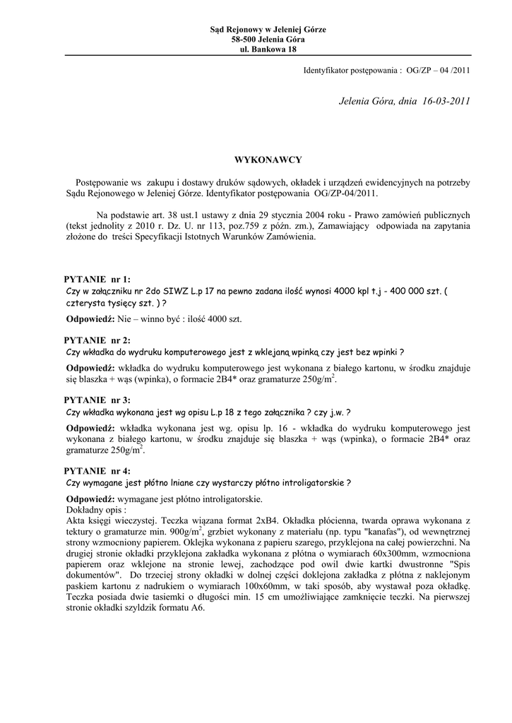 Sąd Rejonowy w Jeleniej Górze 58-500 Jelenia Góra ul. Bankowa 18 Identyfikator postępowania : OG/ZP – 04 /2011 Jelenia Góra, dnia 16-03-2011 WYKONAWCY Postępowanie ws zakupu i dostawy druków sądowych, okładek i urządzeń ewidencyjnych na potrzeby Sądu Rejonowego w Jeleniej Górze. Identyfikator postępowania OG/ZP-04/2011. Na podstawie art. 38 ust.1 ustawy z dnia 29 stycznia 2004 roku - Prawo zamówień publicznych (tekst jednolity z 2010 r. Dz. U. nr 113, poz.759 z późn. zm.), Zamawiający odpowiada na zapytania złożone do treści Specyfikacji Istotnych Warunków Zamówienia. PYTANIE nr 1: Czy w załączniku nr 2do SIWZ L.p 17 na pewno zadana ilość wynosi 4000 kpl t.j - 400 000 szt. ( czterysta tysięcy szt. ) ? Odpowiedź: Nie – winno być : ilość 4000 szt. PYTANIE nr 2: Czy wkładka do wydruku komputerowego jest z wklejaną wpinką czy jest bez wpinki ? Odpowiedź: wkładka do wydruku komputerowego jest wykonana z białego kartonu, w środku znajduje się blaszka + wąs (wpinka), o formacie 2B4* oraz gramaturze 250g/m2. PYTANIE nr 3: Czy wkładka wykonana jest wg opisu L.p 18 z tego załącznika ? czy j.w. ? Odpowiedź: wkładka wykonana jest wg. opisu lp. 16 - wkładka do wydruku komputerowego jest wykonana z białego kartonu, w środku znajduje się blaszka + wąs (wpinka), o formacie 2B4* oraz gramaturze 250g/m2. PYTANIE nr 4: Czy wymagane jest płótno lniane czy wystarczy płótno introligatorskie ? Odpowiedź: wymagane jest płótno introligatorskie. Dokładny opis : Akta księgi wieczystej. Teczka wiązana format 2xB4. Okładka płócienna, twarda oprawa wykonana z tektury o gramaturze min. 900g/m2, grzbiet wykonany z materiału (np. typu "kanafas"), od wewnętrznej strony wzmocniony papierem. Oklejka wykonana z papieru szarego, przyklejona na całej powierzchni. Na drugiej stronie okładki przyklejona zakładka wykonana z płótna o wymiarach 60x300mm, wzmocniona papierem oraz wklejone na stronie lewej, zachodzące pod owil dwie kartki dwustronne "Spis dokumentów". Do trzeciej strony okładki w dolnej części doklejona zakładka z płótna z naklejonym paskiem kartonu z nadrukiem o wymiarach 100x60mm, w taki sposób, aby wystawał poza okładkę. Teczka posiada dwie tasiemki o długości min. 15 cm umożliwiające zamknięcie teczki. Na pierwszej stronie okładki szyldzik formatu A6. Zamawiający dokonuje w trybie art. 38 ust. 4 ustawy Prawo zamówień publicznych modyfikacji w załączniku nr 2 do SIWZ - „Zestawienie asortymentowe druków sądowych” poprzez jego poprawienie zgodnie z poniższym brzmieniem: Określenie przedmiotu zamówienia format gramatura papieru Akta i dokumenty księgi wieczystej teczka z wkładką do wydruku 17 komputerowego (płótno introligatorskie lniane) 2B4* 900g/m2 Lp. J.m. Ilość szt. 4000 Cena jednostk owa netto Wartość netto (kol. 6 x 7) Stawka VAT% Wartość brutto (kol. 8 x 9) Ogłoszenie o zmianach w załączniku nr 2 do SIWZ zostało zamieszczone na stronie internetowej http://www.jelenia-gora.so.gov.pl/index.php?id_jednostki=7 oraz umieszczone na tablicy ogłoszeń w siedzibie zamawiającego przy ul. Bankowej nr 18 w Jeleniej Górze. Na stronie internetowej umieszczono do wypełnienia zmodyfikowany załącznik nr 2 do SIWZ. Podpisał: Katarzyna Michalska-Bochynek Kierownik Finansowy Sądu Rejonowego W Jeleniej Górze 2