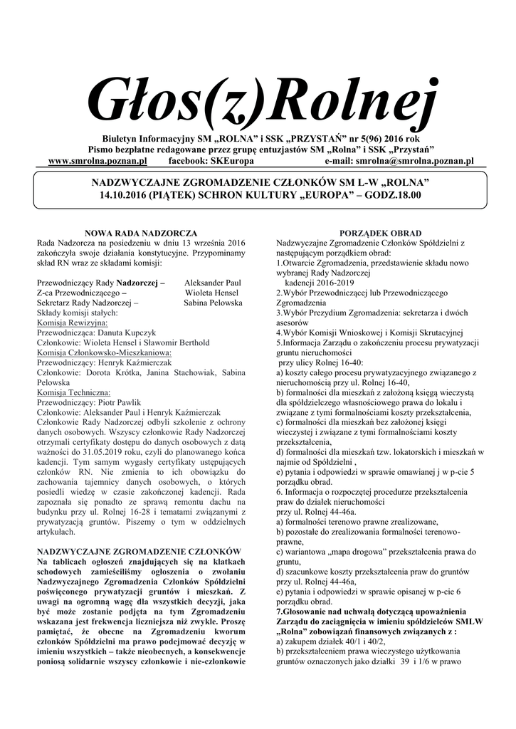 Głos(z)Rolnej Biuletyn Informacyjny SM „ROLNA” i SSK „PRZYSTAŃ” nr 5(96) 2016 rok Pismo bezpłatne redagowane przez grupę entuzjastów SM „Rolna” i SSK „Przystań” www.smrolna.poznan.pl facebook: SKEuropa e-mail: [email protected] NADZWYCZAJNE ZGROMADZENIE CZŁONKÓW SM L-W „ROLNA” SM L-W „Rolna”. Aby zapoznać się z porządkiem 14.10.2016 (PIĄTEK) SCHRON KULTURY „EUROPA” – lepiej GODZ.18.00 obrad przypominamy jego treść: NOWA RADA NADZORCZA Rada Nadzorcza na posiedzeniu w dniu 13 września 2016 zakończyła swoje działania konstytucyjne. Przypominamy skład RN wraz ze składami komisji: Przewodniczący Rady Nadzorczej – Aleksander Paul Z-ca Przewodniczącego – Wioleta Hensel Sekretarz Rady Nadzorczej – Sabina Pelowska Składy komisji stałych: Komisja Rewizyjna: Przewodnicząca: Danuta Kupczyk Członkowie: Wioleta Hensel i Sławomir Berthold Komisja Członkowsko-Mieszkaniowa: Przewodniczący: Henryk Kaźmierczak Członkowie: Dorota Krótka, Janina Stachowiak, Sabina Pelowska Komisja Techniczna: Przewodniczący: Piotr Pawlik Członkowie: Aleksander Paul i Henryk Kaźmierczak Członkowie Rady Nadzorczej odbyli szkolenie z ochrony danych osobowych. Wszyscy członkowie Rady Nadzorczej otrzymali certyfikaty dostępu do danych osobowych z datą ważności do 31.05.2019 roku, czyli do planowanego końca kadencji. Tym samym wygasły certyfikaty ustępujących członków RN. Nie zmienia to ich obowiązku do zachowania tajemnicy danych osobowych, o których posiedli wiedzę w czasie zakończonej kadencji. Rada zapoznała się ponadto ze sprawą remontu dachu na budynku przy ul. Rolnej 16-28 i tematami związanymi z prywatyzacją gruntów. Piszemy o tym w oddzielnych artykułach. NADZWYCZAJNE ZGROMADZENIE CZŁONKÓW Na tablicach ogłoszeń znajdujących się na klatkach schodowych zamieściliśmy ogłoszenia o zwołaniu Nadzwyczajnego Zgromadzenia Członków Spółdzielni poświęconego prywatyzacji gruntów i mieszkań. Z uwagi na ogromną wagę dla wszystkich decyzji, jaka być może zostanie podjęta na tym Zgromadzeniu wskazana jest frekwencja liczniejsza niż zwykle. Proszę pamiętać, że obecne na Zgromadzeniu kworum członków Spółdzielni ma prawo podejmować decyzję w imieniu wszystkich – także nieobecnych, a konsekwencje poniosą solidarnie wszyscy członkowie i nie-czlonkowie PORZĄDEK OBRAD Nadzwyczajne Zgromadzenie Członków Spółdzielni z następującym porządkiem obrad: 1.Otwarcie Zgromadzenia, przedstawienie składu nowo wybranej Rady Nadzorczej kadencji 2016-2019 2.Wybór Przewodniczącej lub Przewodniczącego Zgromadzenia 3.Wybór Prezydium Zgromadzenia: sekretarza i dwóch asesorów 4.Wybór Komisji Wnioskowej i Komisji Skrutacyjnej 5.Informacja Zarządu o zakończeniu procesu prywatyzacji gruntu nieruchomości przy ulicy Rolnej 16-40: a) koszty całego procesu prywatyzacyjnego związanego z nieruchomością przy ul. Rolnej 16-40, b) formalności dla mieszkań z założoną księgą wieczystą dla spółdzielczego własnościowego prawa do lokalu i związane z tymi formalnościami koszty przekształcenia, c) formalności dla mieszkań bez założonej księgi wieczystej i związane z tymi formalnościami koszty przekształcenia, d) formalności dla mieszkań tzw. lokatorskich i mieszkań w najmie od Spółdzielni , e) pytania i odpowiedzi w sprawie omawianej j w p-cie 5 porządku obrad. 6. Informacja o rozpoczętej procedurze przekształcenia praw do działek nieruchomości przy ul. Rolnej 44-46a. a) formalności terenowo prawne zrealizowane, b) pozostałe do zrealizowania formalności terenowoprawne, c) wariantowa „mapa drogowa” przekształcenia prawa do gruntu, d) szacunkowe koszty przekształcenia praw do gruntów przy ul. Rolnej 44-46a, e) pytania i odpowiedzi w sprawie opisanej w p-cie 6 porządku obrad. 7.Głosowanie nad uchwałą dotyczącą upoważnienia Zarządu do zaciągnięcia w imieniu spółdzielców SMLW „Rolna” zobowiązań finansowych związanych z : a) zakupem działek 40/1 i 40/2, b) przekształceniem prawa wieczystego użytkowania gruntów oznaczonych jako działki 39 i 1/6 w prawo własności. 7. Podsumowanie Zgromadzenia 8.Przyjęcie wniosków złożonych przez uczestników Zgromadzenia. 9.Zakończenie Zgromadzenia Zgromadzenie przyjmie lub nie przyjmie następującą uchwałę Projekt uchwały nr 1/2016 z dnia 14.10.2016 Nadzwyczajnego Zgromadzenia Członków SML-W „Rolna” w Poznaniu w sprawie upoważnienia Zarządu do zaciągnięcia zobowiązań związanych z przekształceniem praw do gruntów nieruchomości przy ul. Rolnej 44-46a. Nadzwyczajne Zgromadzenie Członków Spółdzielni Mieszkaniowej Lokatorsko-Własnościowej „Rolna” w Poznaniu zwanej dalej SM „Rolna” upoważnia Zarząd SM „Rolna” do zaciągnięcia zobowiązań związanych z przekształceniem prawa do gruntów oznaczonych, jako działki geodezyjne nr 39 i 1/6, które aktualnie mają status prawa wieczystego użytkowania gruntów Skarbu Państwa w prawo własności Spółdzielni Mieszkaniowej LokatorskoWłasnościowej „Rolna”, oraz do zaciągnięcia zobowiązania finansowego związanego z nabyciem przez Spółdzielnię działek 40/1 i 40/2, będących własnością Miasta Poznania. Łączna wartość zobowiązania nie powinna przekroczyć 600.000,00 Zł a okres spłaty zobowiązania nie może być dłuższy niż 10 lat. Zgromadzenie Członków SM L-W „Rolna” przyjmuje do akceptującej wiadomości, że zabezpieczeniem operacji przekształcenia i zakupu w/w gruntów będzie hipoteka przymusowa wpisana do ksiąg wieczystych założonych do w/w nieruchomości, a odpowiedzialność za jej spłacenie solidarnie obciąży współwłaścicieli nieruchomości przy ul. Rolnej 44-46a, zgodnie z ustalonym dla nich udziałem w nieruchomości wspólnej. Dodatkowym warunkiem zaciągnięcia zobowiązania jest pisemna zgoda większości zainteresowanych mieszkańców nieruchomości przy ul. Rolnej 44-46a. Szacunkowe koszty prz